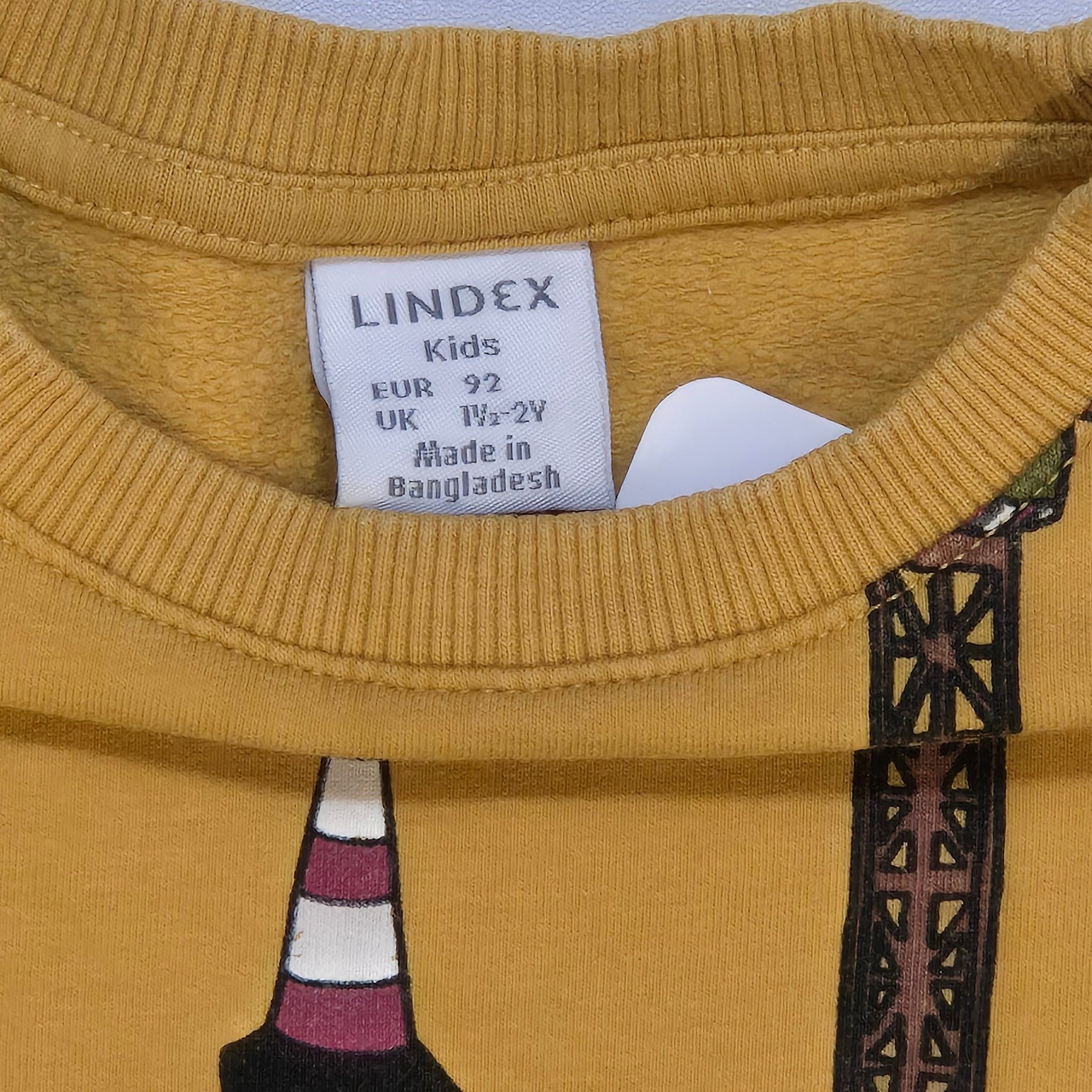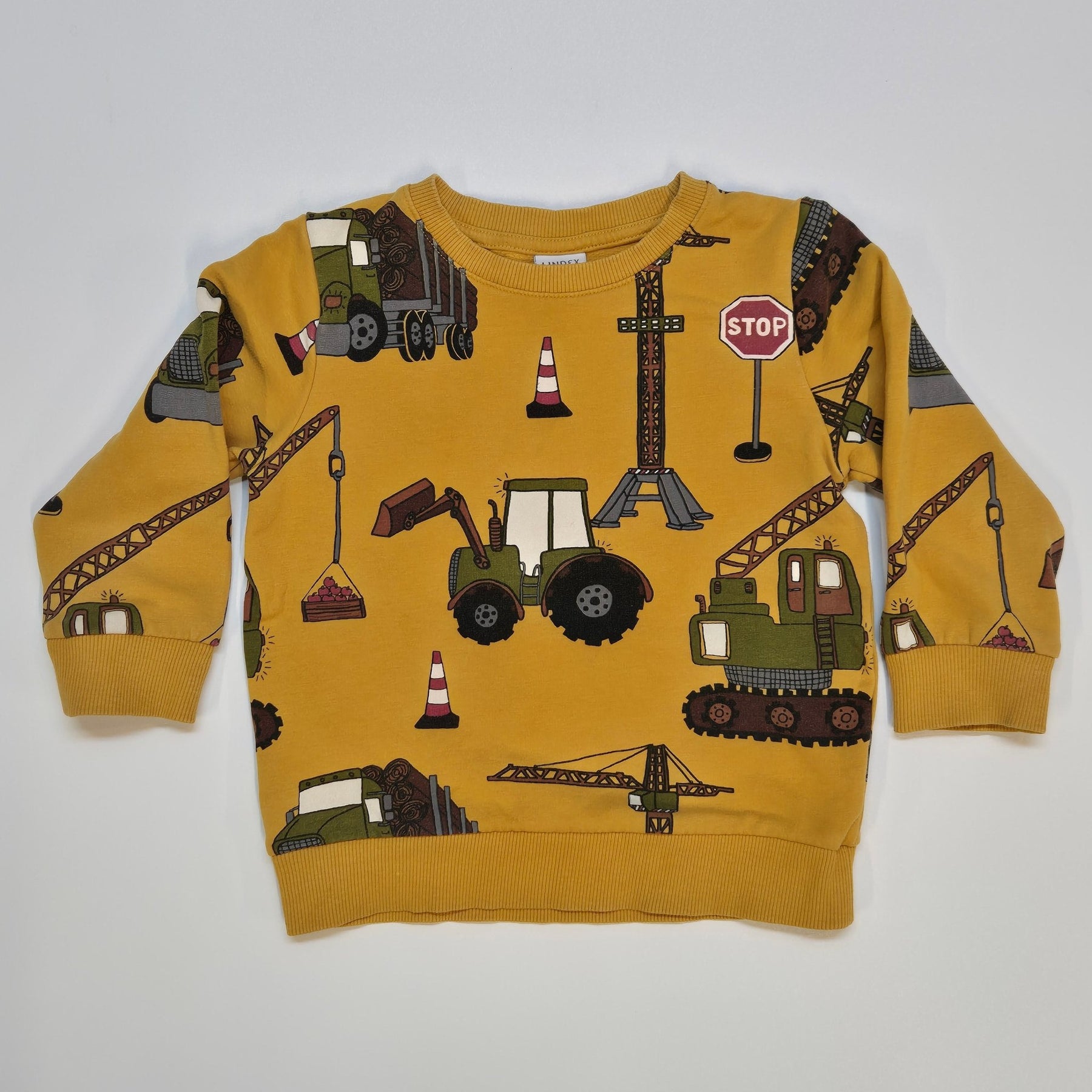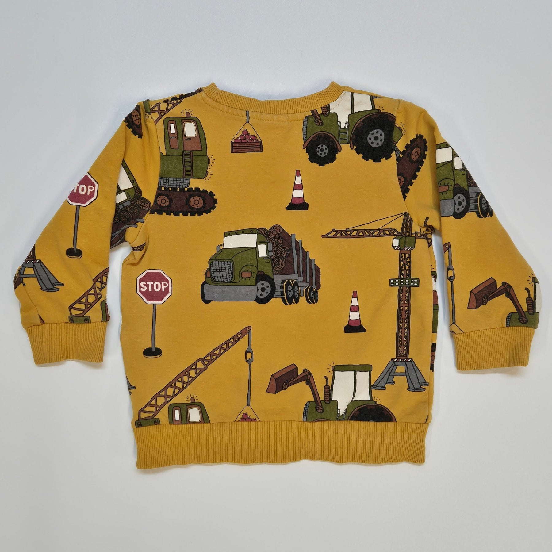 Denna charmiga barntröja pryds av ett färgglatt byggmaskinstema med detaljer som kranar, grävmaskiner och vägmärken. Tröjan är idealisk för vardagsbruk och passar till lekfulla barn som gillar fordon och byggarbetsplatser. Använd men i gott skick.