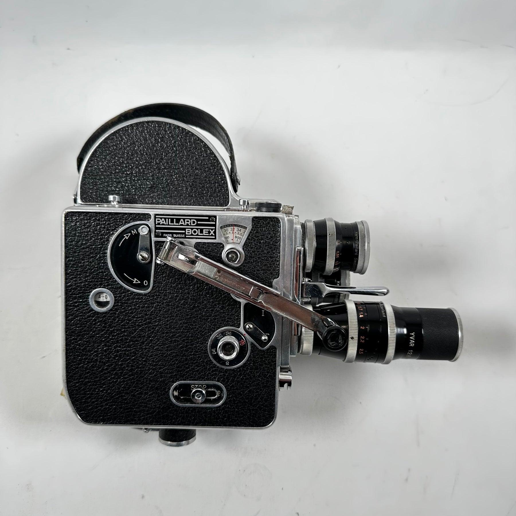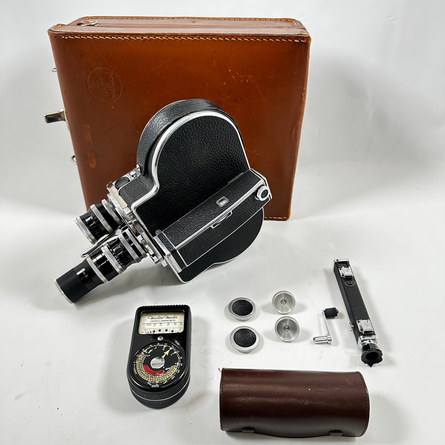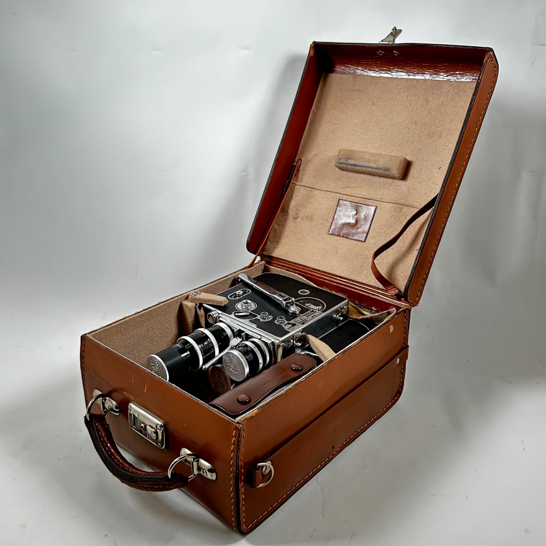 Denna filmkamera är en ikonisk modell som erbjuder en fascinerande inblick i fotograferingens guldålder. Med märkning från Kern Paillard och dess ytterst exakta linsmekanismer, är denna kamera inte bara en kraftfull pjäs, utan också en utsökt konstverk. Dess robusta konstruktion och välvårdade tillbehör såsom objektiv, mätinstrument och transportväska gör den till en idealisk följeslagare för den seriösa filmskaparen eller samlaren. Produkten är begagnad men har bevarats i mycket gott skick, vilket gör den till ett perfekt val för de som uppskattar tidlösa, funktionella artefakter.Produktspecifikationer