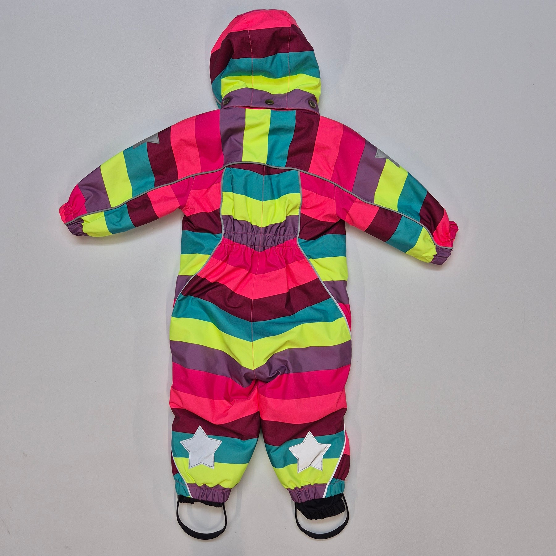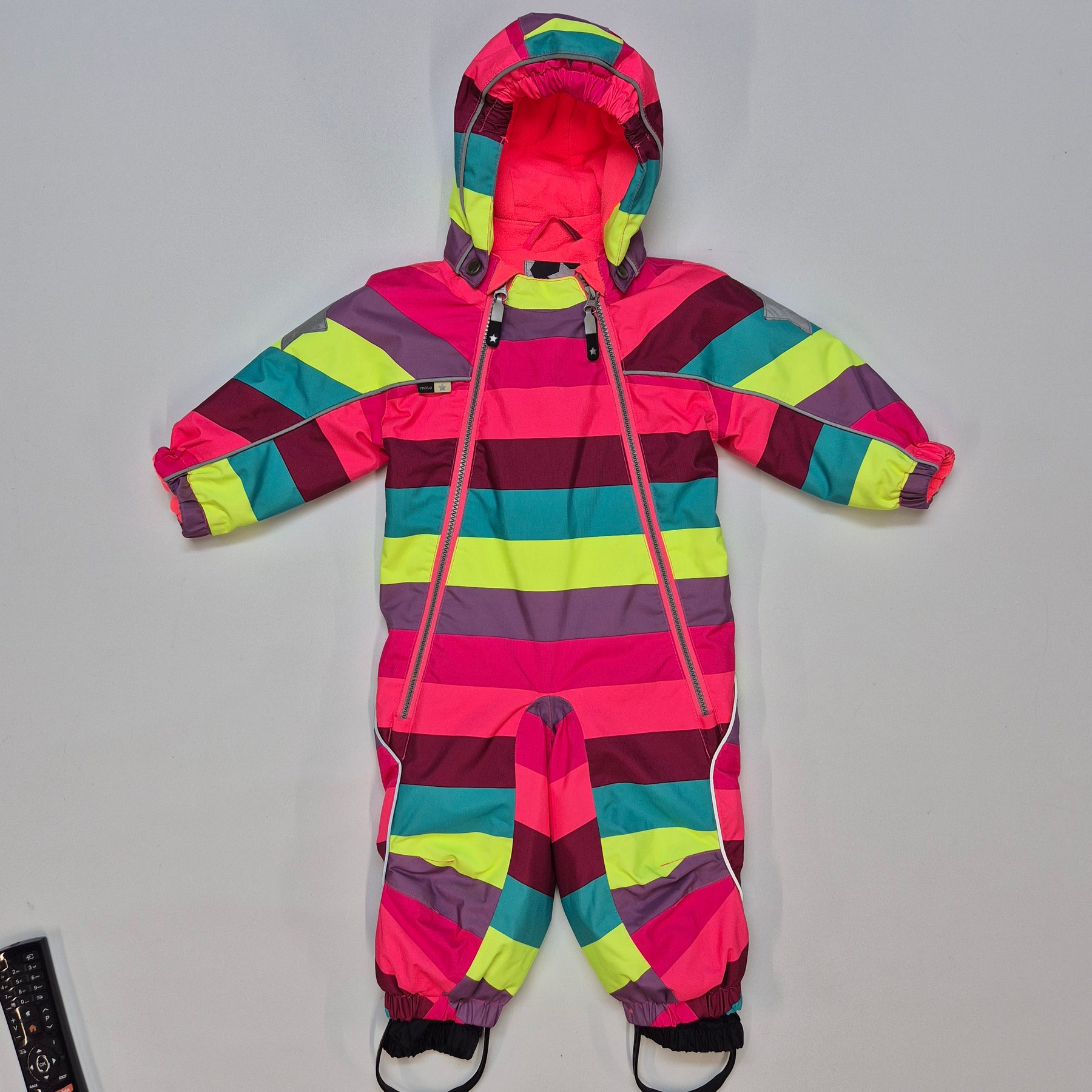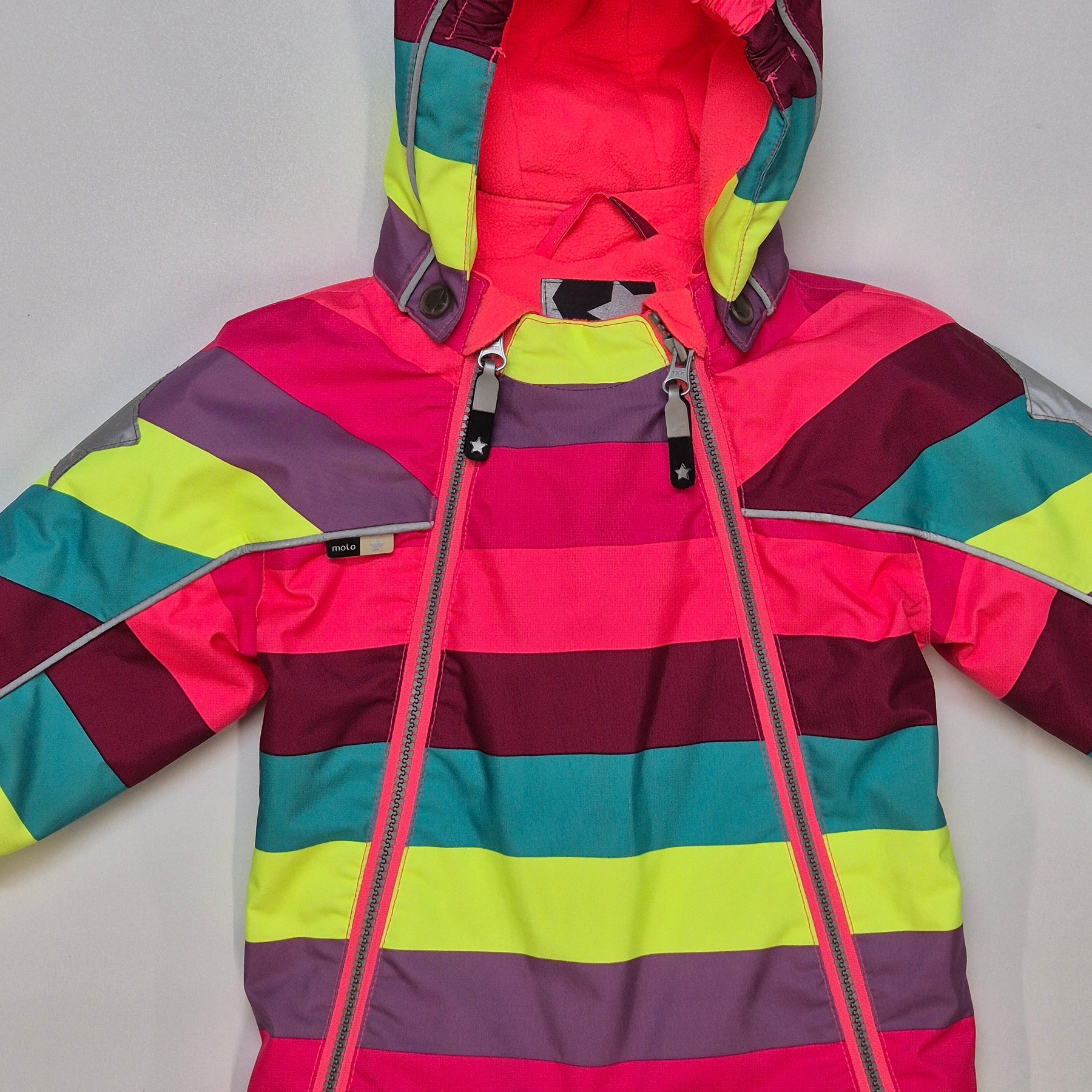 Denna charmiga barnoverall av märket Molo ger en explosiv kombination av färg och stil som lyser upp grå vinterdagar. Overallen har reflekterande detaljer som ökar synligheten och säkerheten i mörkret, samt är vattentät och isolerad för optimal värme och komfort. Den är ideal för aktiva barn som älskar att leka utomhus, oavsett väder. Produkten är begagnad men i utmärkt skick.Produktspecifikationer