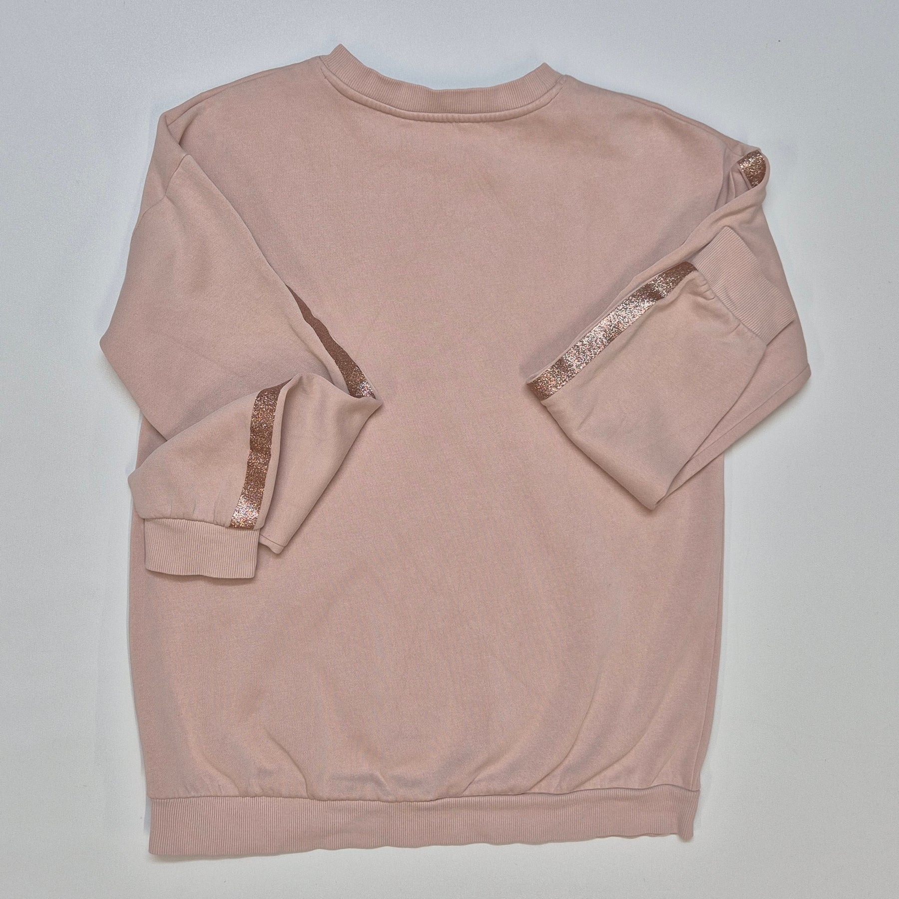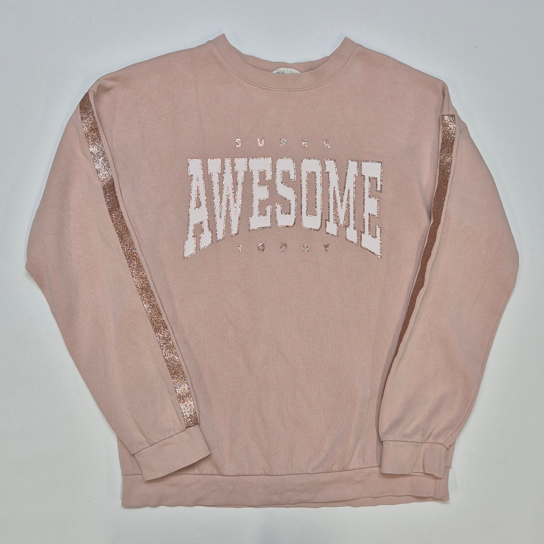 Denna charmiga tröja är framtagen av H&M och är perfekt för både vardagliga och festliga tillfällen. Tröjan är ljusrosa med texten "AWESOME" i silvriga pailletter fram och glittriga detaljer längs ärmsömmarna som tillför en extra glans. Begagnad men i mycket gott skick, den erbjuder både komfort och stil.