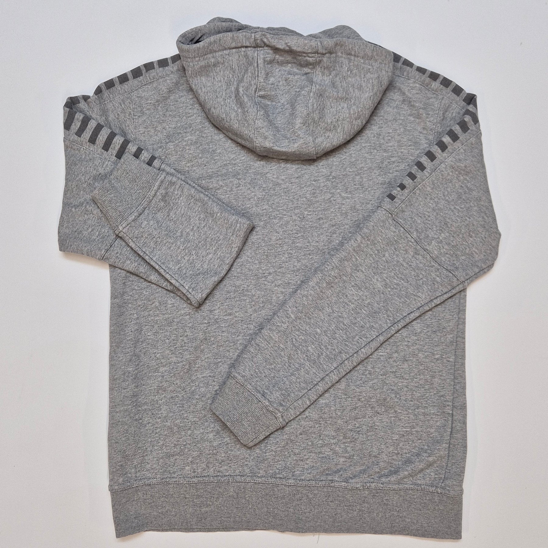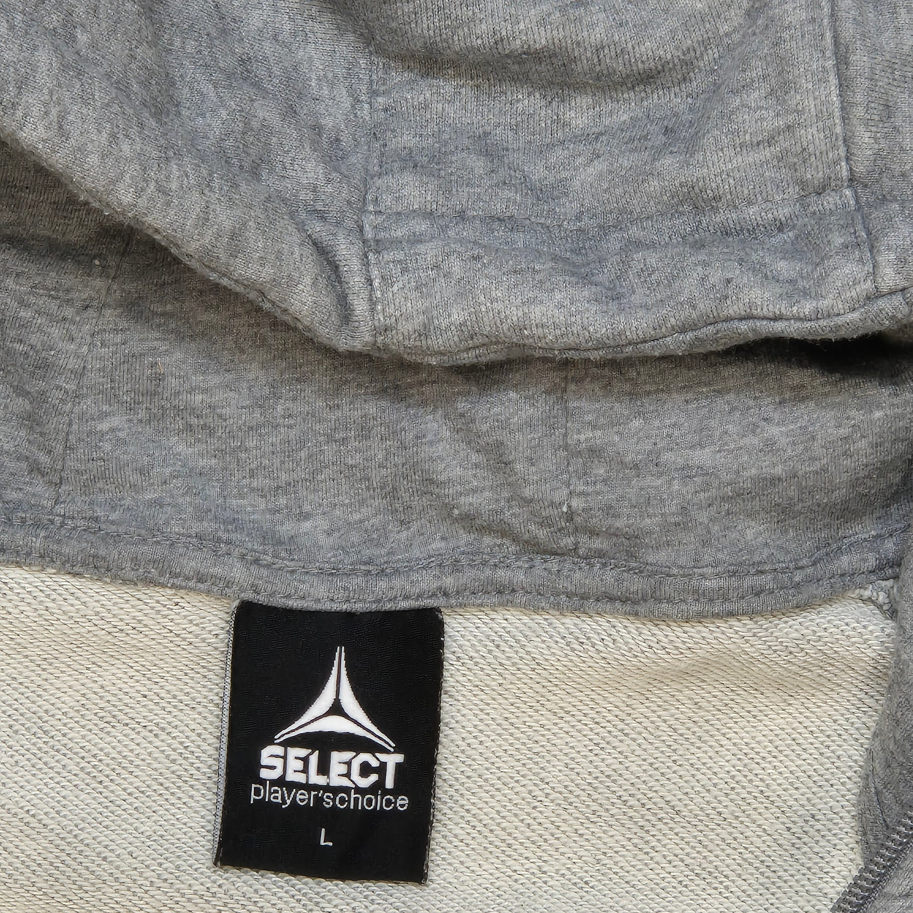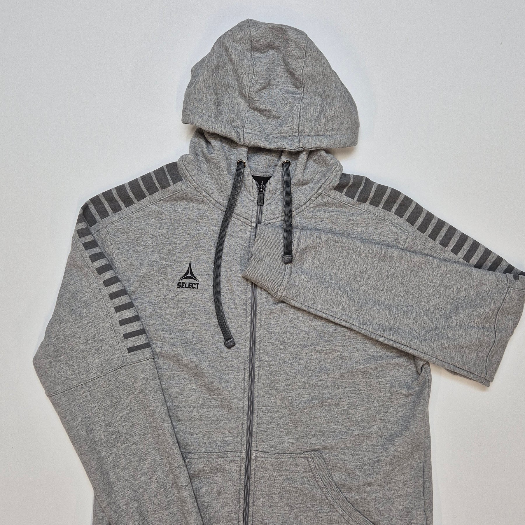Denna huvtröja från välkända SELECT är inte bara skön utan också praktisk med sina välutformade detaljer som blixtlås och sidofickor. Tröjan är tillverkad i en hållbar blandning av material som behåller sin passform och komfort även efter flitigt användande. Heltäckande grått med subtila, sportiga ränder på ärmarna ger en modern touch. Skicket är begagnat men tröjan är mycket välbevarad.