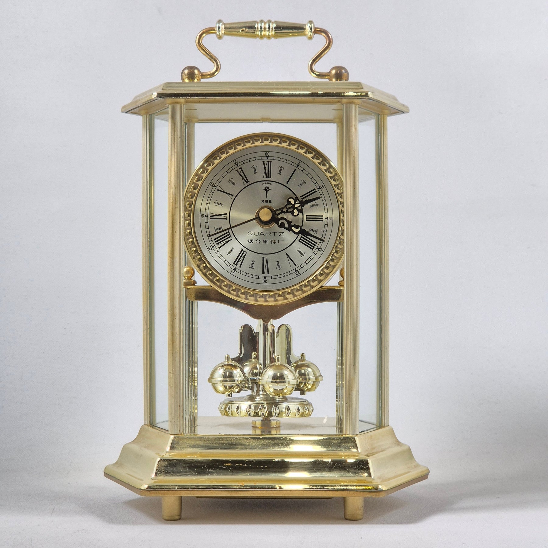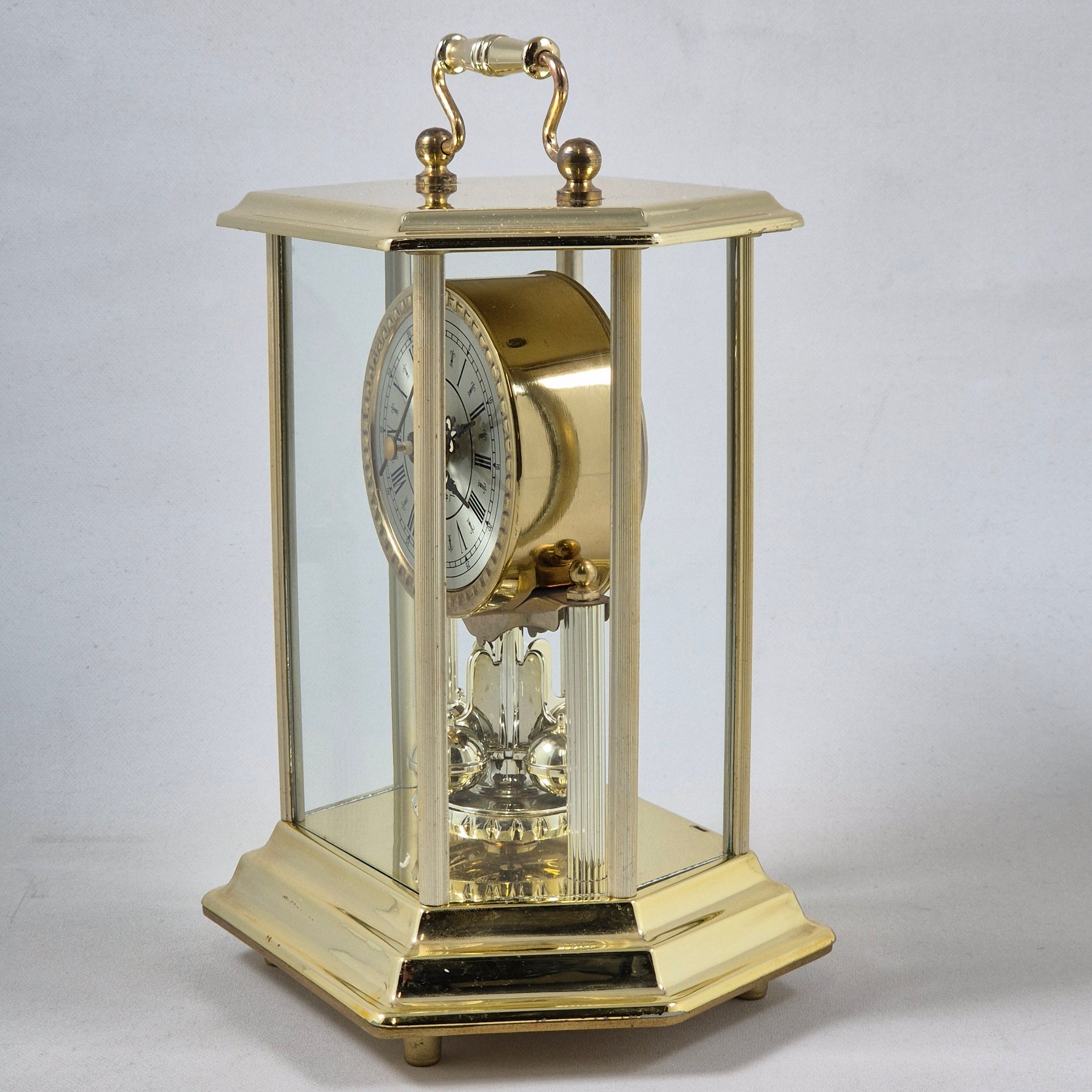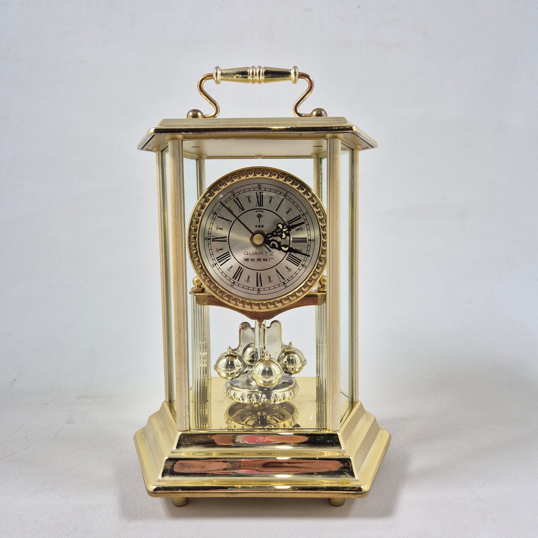 Denna förtrollande karusellklocka är utformad i polerad mässing med genomskinligt glas som omsluter en mekanisk karusell och en kvartsurverk. Klockan är inte bara en funktionell tidsvisare utan också en imponerande dekorationsartikel som ger en nostalgisk känsla. Det är ett idealiskt samlarobjekt eller en utsökt gåva. Produkten är begagnad men har bibehållit ett mycket gott skick, med alla funktioner i fullt arbetsförfarande.