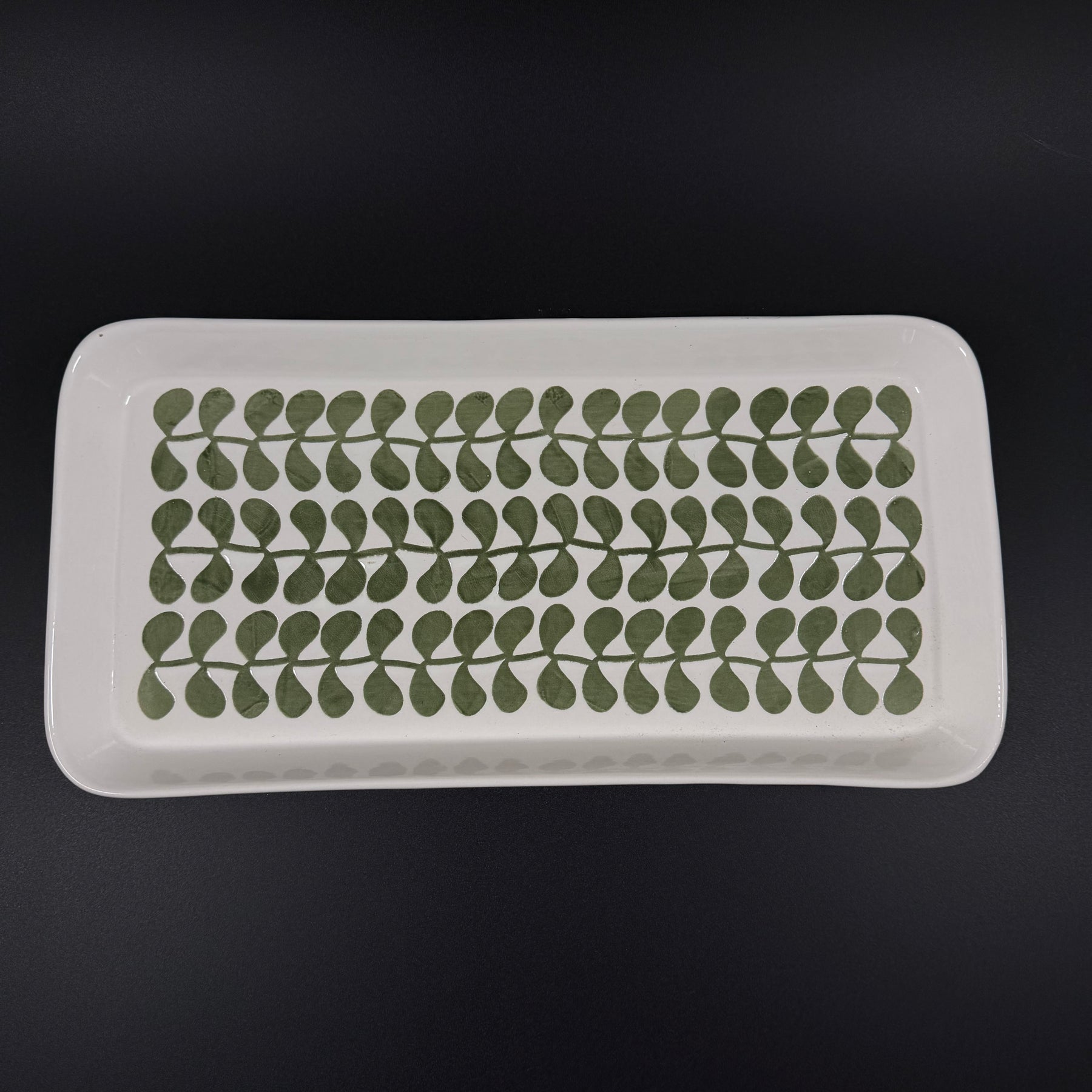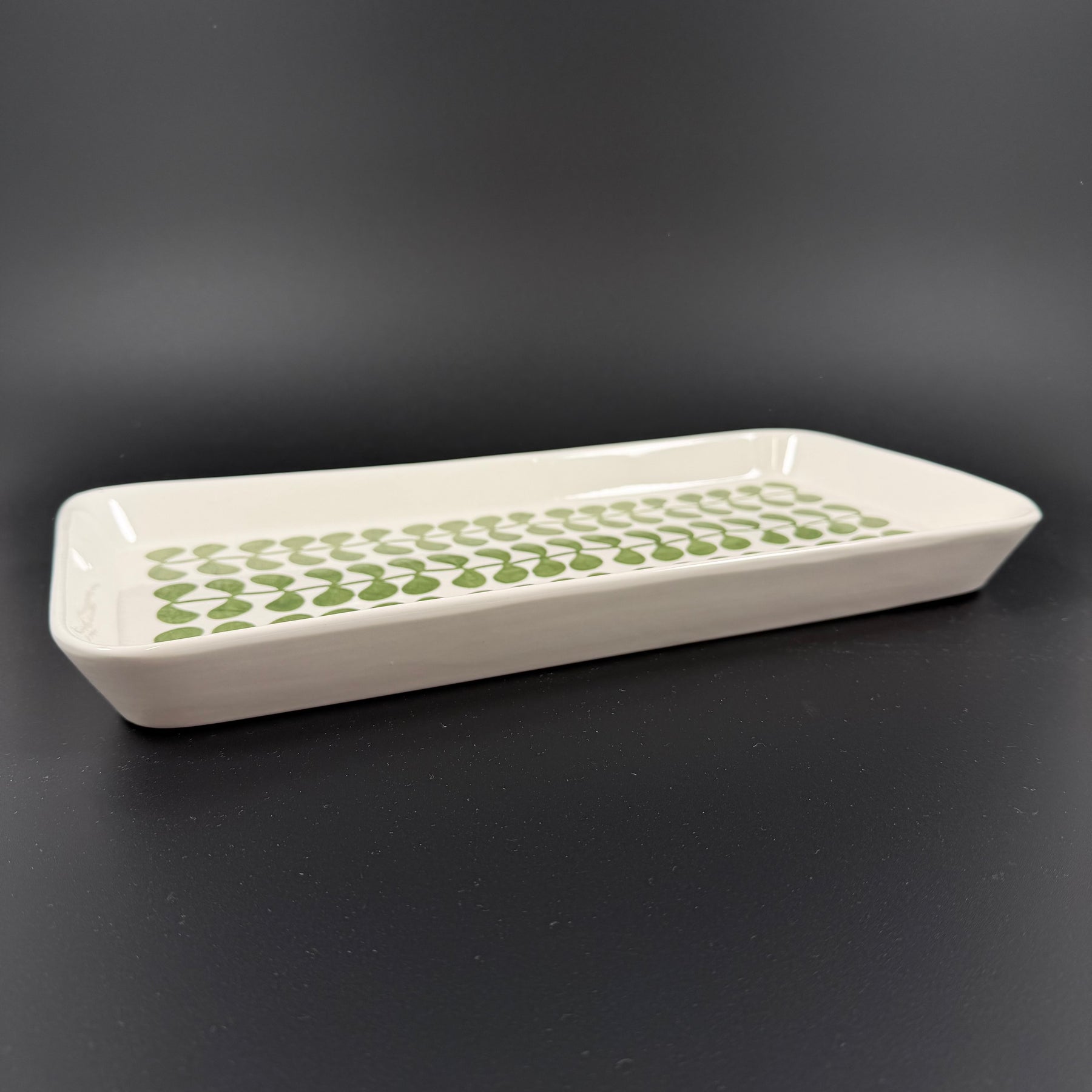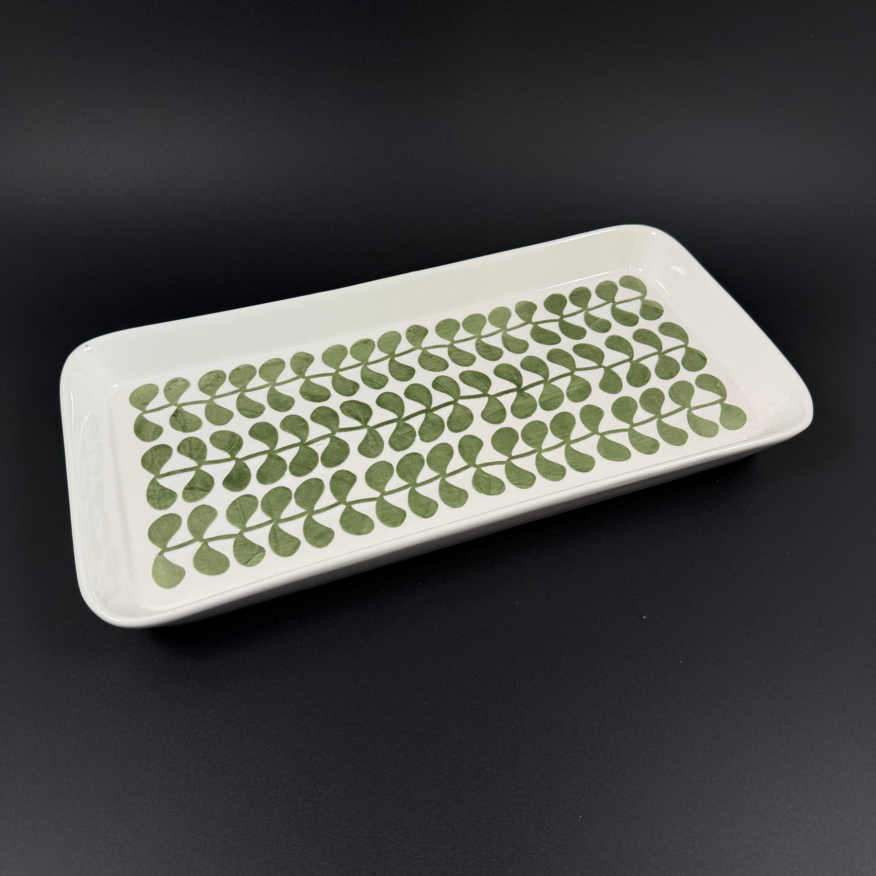 Denna distinkta serveringsfat är inte bara ett praktiskt tillskott till ditt kök, utan även ett verkligt blickfång med sin minimalistiska vita grund och ornamenterade gröna mönster. Designad av Linda Svensson, erbjuder fatet både stil och funktionalitet. Perfekt både för daglig användning och för speciella tillställningar. Produkten är begagnad men har bevarats i mycket gott skick, vilket gör det till ett utmärkt val för den som värdesätter kvalitet och hållbarhet.