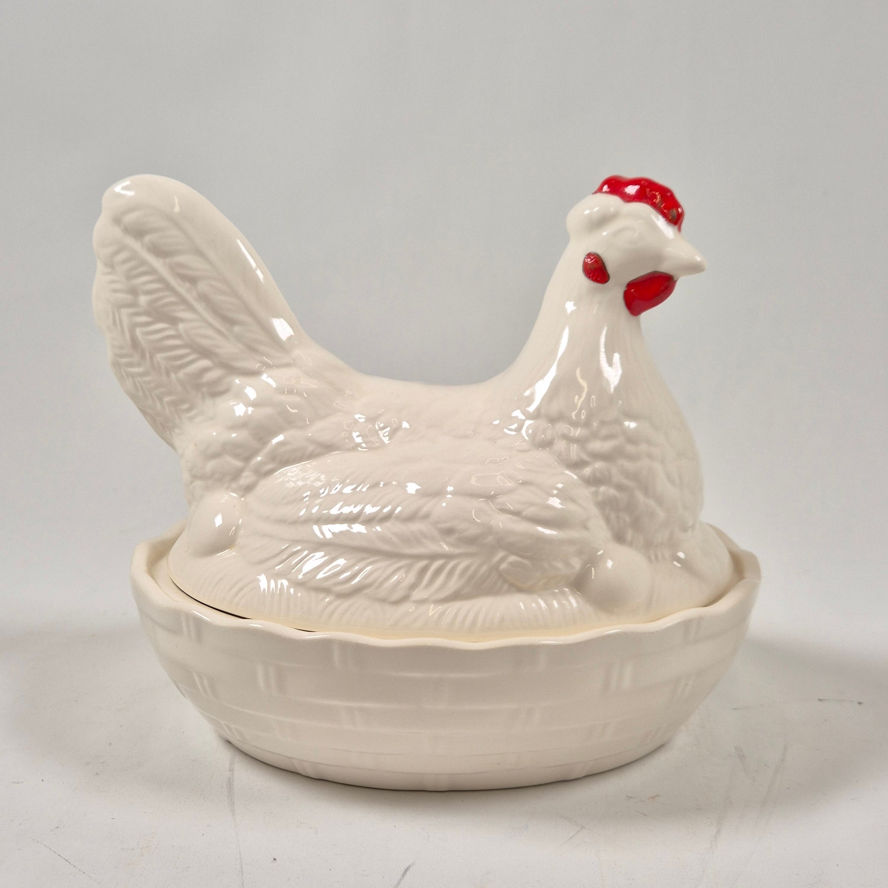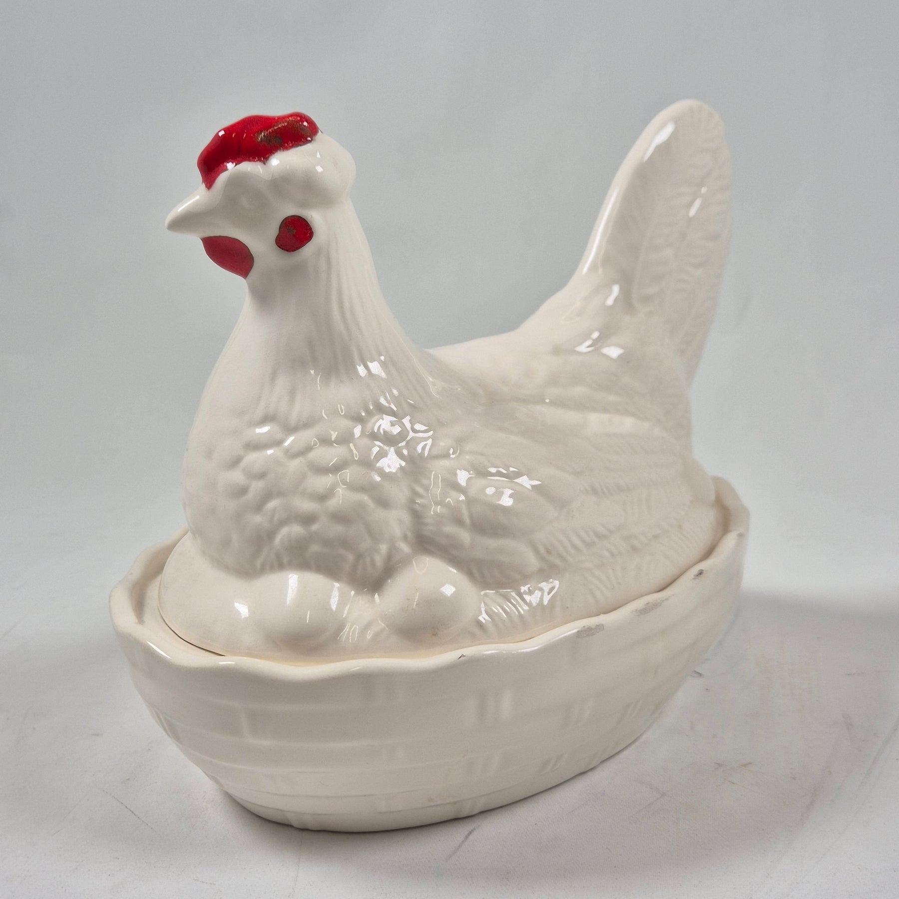 Denna utsökta keramikvas föreställer en ståtlig höna som även fungerar som en praktisk skål. Tillverkad av det välkända varumärket Schramberg under 1981, kombinerar denna pjäs funktion med stil. Dess detaljerade och livfulla design gör den till en perfekt accent i köket eller på matbordet, idealisk för att förvara småsaker eller servera sötsaker. Vardagsföremålet är begagnat men i mycket gott skick och behåller sitt ursprungliga glans och charm.