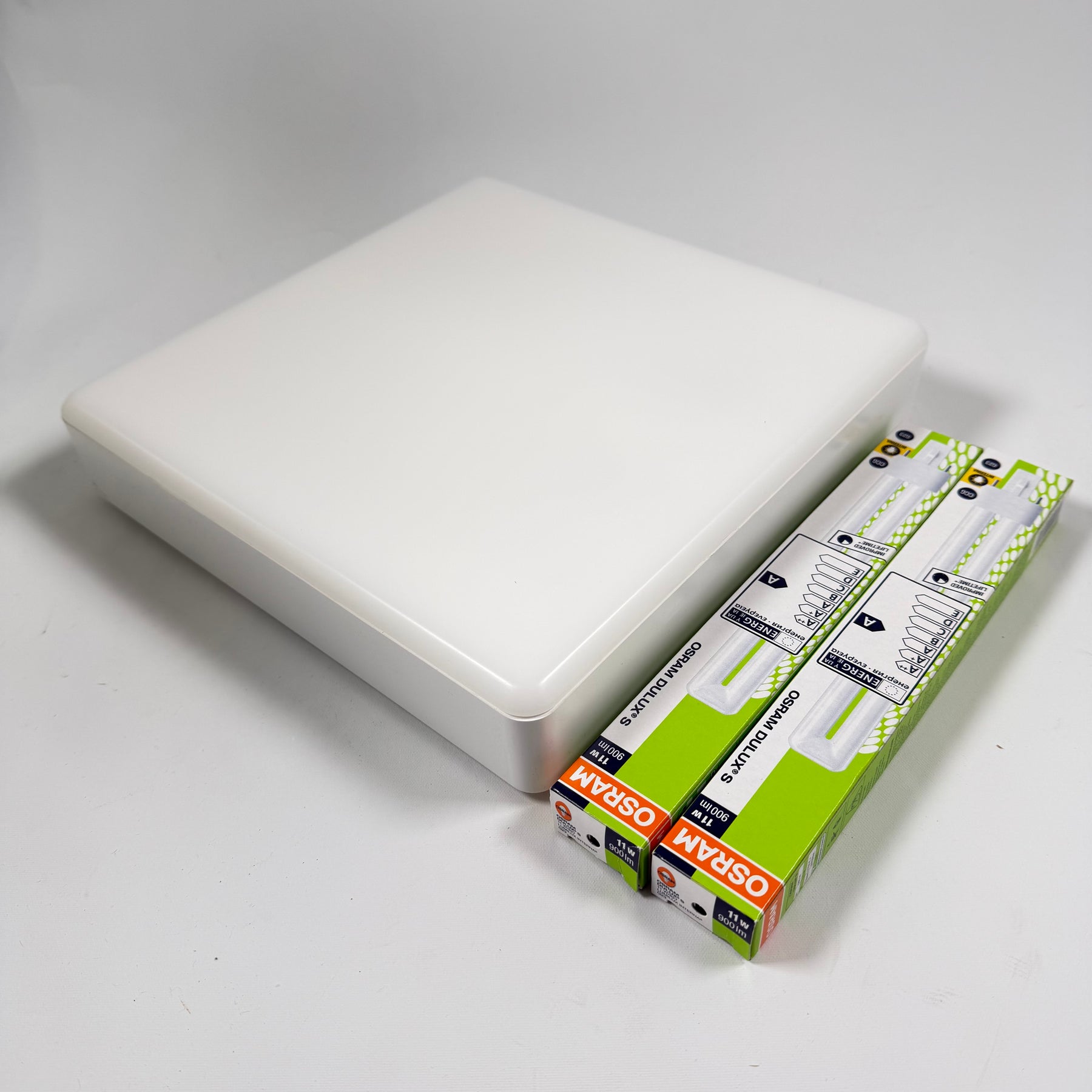 Denna klassiska vägg- och taklampa från Osram kallas Dulux Carré och utformades elegant för både inomhus- och utomhusbelysning. Med en minimalistisk och modern design är lampan utmärkt att installera i en mängd olika miljöer, från vardagsrum till garage. Lampan levereras med två 11W ljuskällor och är begagnad men i mycket gott skick.