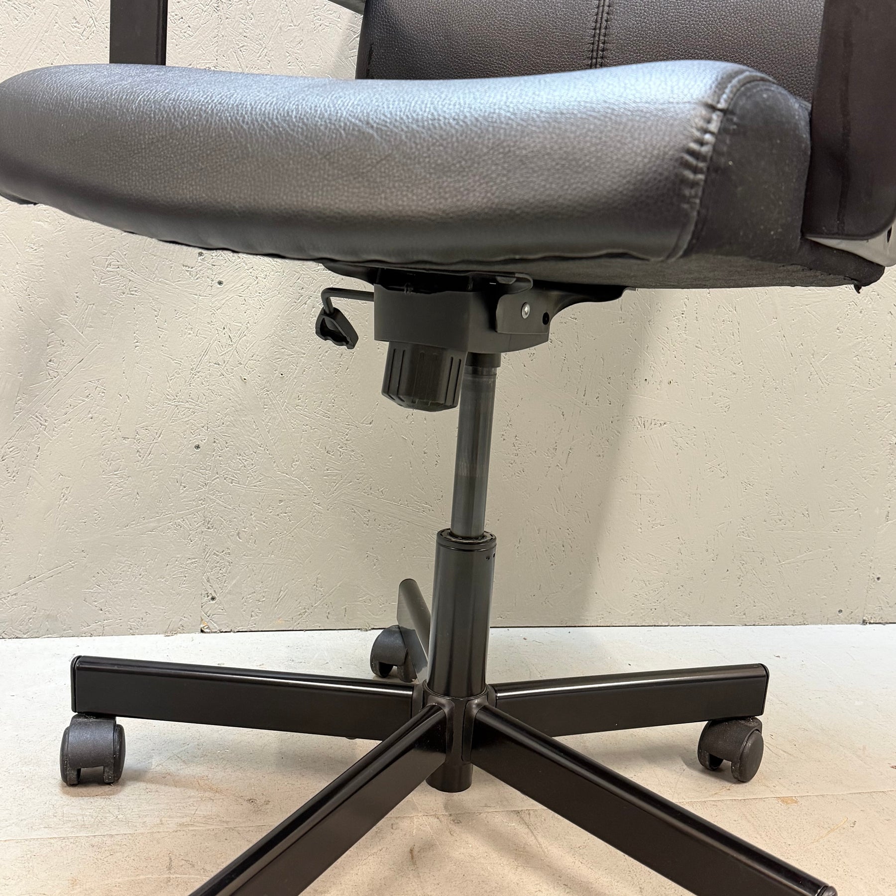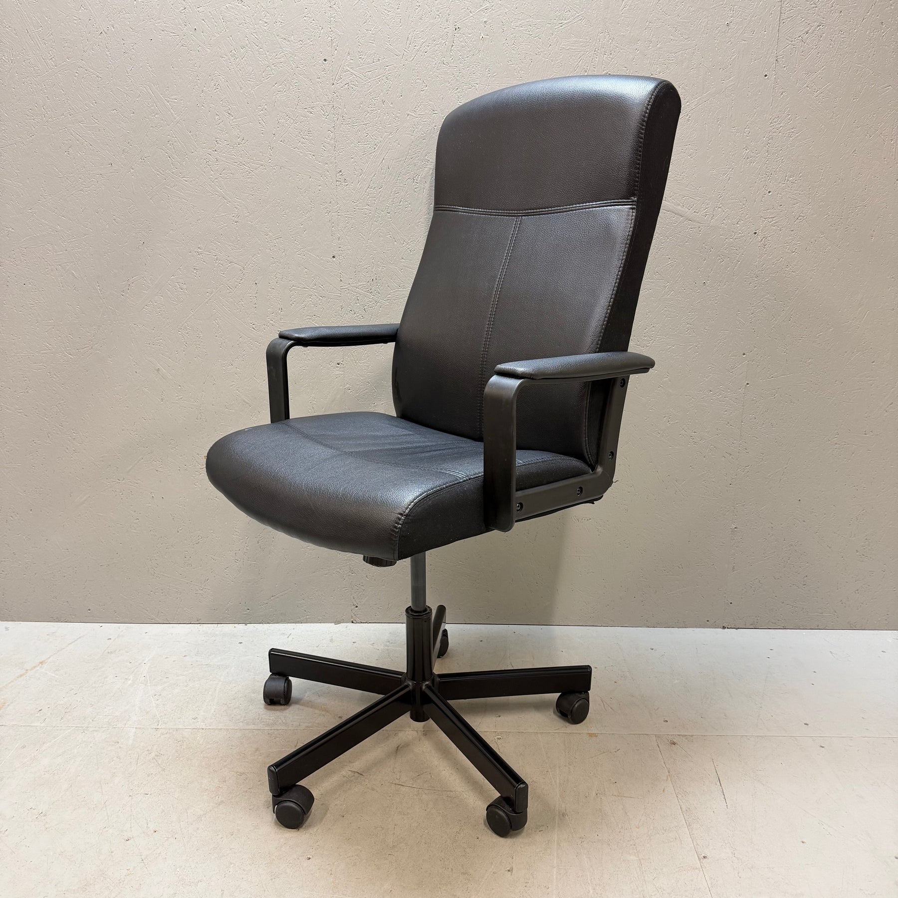 Denna moderna kontorsstol är designad för optimal komfort och funktionalitet. Stolen är justerbar både i höjd och lutning, vilket gör den idealisk för långa arbetsdagar. Med sin släta svarta finish och robusta konstruktion passar den perfekt i såväl det minimalistiska som det mer traditionellt inredda kontoret. Stolen är begagnad men i mycket gott skick, vilket gör den till ett prisvärt alternativ för den kostnadsmedvetna.Produktspecifikationer