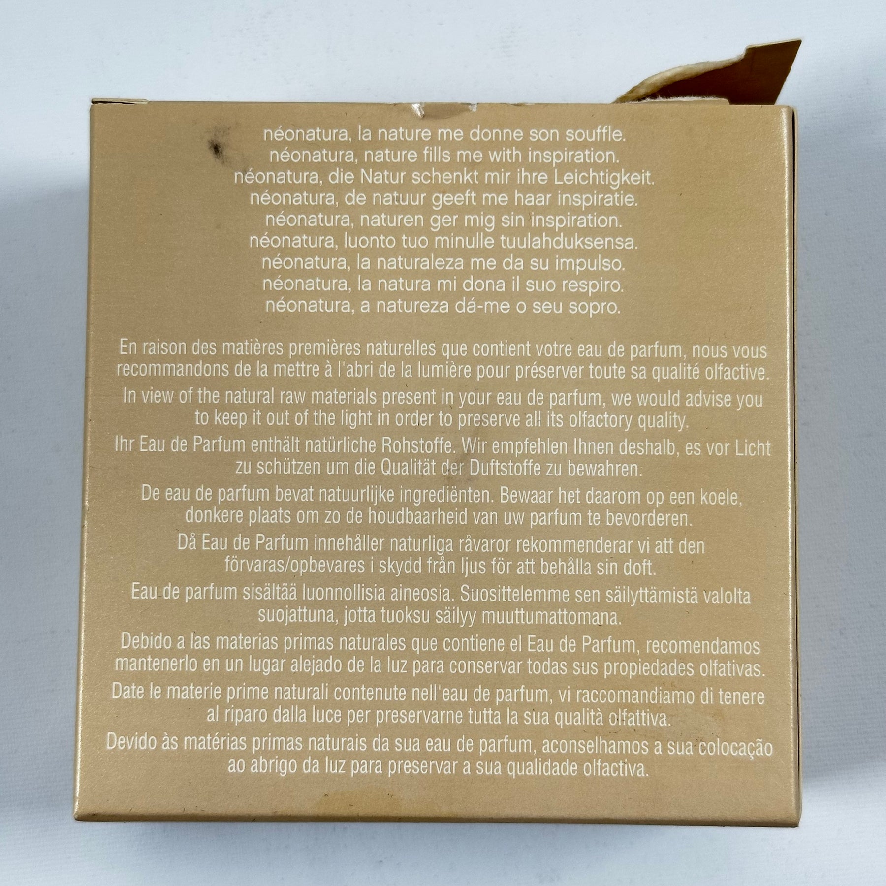 Detta är en omsorgsfullt framställd parfym från Néonatura, presenterad i en elegant och organiskt formad flaska som symboliserar naturlighet och renhet. Den attraktiva förpackningen matchar den högklassiga och naturligt inspirerade doften inuti, gjord för att ge varje användare en unik doftupplevelse. Flaskan är begagnad men har bevarats i mycket gott skick och kommer i sin originalförpackning.