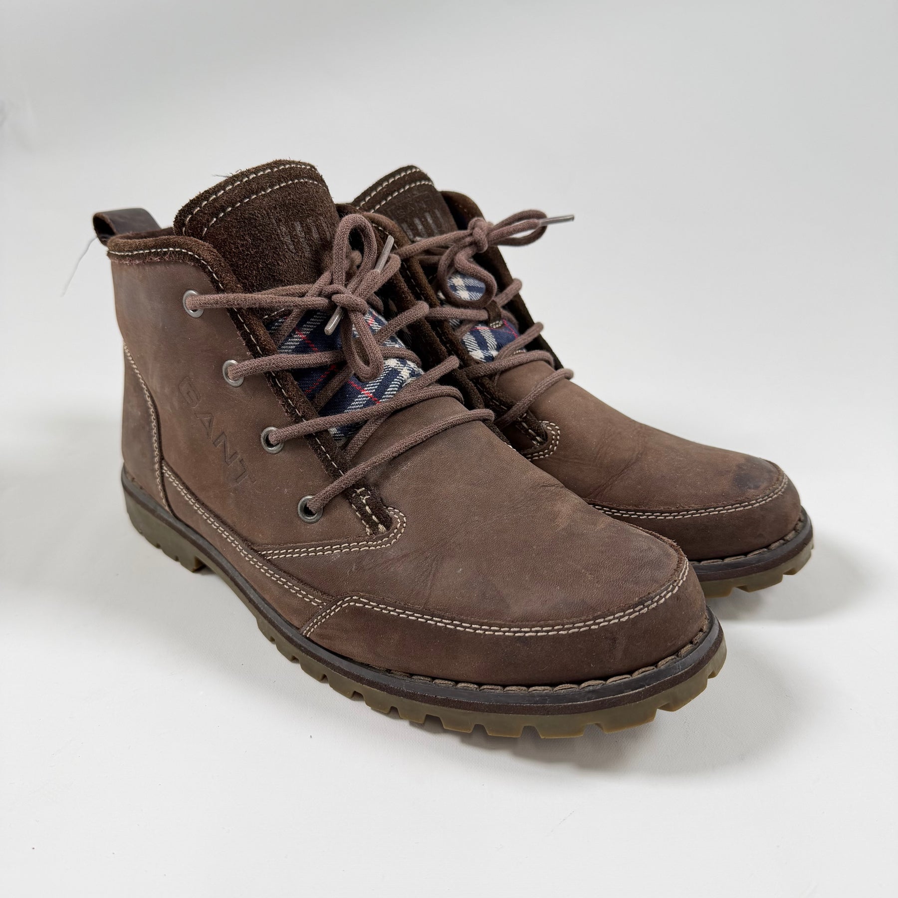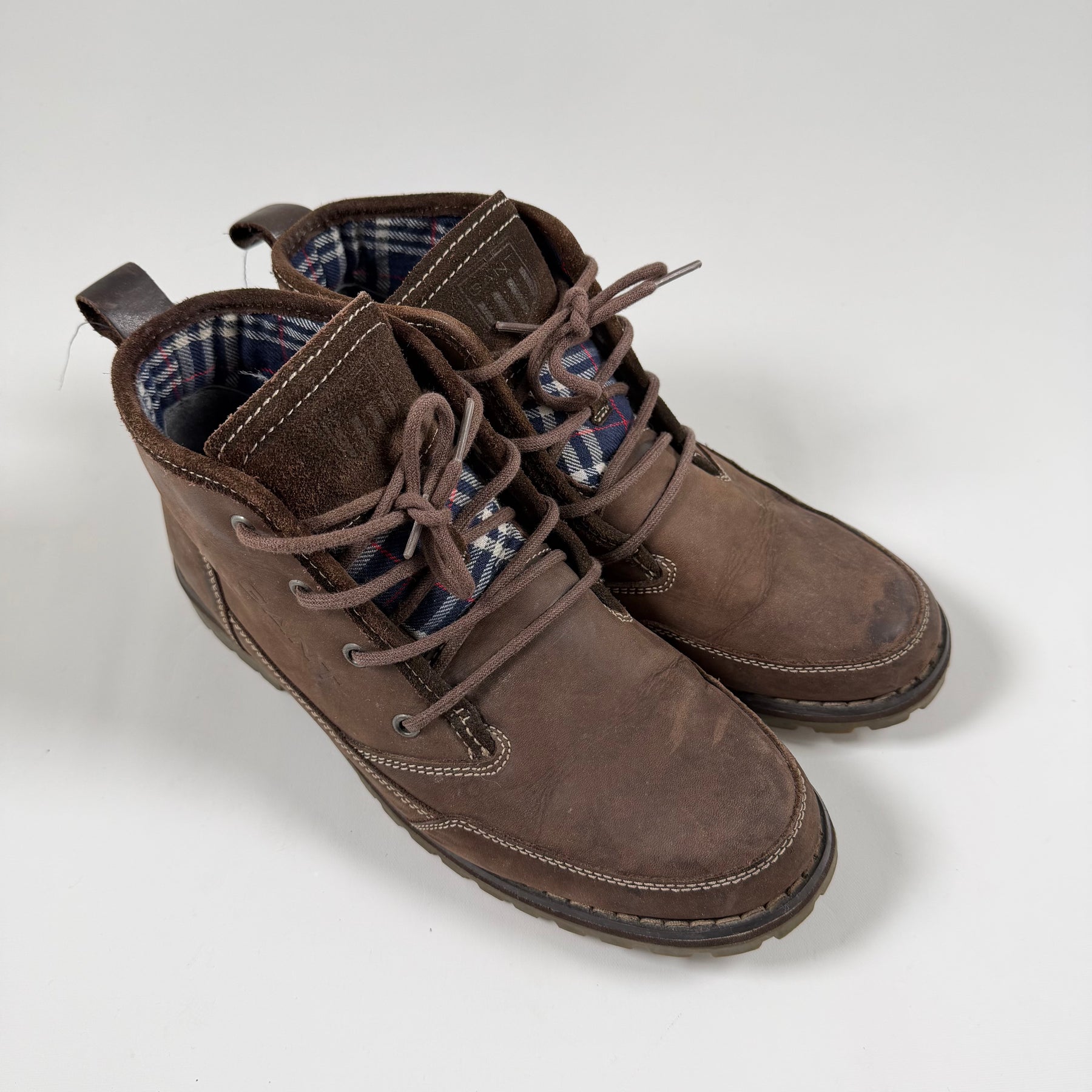Dessa högkvalitativa kängor från det välkända märket GANT är inte bara snygga utan också otroligt hållbara. Kängorna har en klassisk brun färg med detaljrika snören och en bekväm passform, perfekt för såväl stadsäventyr som lantliga utflykter. De är begagnade men i mycket gott skick, vilket gör dem till ett utmärkt köp för den modemedvetne.