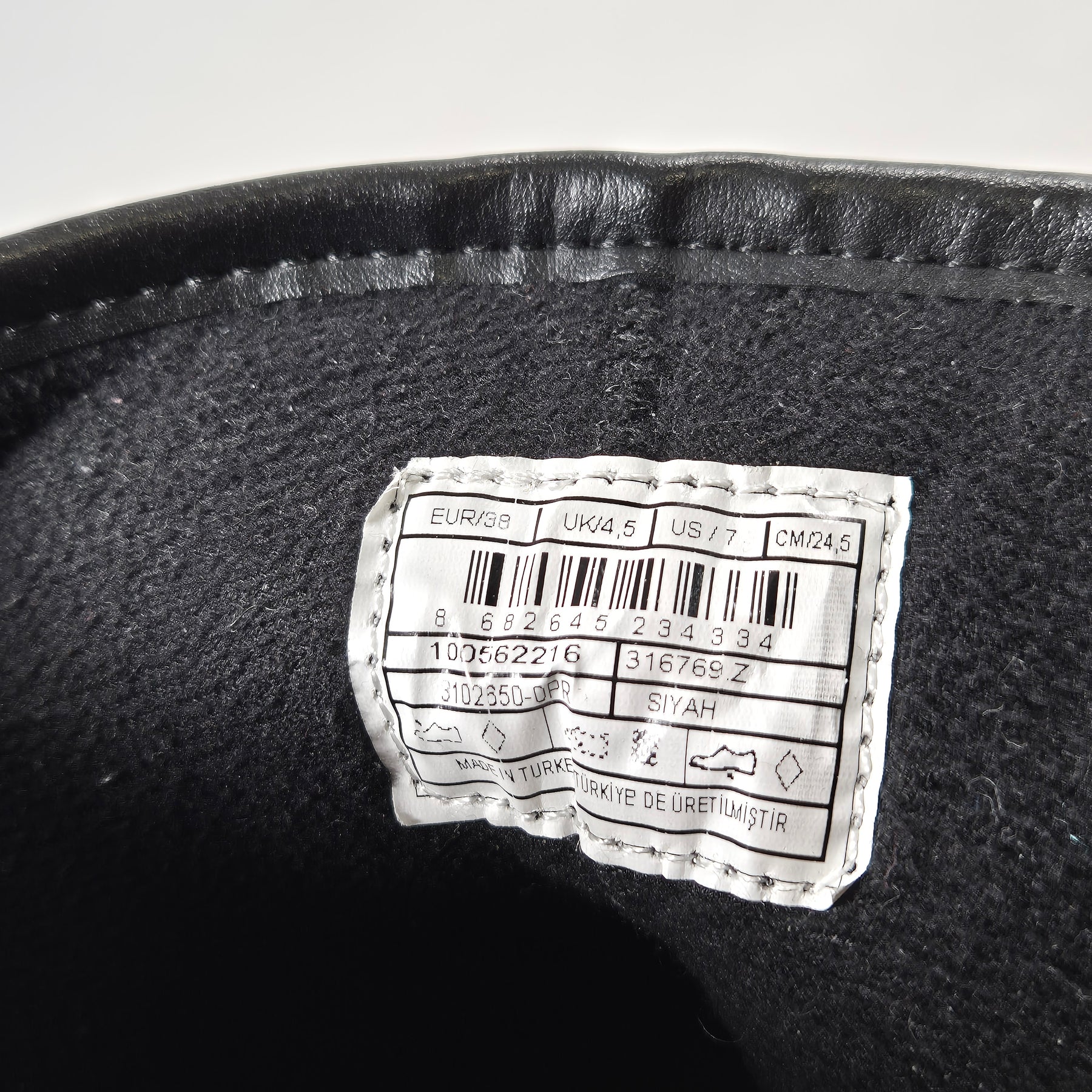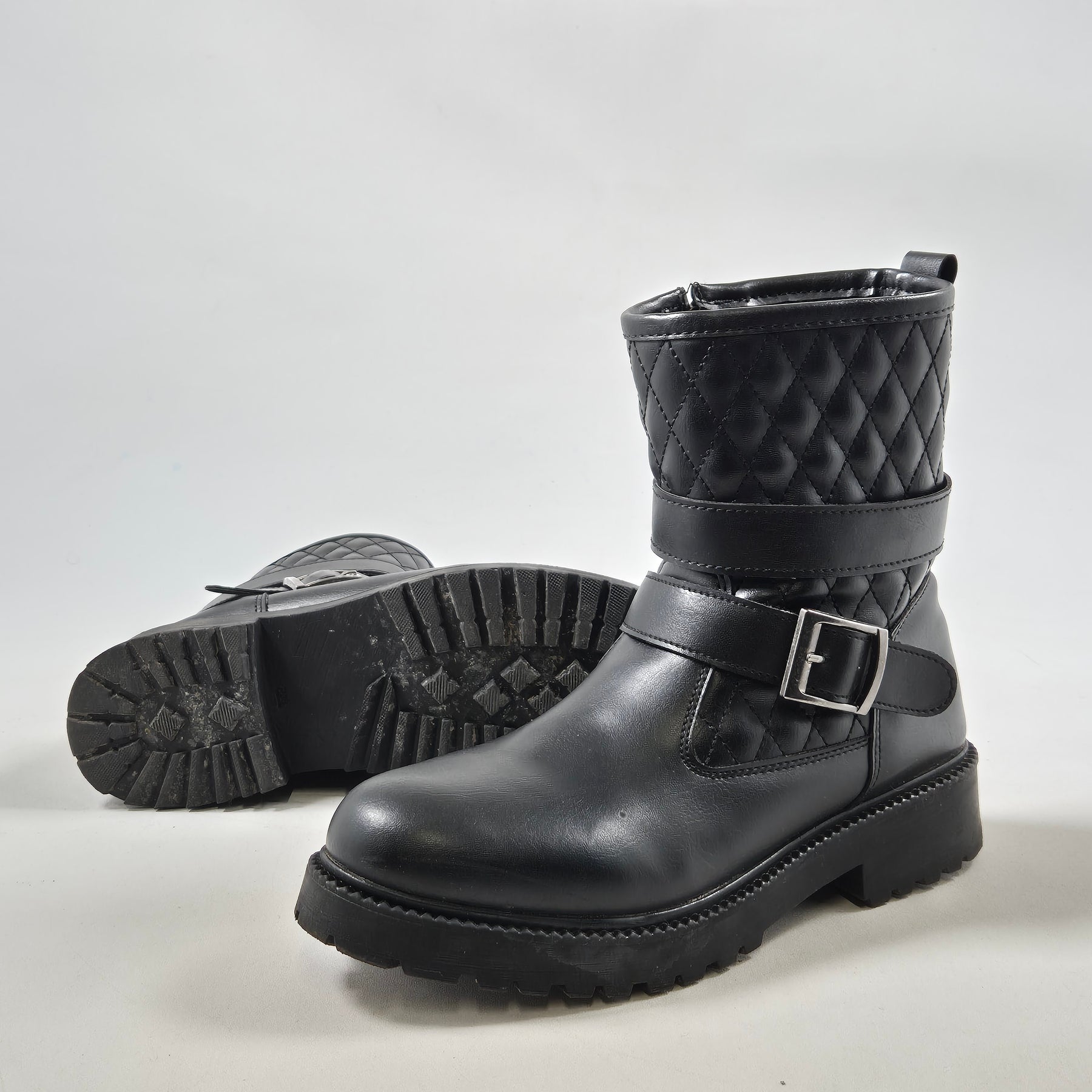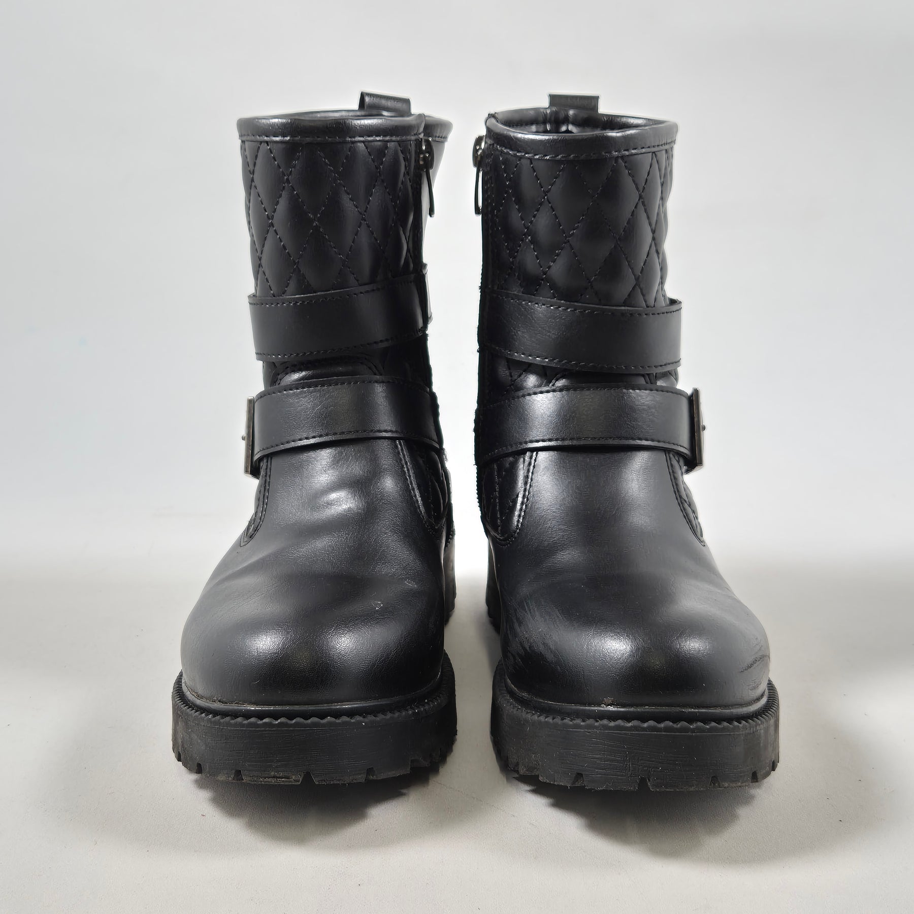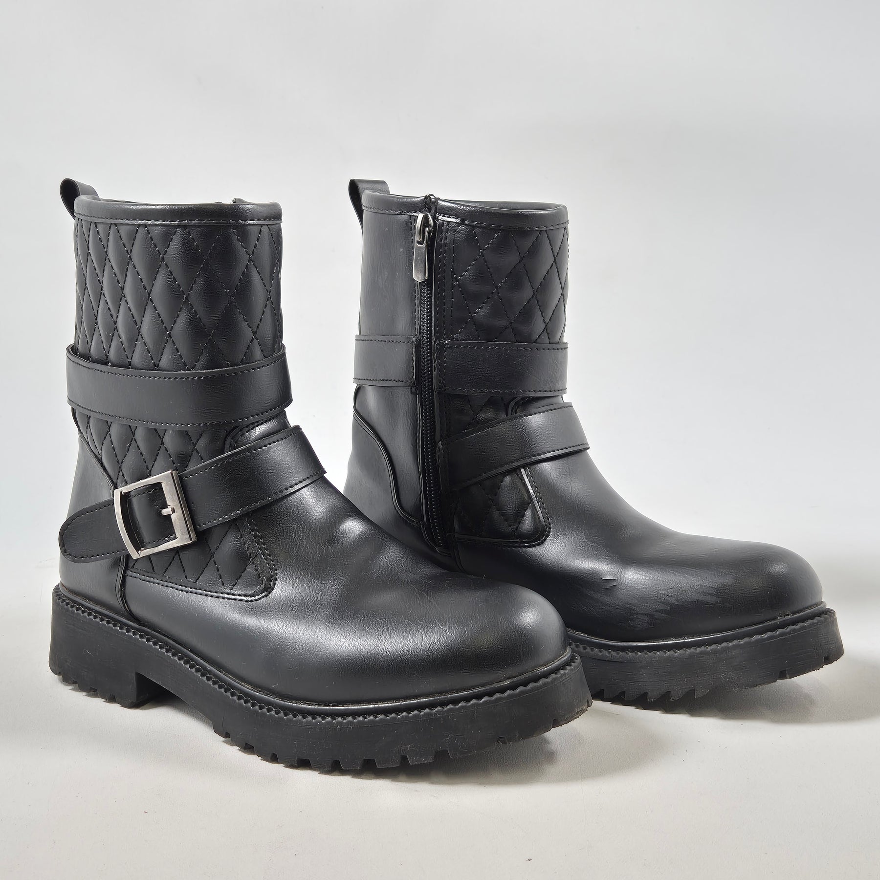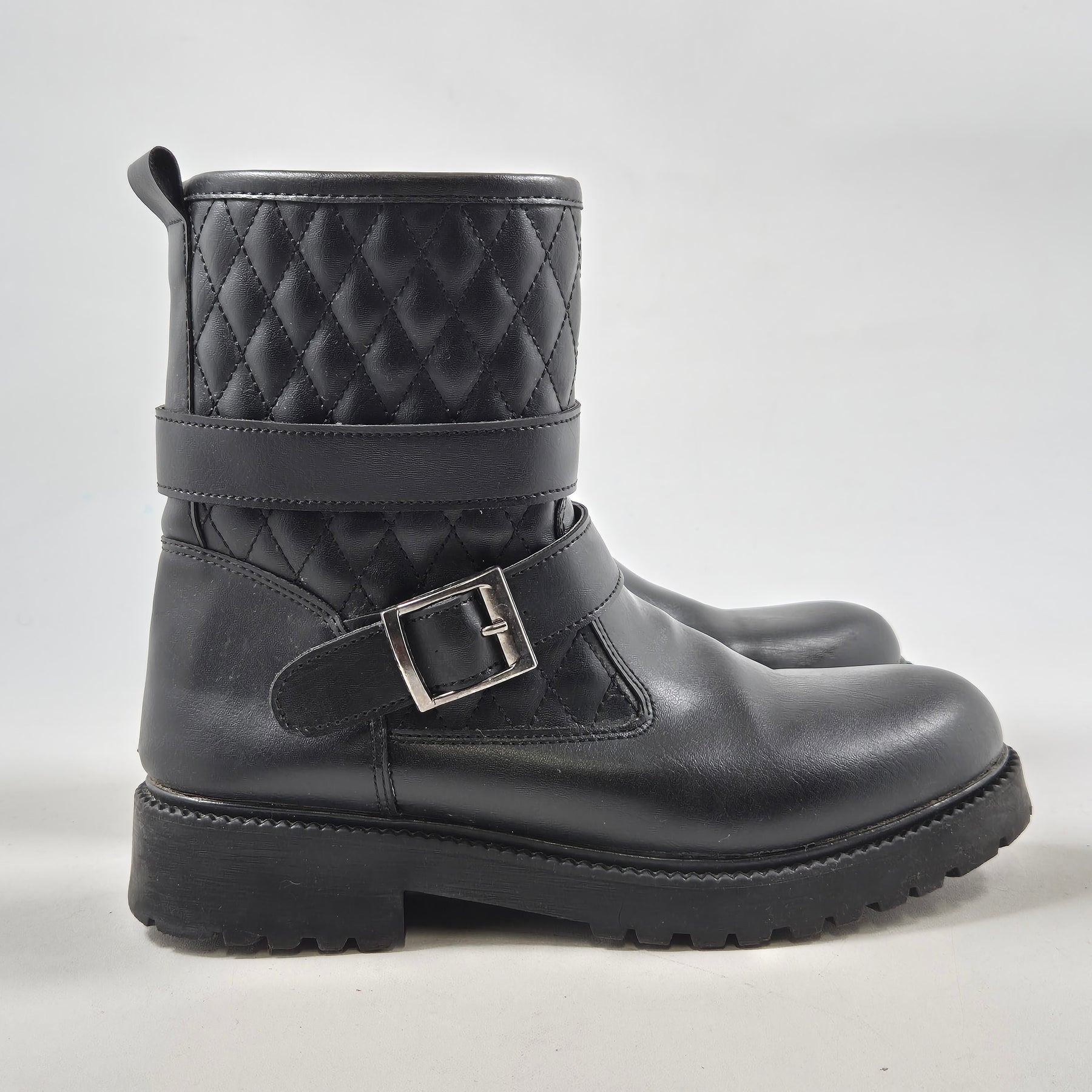 Dessa svarta kängor är designade med en quiltad detalj och justerbart spänne som ger både ett estetiskt tilltalande och funktionellt element. Med sin robusta sula är skon idealisk för såväl urbana äventyr som mer lantliga utflykter. Skorna är tillverkade i Turkiet och är av god kvalitet, listade som begagnade men i mycket gott skick.Produktspecifikationer