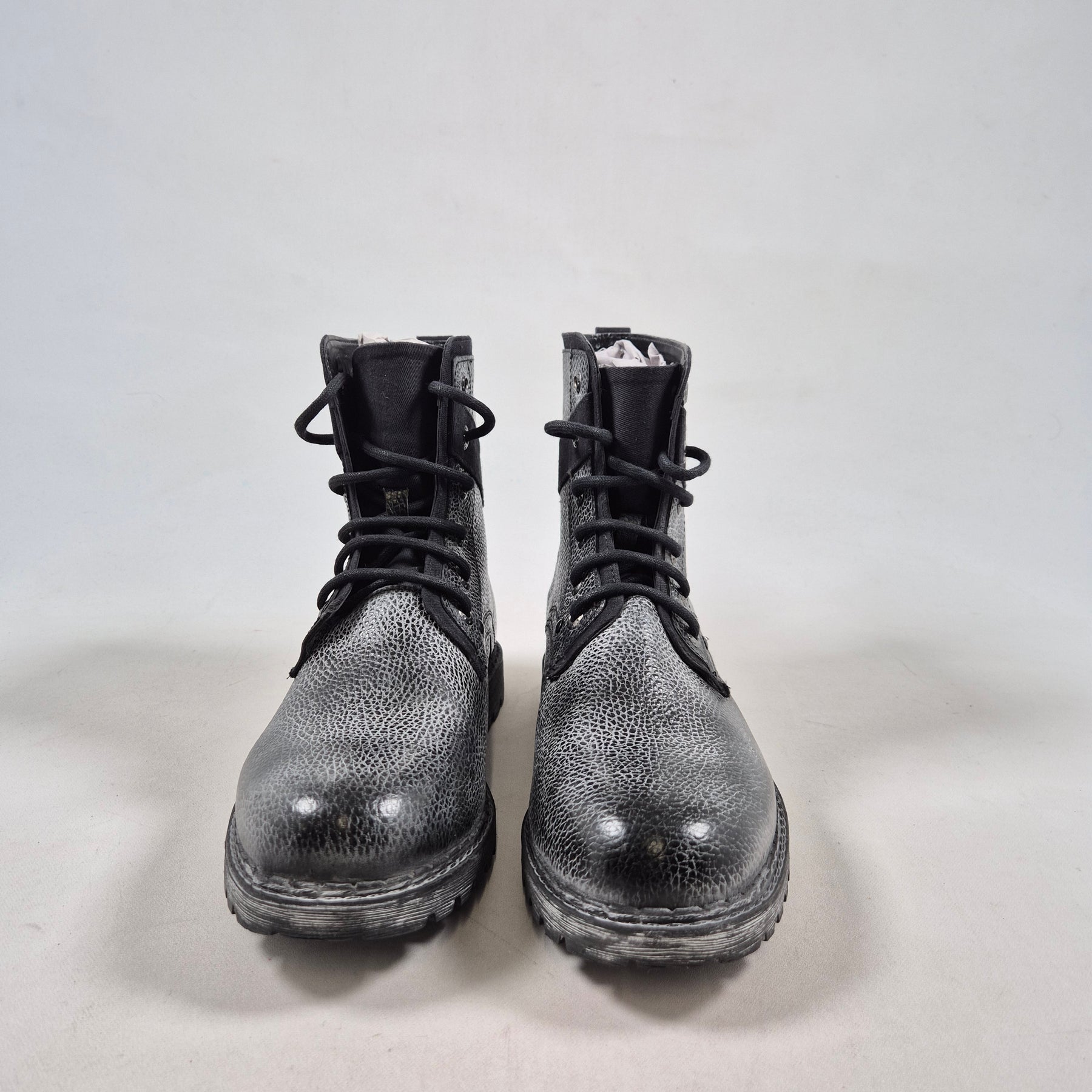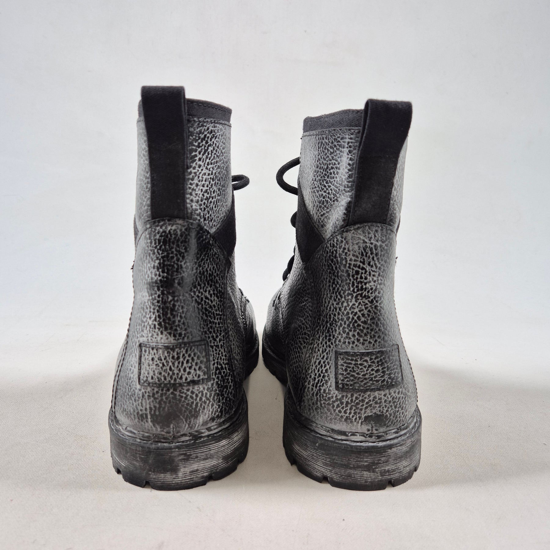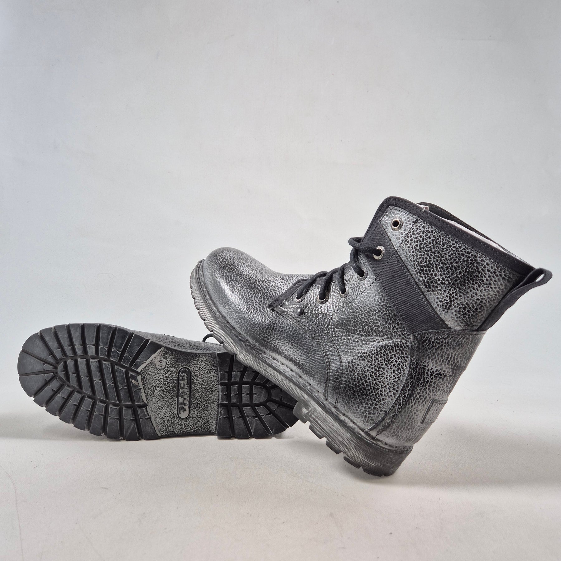 Dessa herrkängor är designade för att både vara funktionella och stiliga. Kängorna har en särskilt robust konstruktion med en unik silverfärgad yta som gör dem till ett blickfång. Skor från märket Black Hammer, kända för sin hållbarhet och kvalitet, utrustade med slitstarka gummiyttersulor. Passar utmärkt för utomhusaktiviteter, vandring eller som ett moderiktigt inslag i vardagsgarderoben. Skick: Ny.