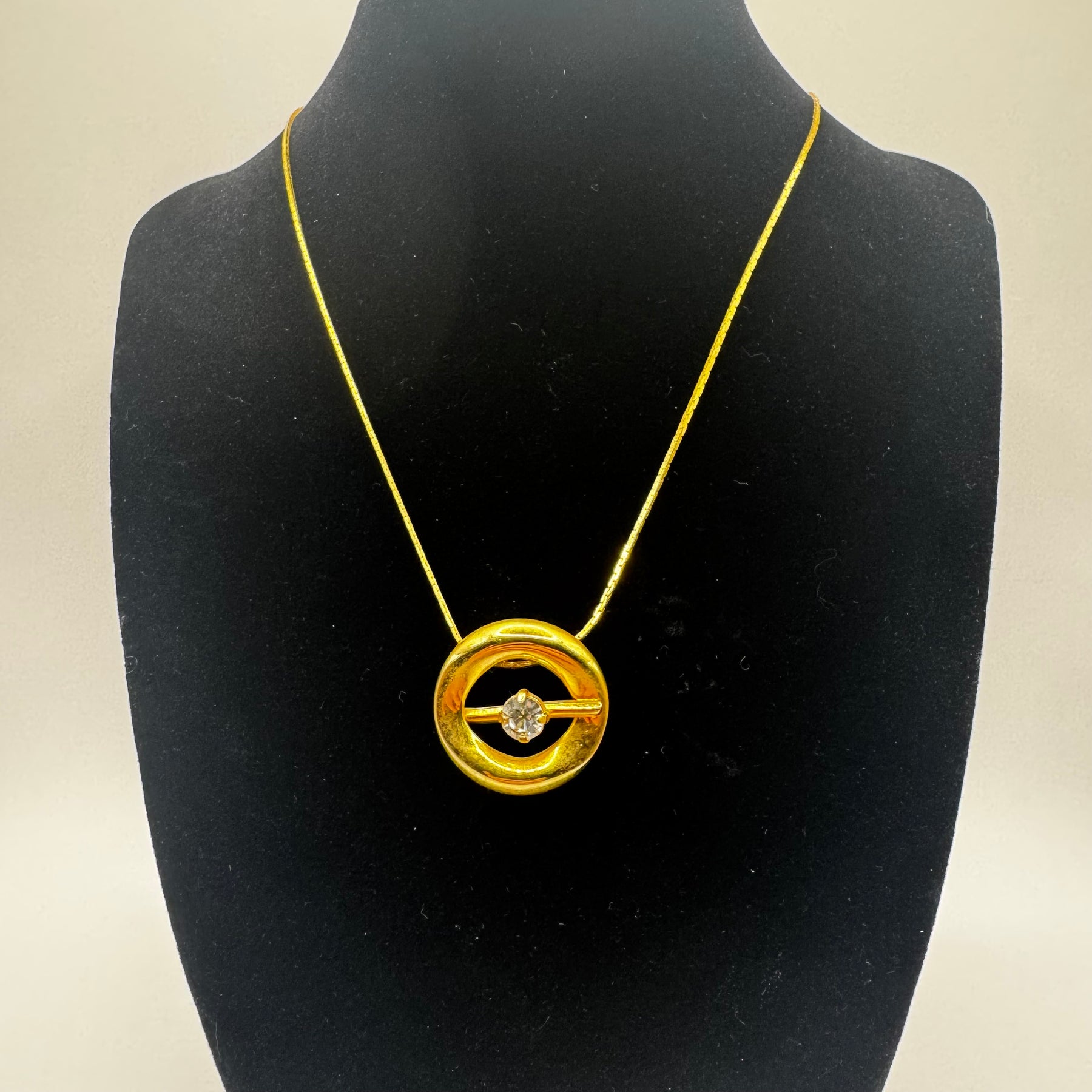 Detta är en iögonfallande halskedja med en modern cirkelformad berlock med en funklade kristall i centrum. Med dess gyllene finish och minimalistiska stil är detta smycke både trendigt och tidlöst. Dess kompakta och slående design gör det perfekt för både vardagsbruk och speciella tillfällen. Smycket är begagnat men har bevarats i mycket gott skick, vilket ger dig en touch av lyx till ett förmånligt pris.Produktspecifikationer