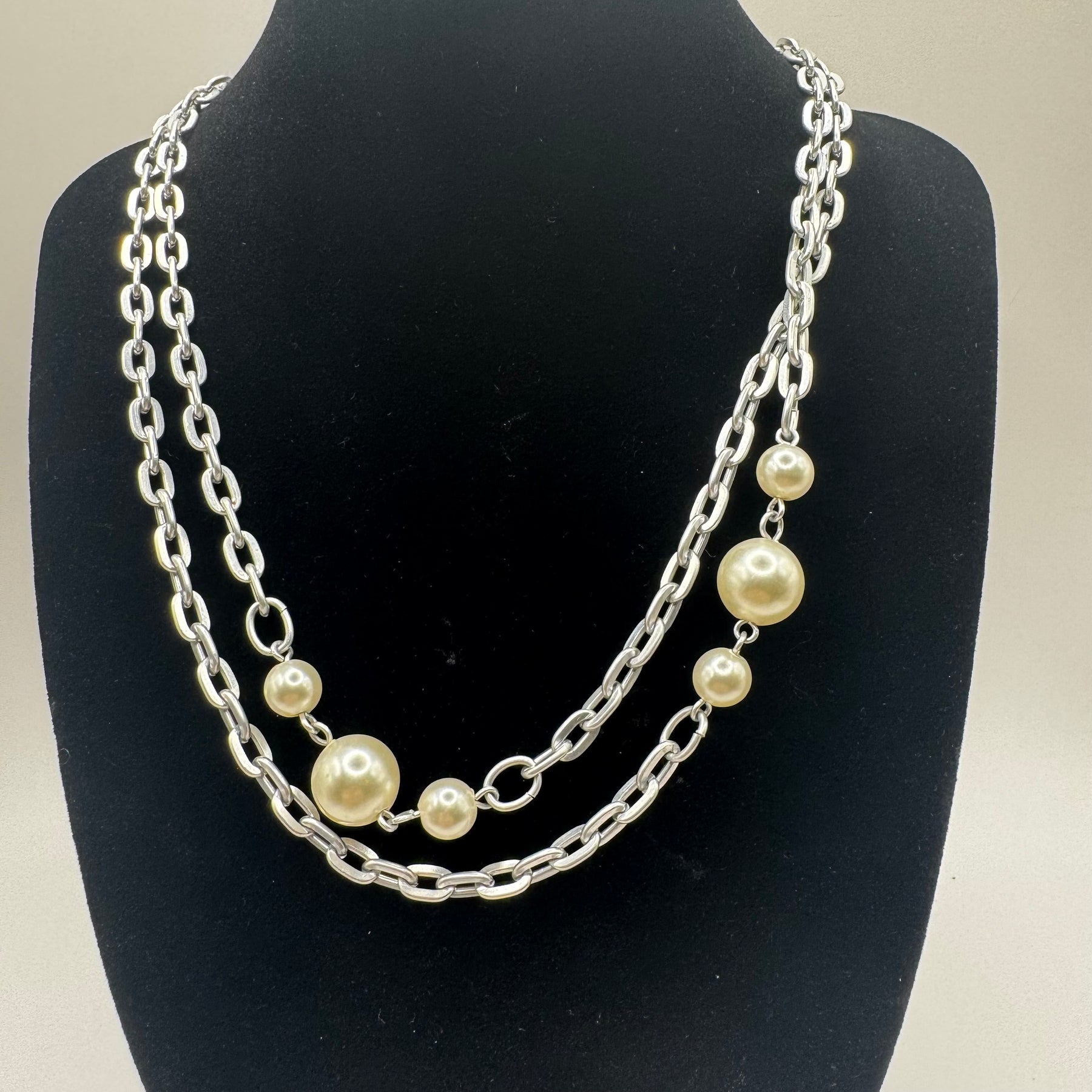 Detta är ett sofistikerat silverhalsband dekorerat med större och mindre konstpärlor som ger en tidlös charm. Med dess stilrena design och lysande pärlor passar detta halsband perfekt för såväl vardagen som festligare tillfällen. Halsbandet är i mycket gott skick och ett perfekt val för den som älskar klassiska smycken med en modern twist.Produktspecifikationer