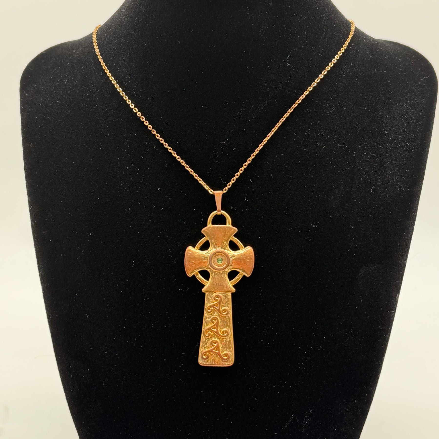 Denna vackra halsbandshänge är formad som ett kors, utsmyckad med intrikata mönster och en centralt placerad grön sten som fångar ögat. Dess design balanserar mellan klassisk symbolik och modern charm, vilket gör den till ett perfekt val för både dagligt bruk och särskilda tillfällen. Hänget är begagnat men har bevarats i utmärkt skick, vilket gör det till ett värdefullt tillskott för alla som uppskattar tidlös skönhet.Produktspecifikationer