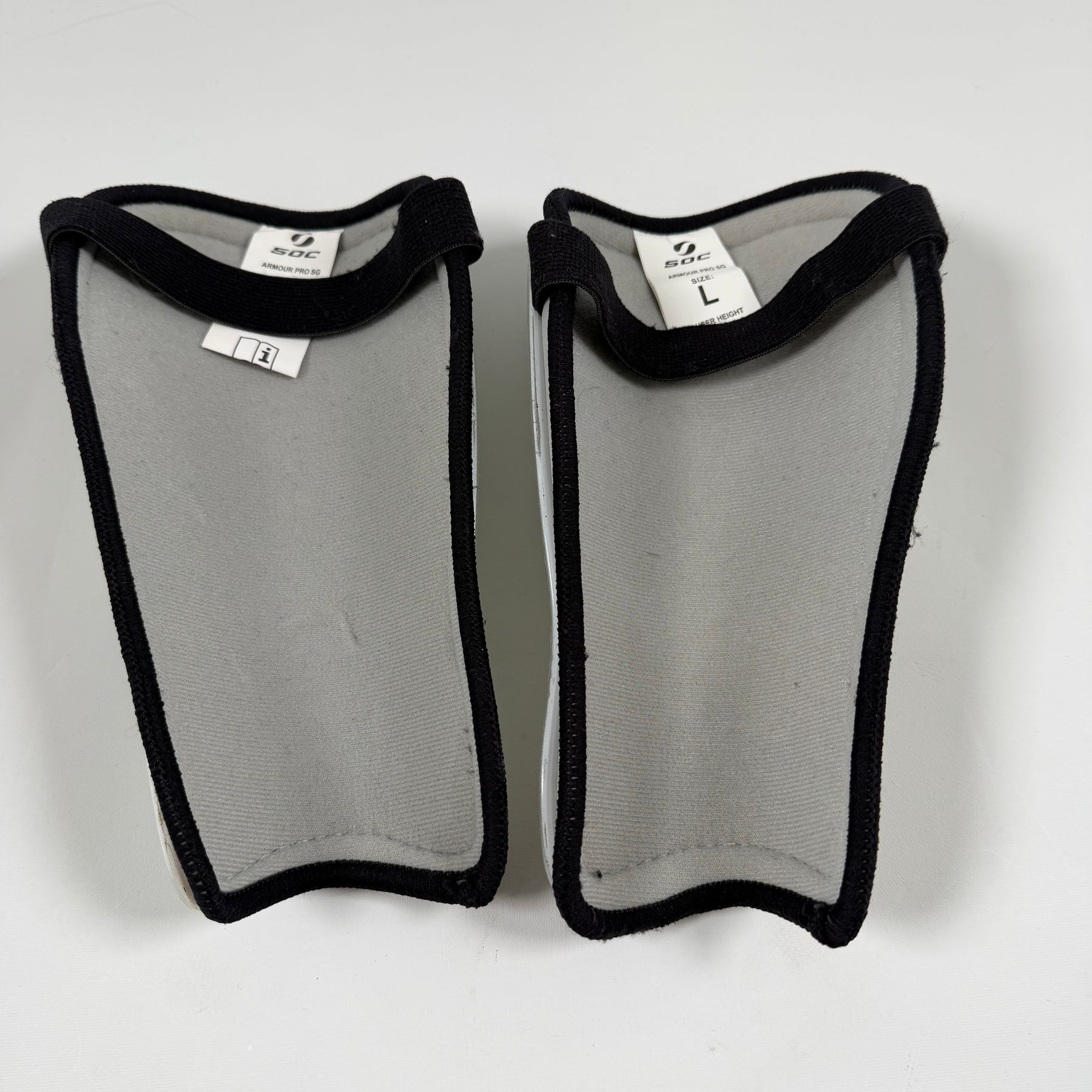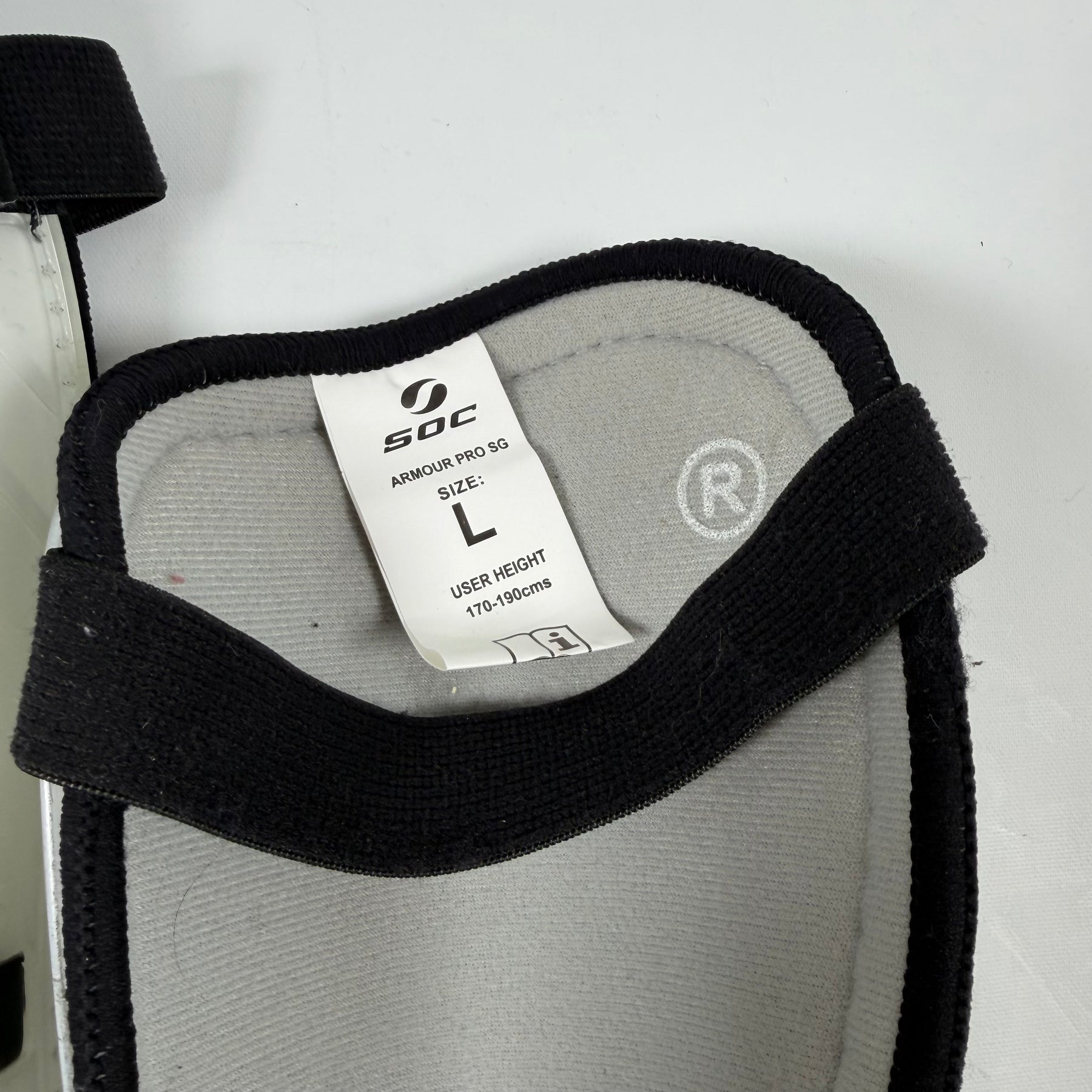 Dessa är SOC Armour Pro-SG benskydd, utformade för att erbjuda maximalt skydd och komfort under fotbollsmatcher. Benskydden kombinerar robust konstruktion med en stilren design, vilket gör dem idealiska för både träning och matchspel. De är tillverkade för att passa spelare med en längd på 170-190 cm och är i mycket gott skick, vilket gör dem till ett utmärkt val för alla fotbollsutövare.Produktspecifikationer