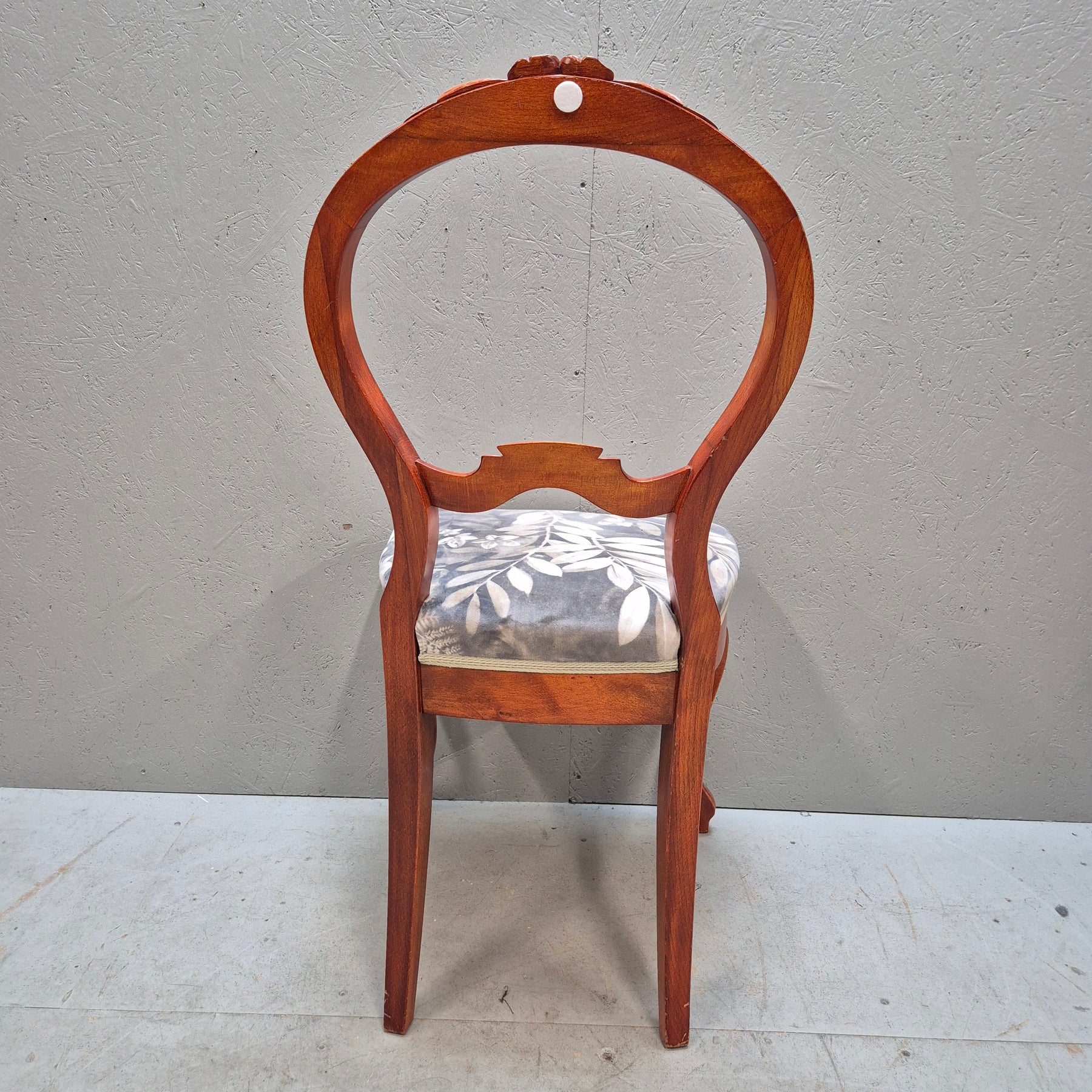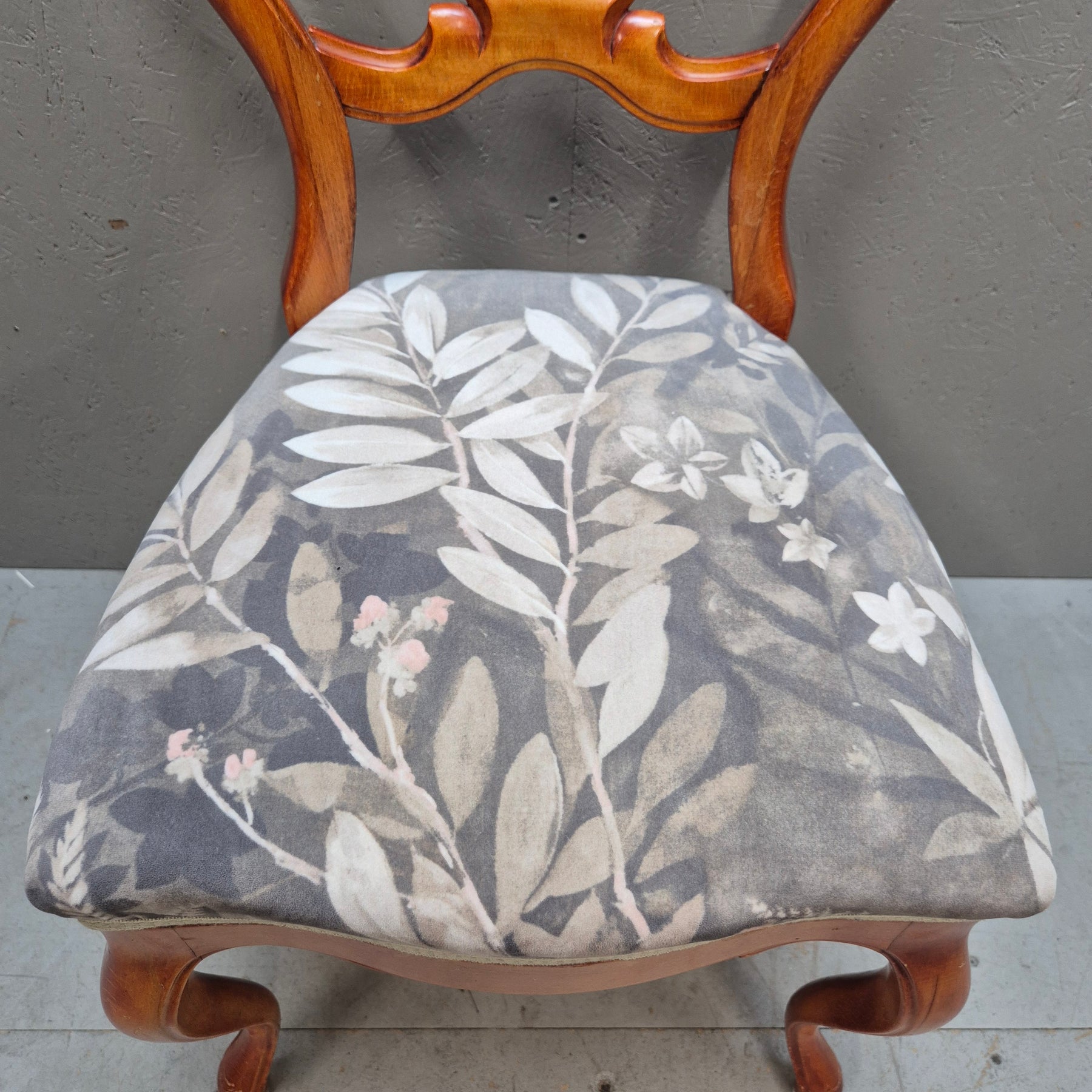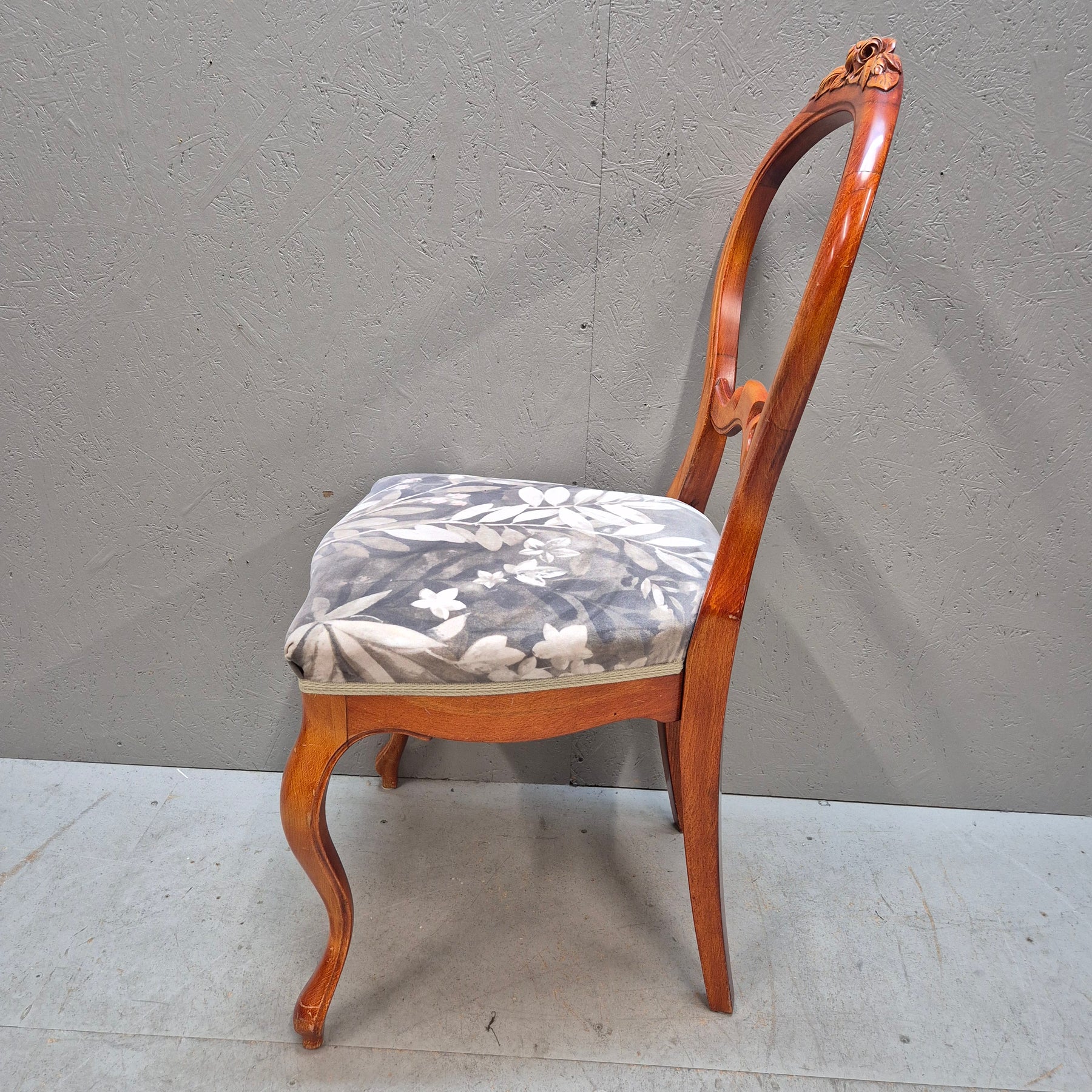 Denna vackra stol med blomstermönstrad sits och uttillat ryggstöd bjuder på både komfort och stil. Med dess träkonstruktion och detaljrika design, är den både dekorativ och funktionell. Perfekt för dig som söker en unik möbel med tidlös charm. Stolen är i gott skick och bidrar med ett klassiskt intryck till varje rum.