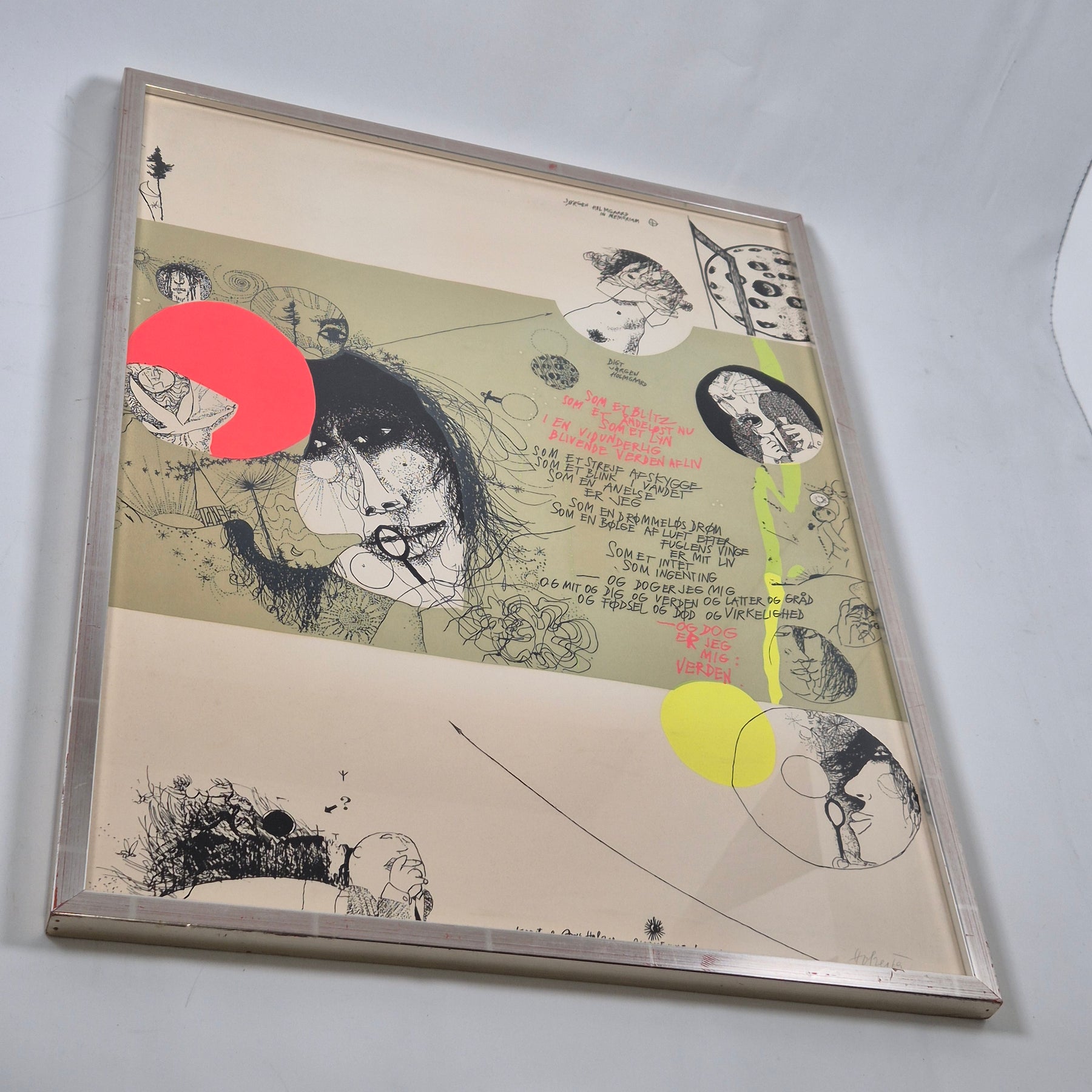 Detta konstverk kombinerar modern design med abstrakta element och djärva färger, vilket skapar en fängslande visuell upplevelse. Verket är detaljerat med suggestiva figurer och texter som adderar ett djup och en berättelse till illustrationen. Konsttrycket är inramat i en enkel men elegant ram som förstärker dess samtida karaktär. Det är en extraordinär dekorationspice som tar vilket rum som helst till nya estetiska höjder. Perfekt för samlare eller som ett statement i någons personliga utrymme.