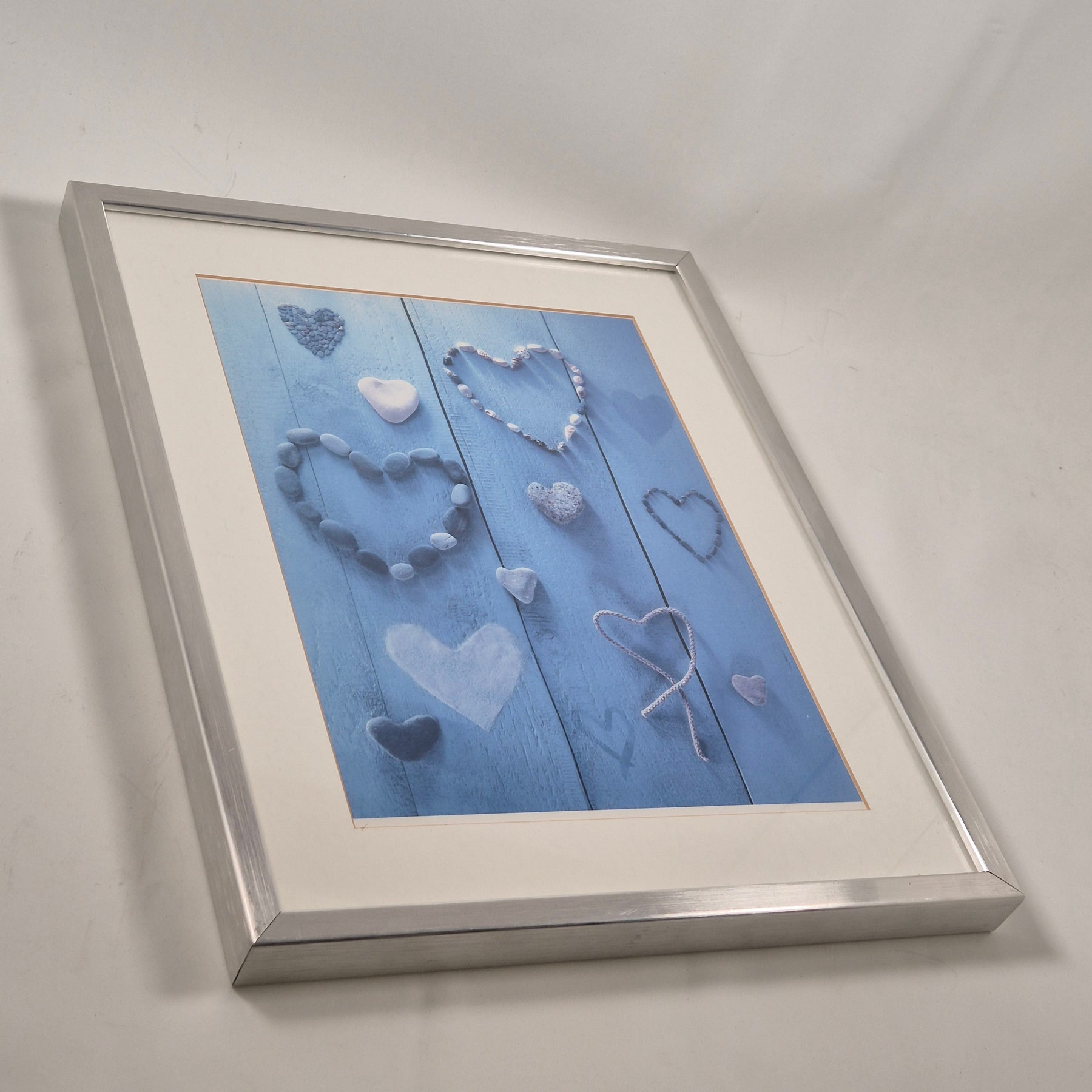 Denna vackra bildram i silverfärgat metallram presenterar en unik samling hjärtformade dekorationer i en lugnande blå ton. Perfekt som en gift eller för att personligt styla ditt eget hem. Ramen är robust och ger ett sofistikerat utseende på både traditionella och moderna väggar. Den är begagnad men har bevarats i mycket gott skick vilket gör den mestadels fri från synliga slitage.