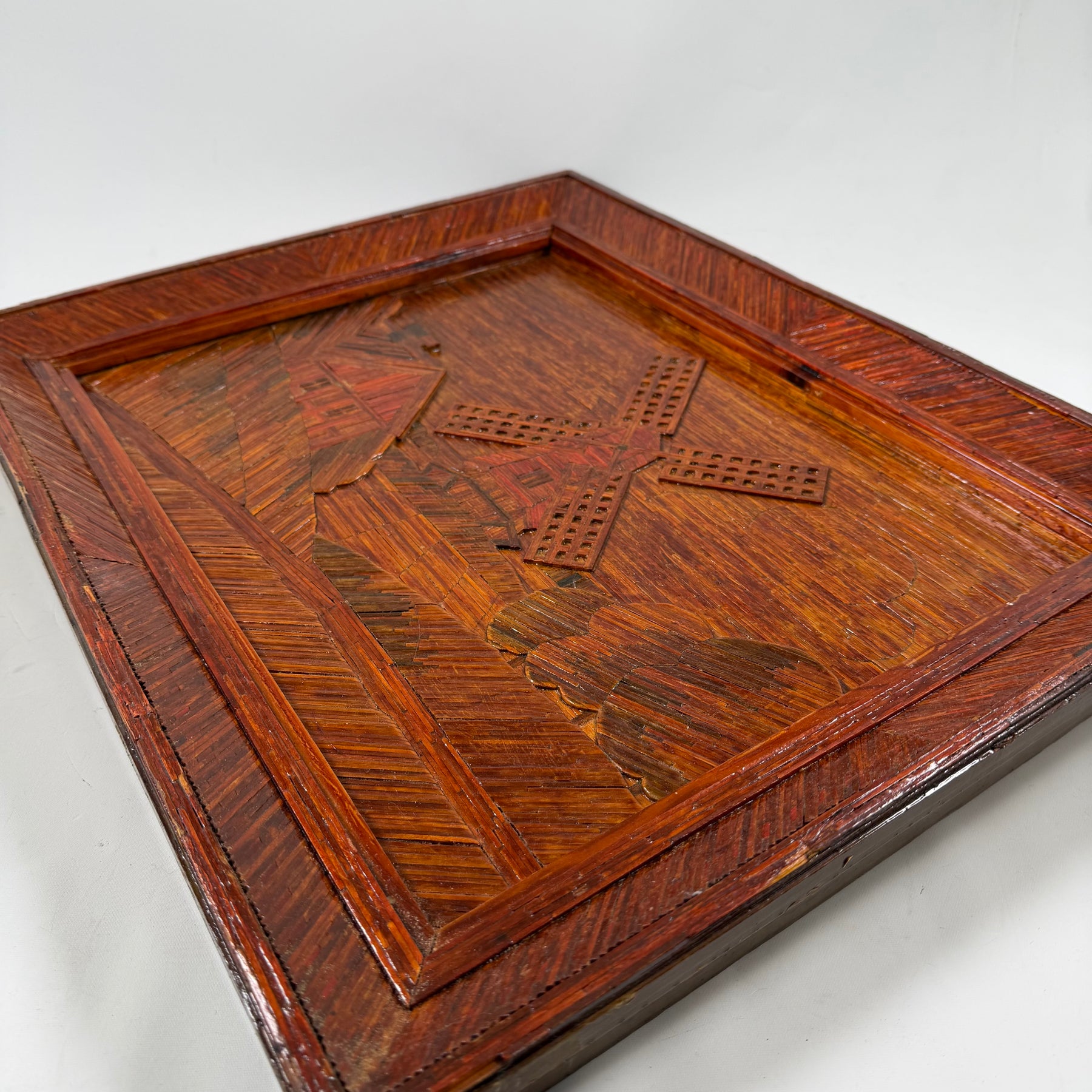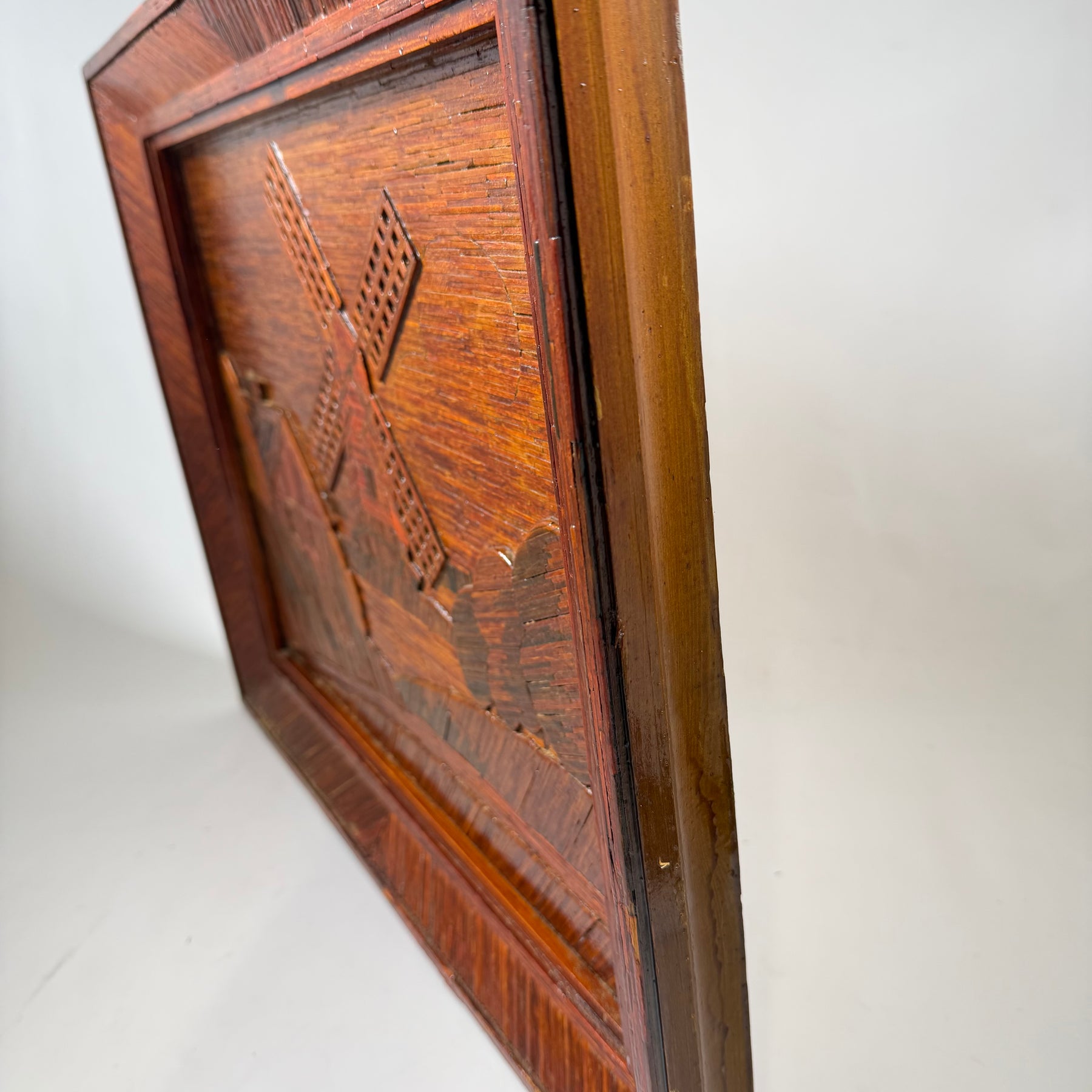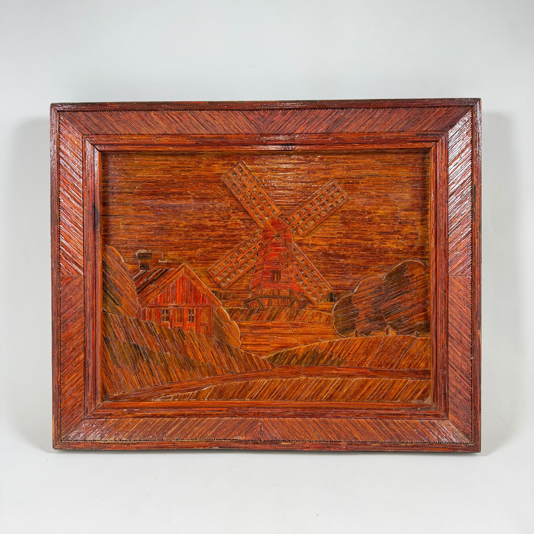 Upptäck en unik och charmig trärelief med motv av en väderkvarn och lantliga byggnader.
