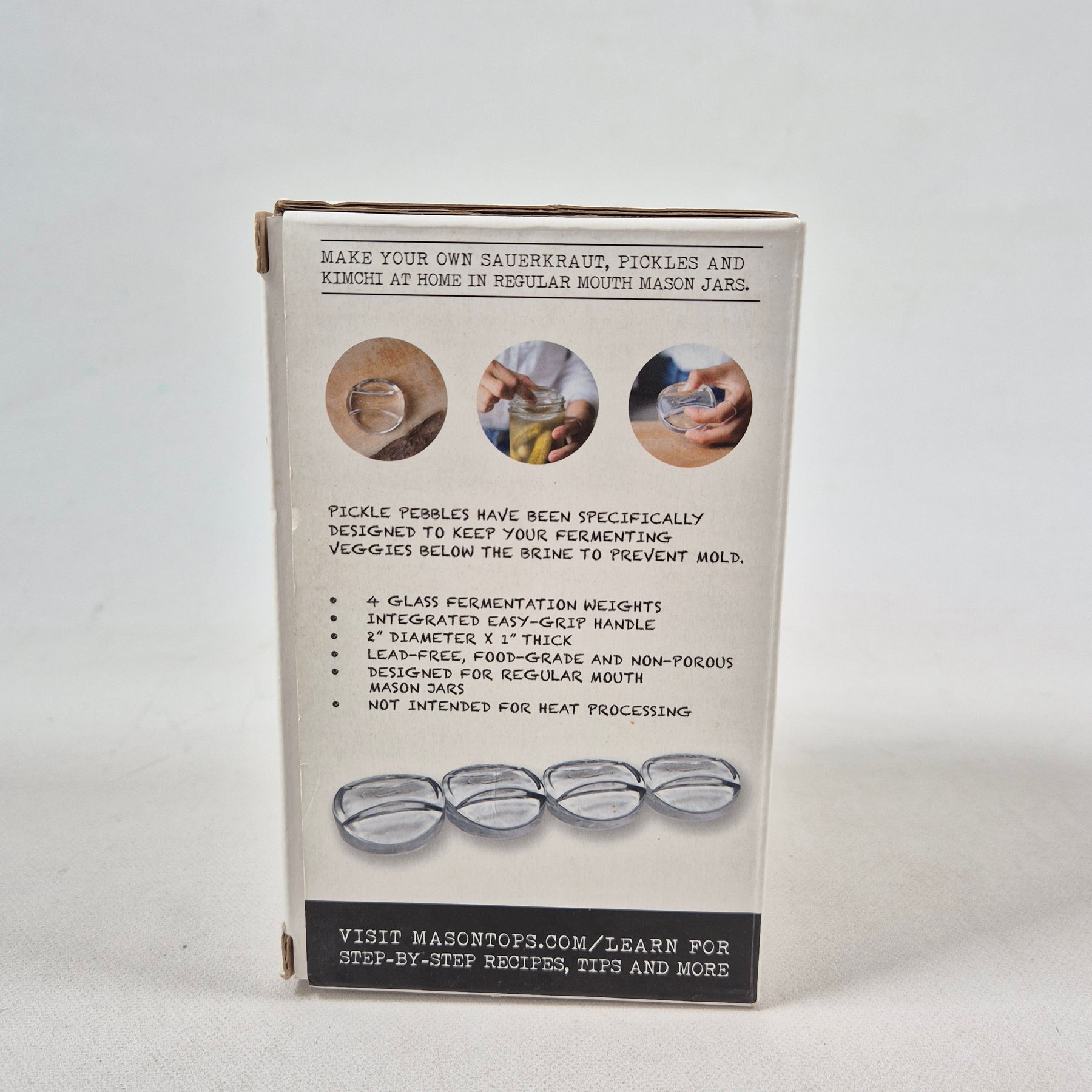 Pickle Pebbles är speciellt utformade glasvikter som hjälper till att hålla grönsaker under laget vid fermentering för att förhindra mögel. De är tillverkade av tungt glas med ett praktiskt, integrerat Easy-Grip-handtag vilket gör dem enkla att hantera. Dessa är ett måste för alla som älskar att fermentera hemma, både nybörjare och erfarna. Produkten är begagnad men i mycket gott skick, så gott som ny.Produktspecifikationer