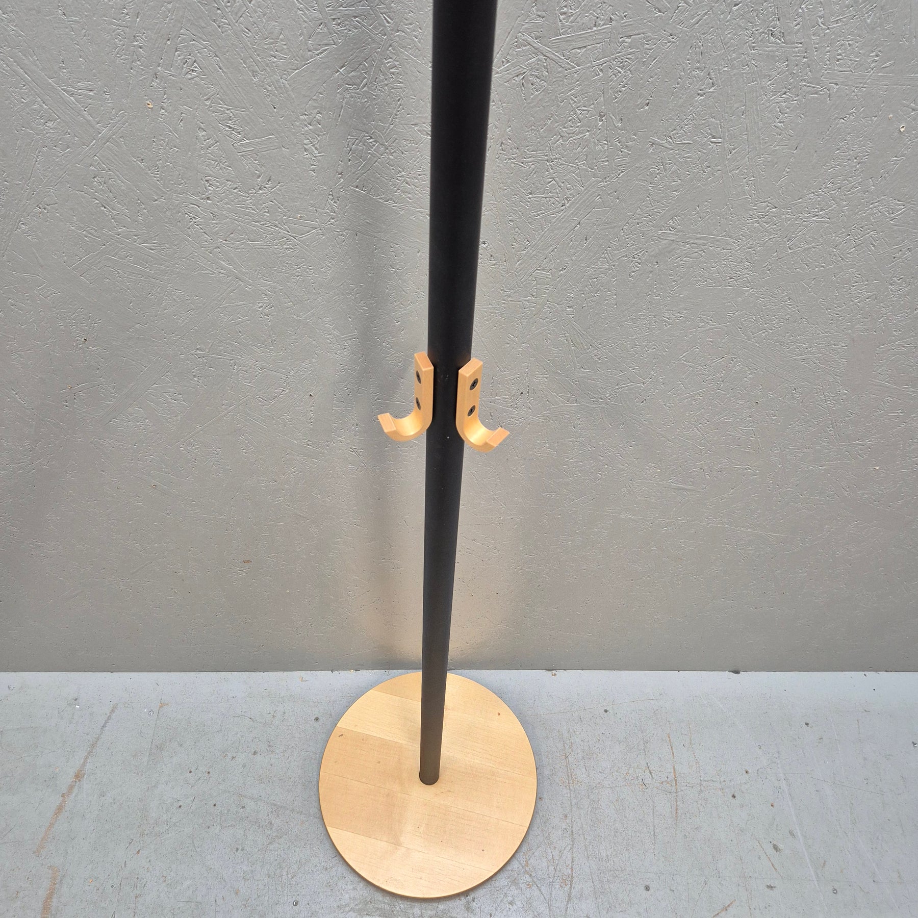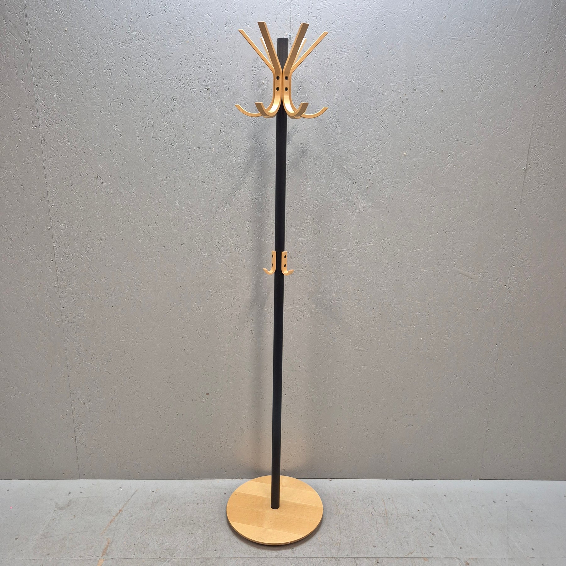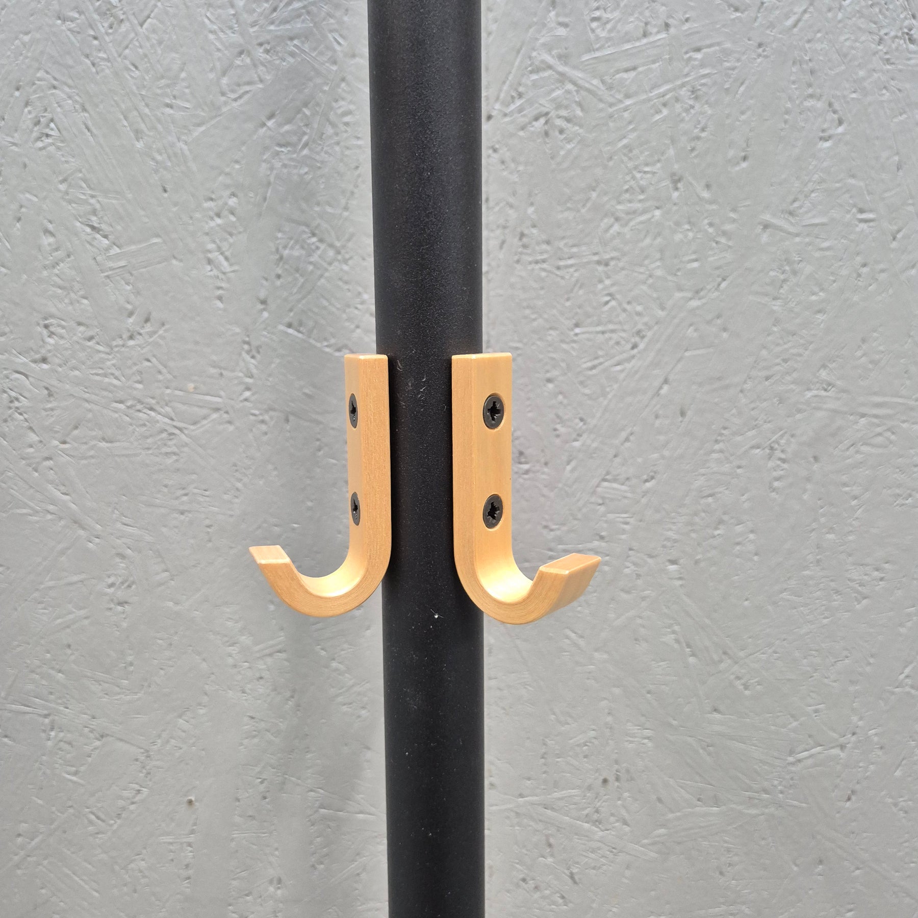 Denna klädhängare kombinerar funktion och stil med sitt unika utformande som blandar mörkt metall och varmt trämaterial. Perfekt för kompakt förvaring och som ett dekorativt element i allt från sovrummet till hallen. Klädhängaren är begagnad men i mycket gott skick, redo att användas i ditt hem.