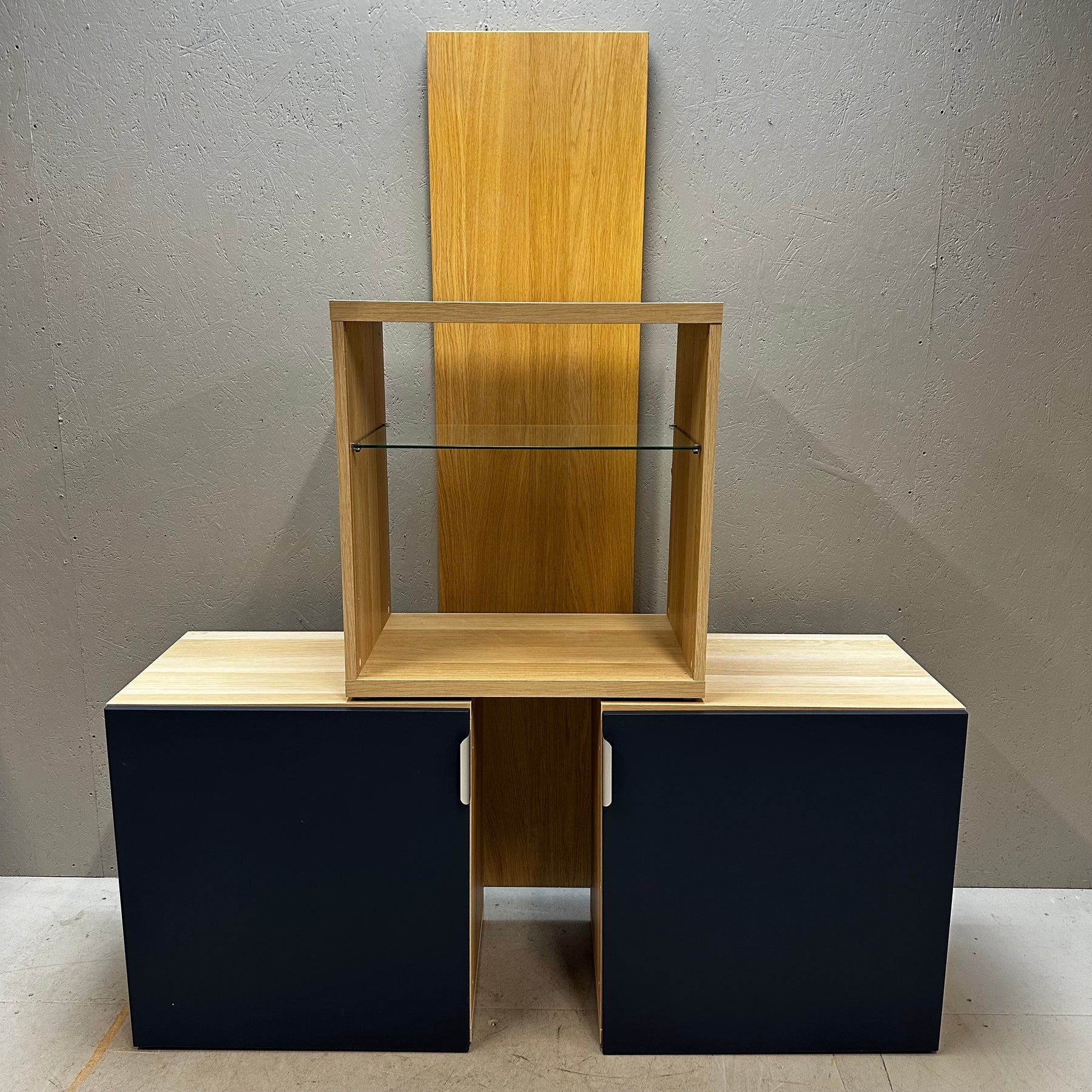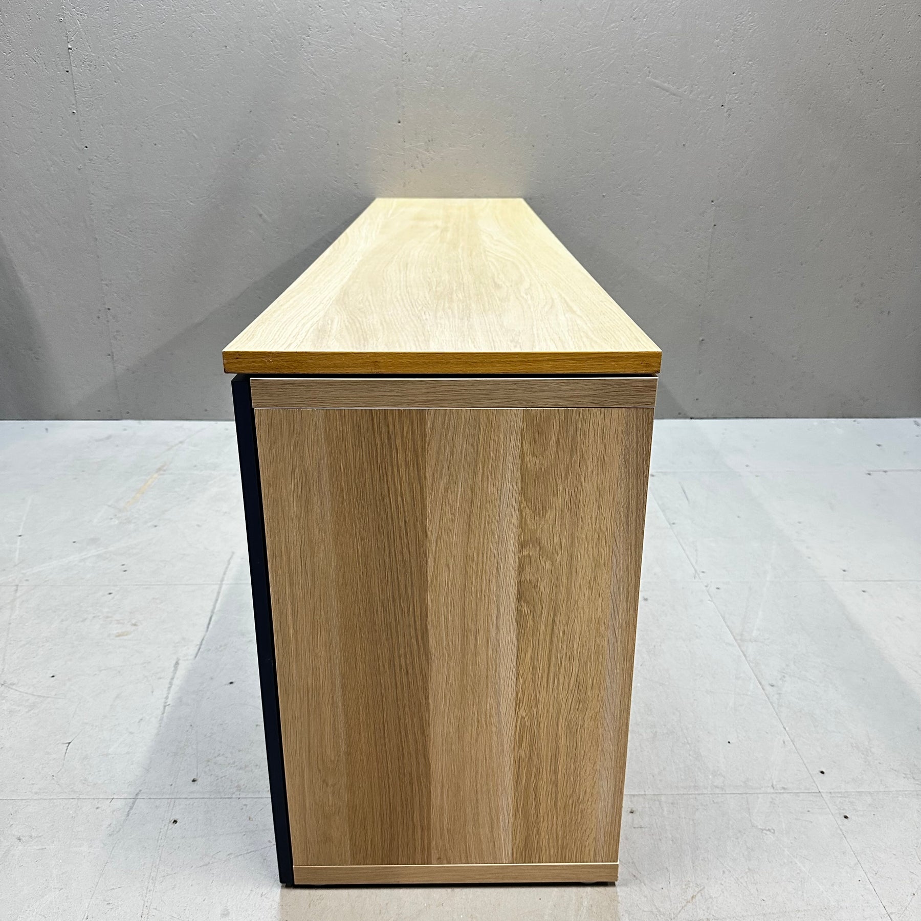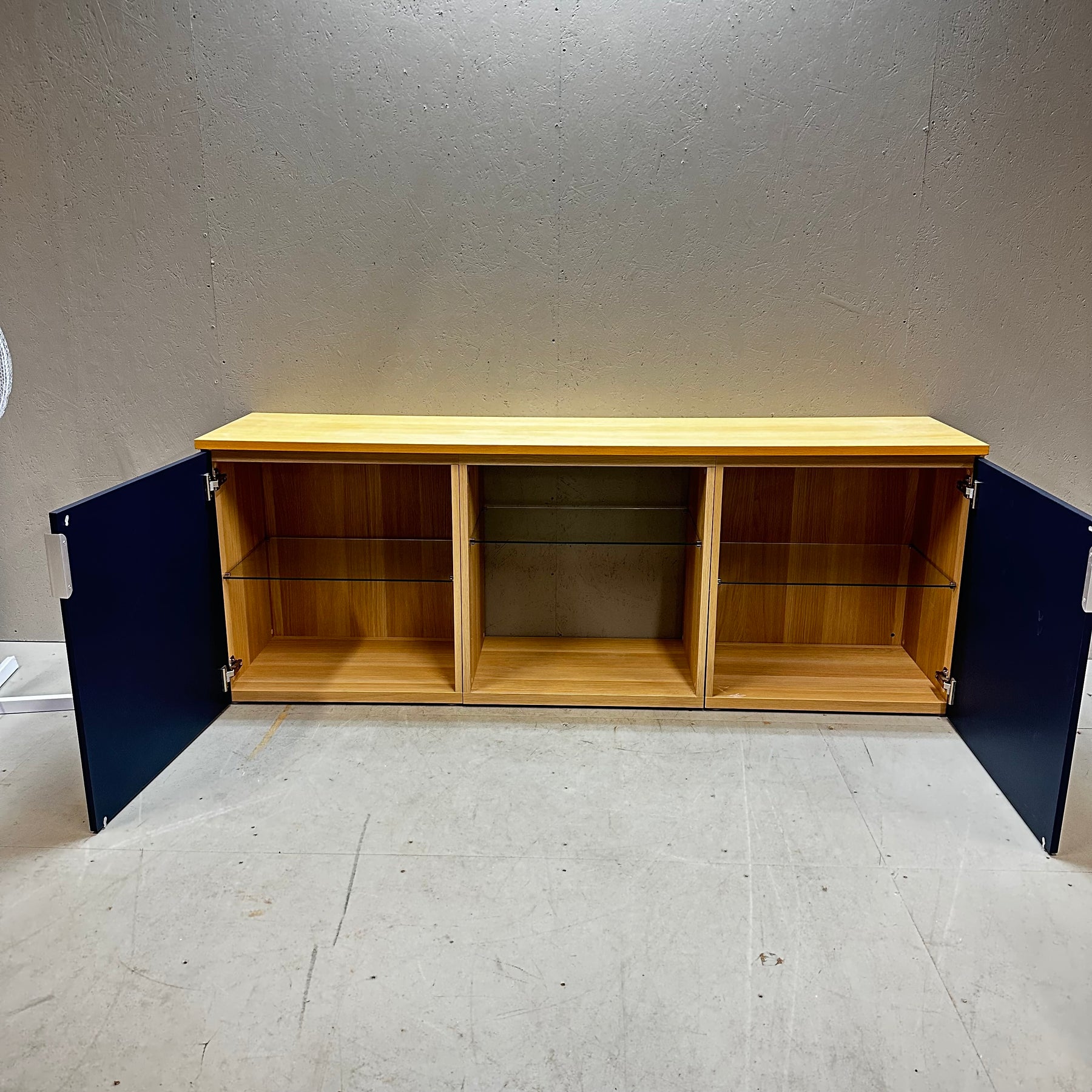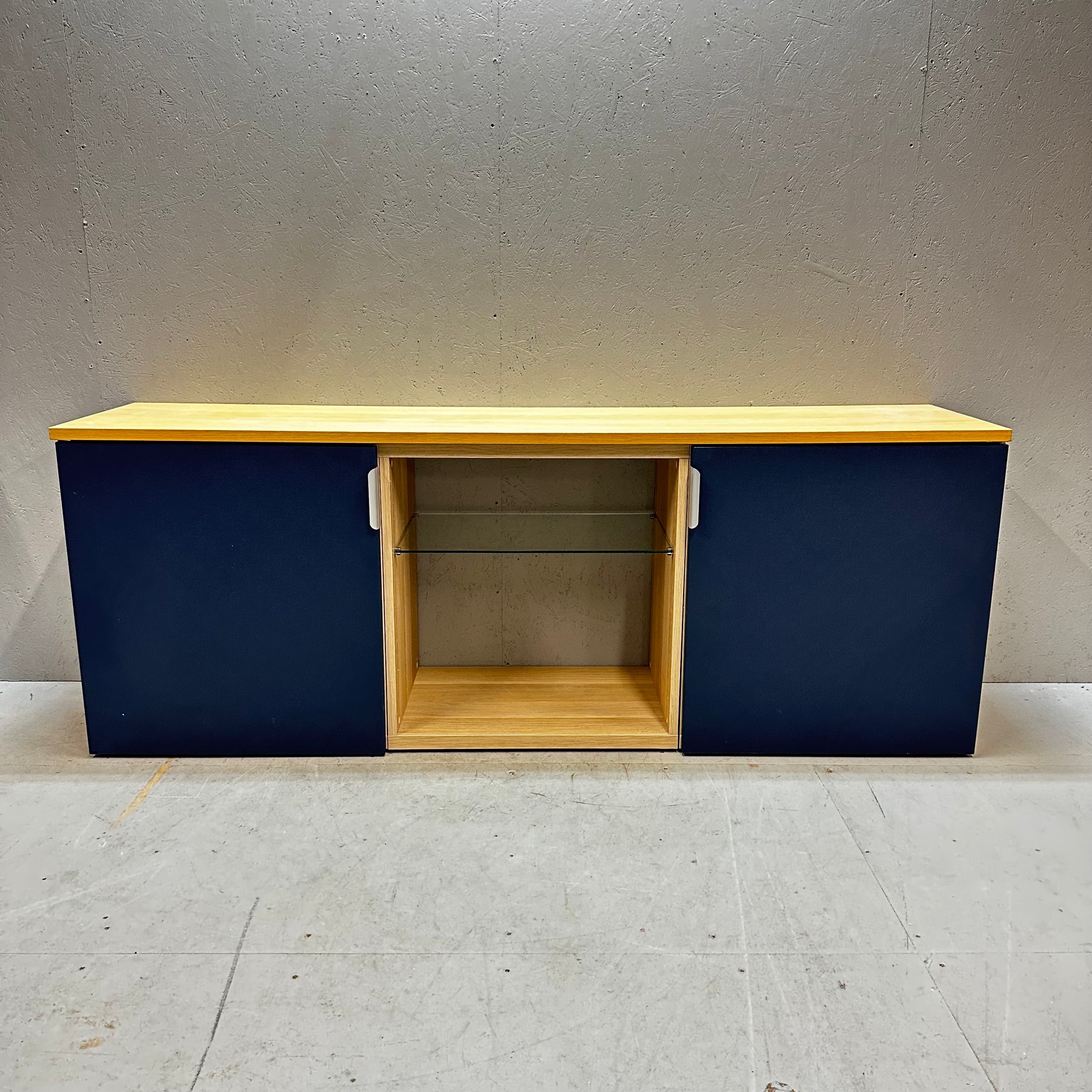 Denna mediabänk kombinerar elegans och funktionalitet med dess moderna design och rymliga förvaringsmöjligheter. Utformad med två skjutdörrar och en öppen mittsektion, ger den gott om plats för dina enheter och media tillbehör. Möbeln är mörkblå och ljusbrun vilket bidrar till en attraktiv tvåtonseffekt. Skicket är begagnat men mycket gott, vilket gör den till ett utmärkt köp för den designmedvetna.