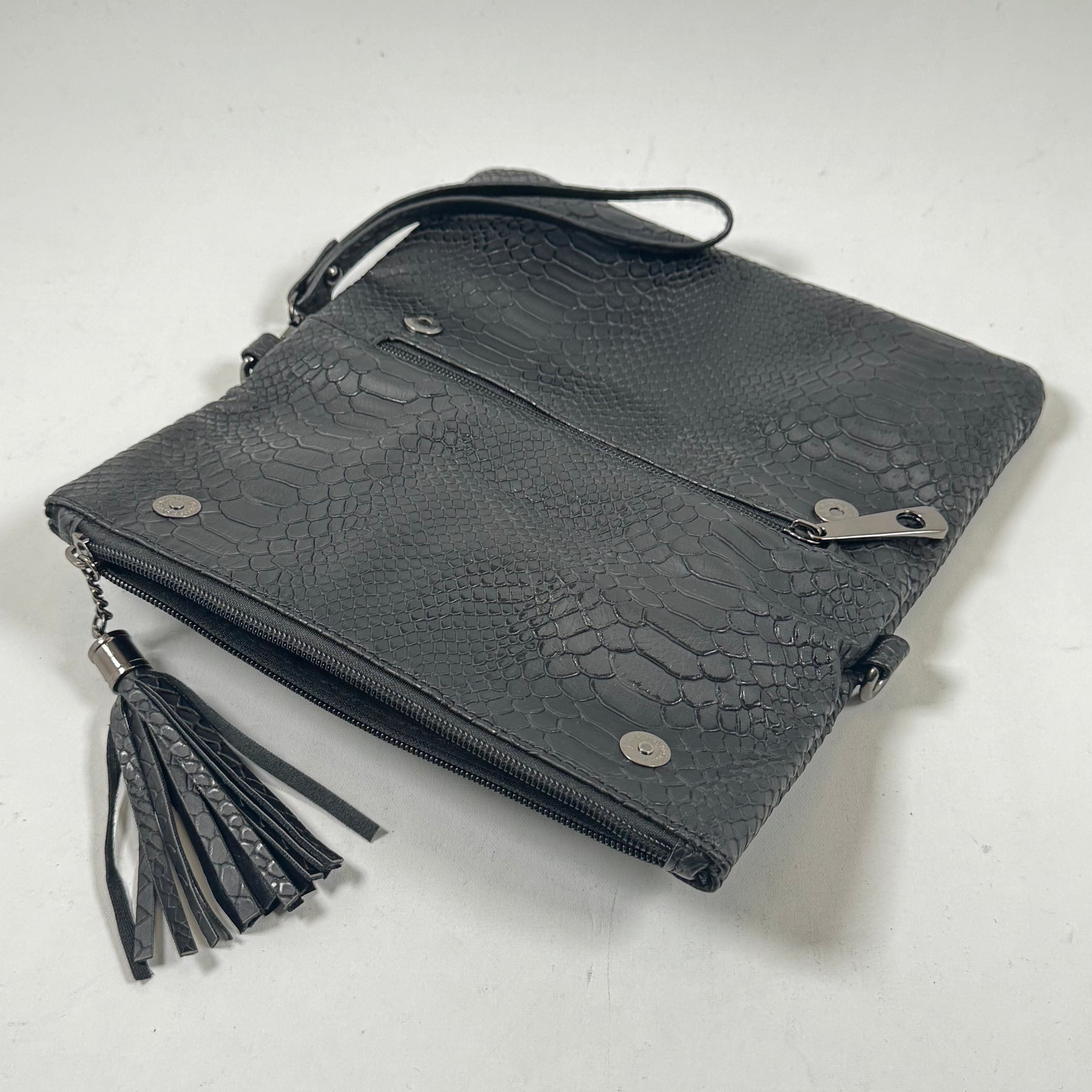 Elegant svart axelväska i konstläder med krokodilprägling
