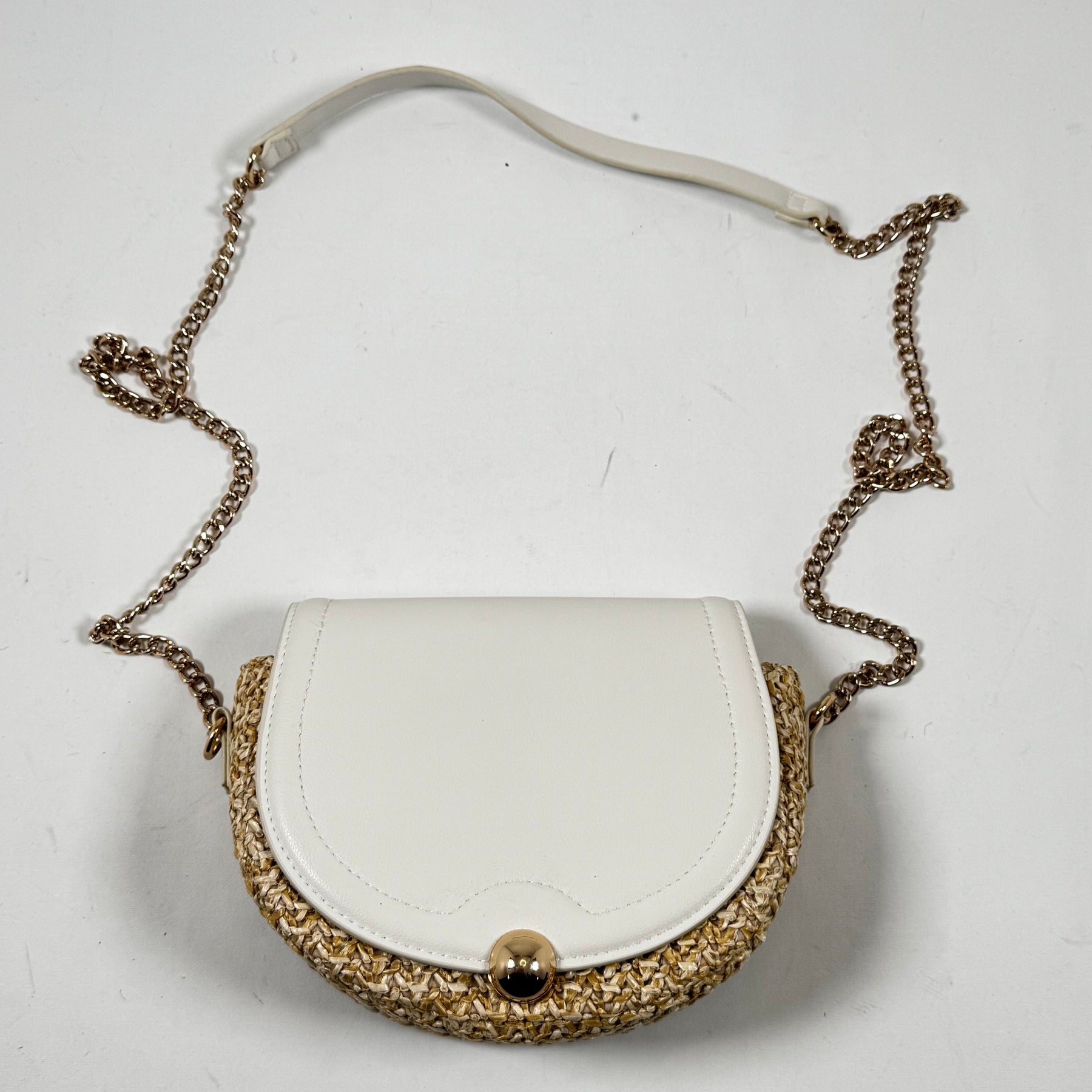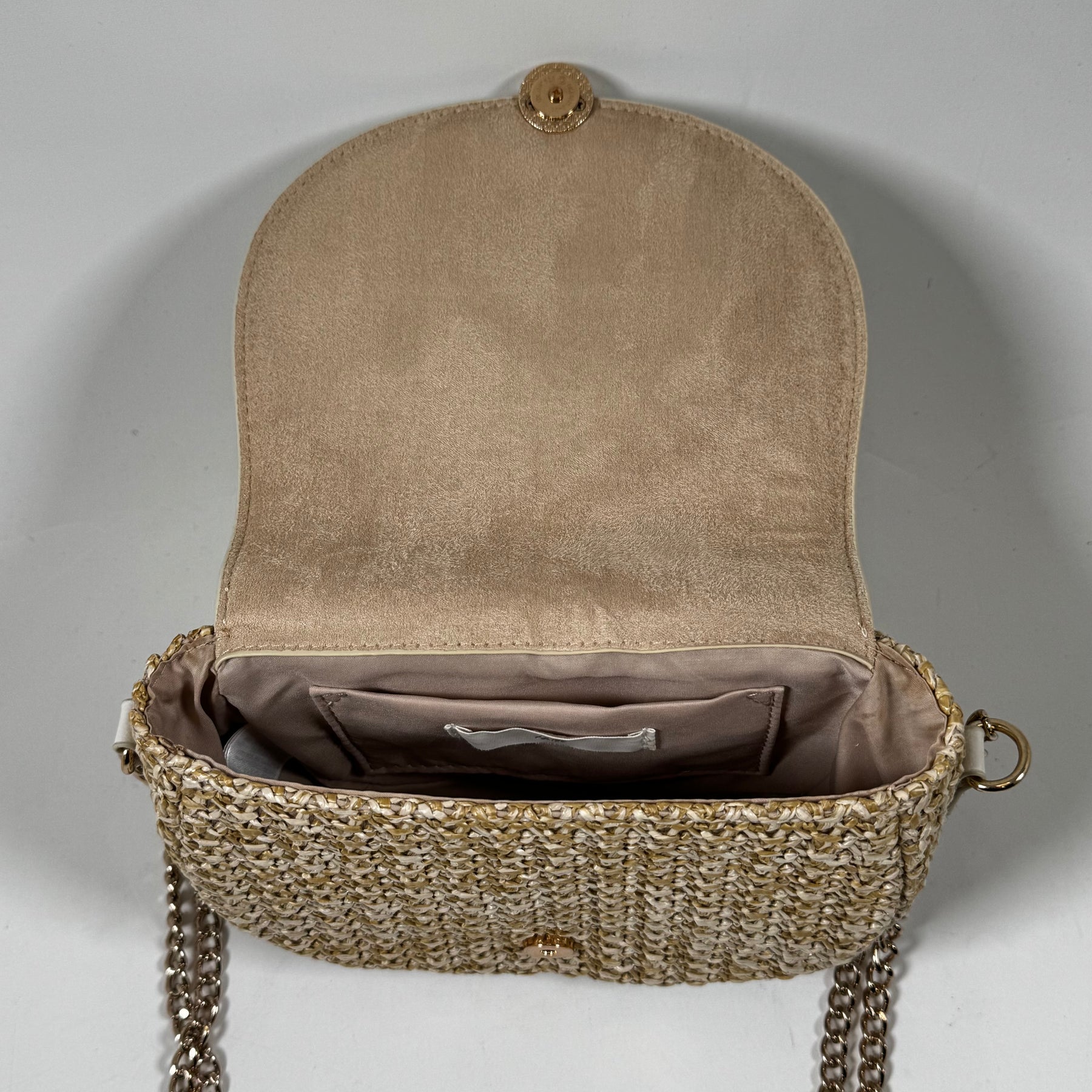 Denna charmiga axelremsväska från H&M kombinerar funktionalitet med stil. Väskan har en bekväm metallkedjerem och en charmig front i flätat material. Den neutrala färgsättningen gör den till ett utmärkt val för både vardag och fest. Skicket är begagnat men mycket gott, vilket gör detta till ett smart och hållbart köp.Produktspecifikationer