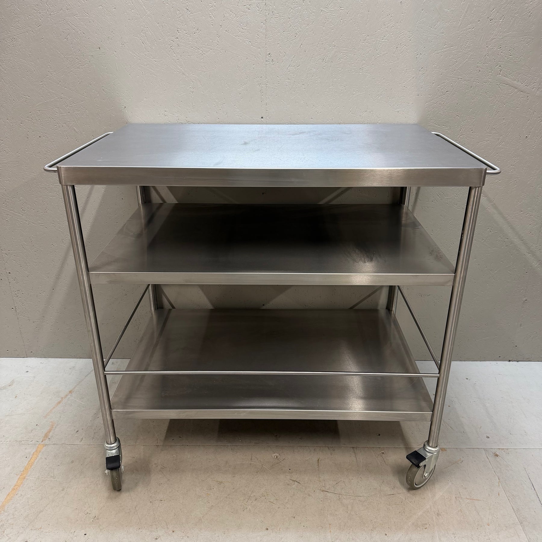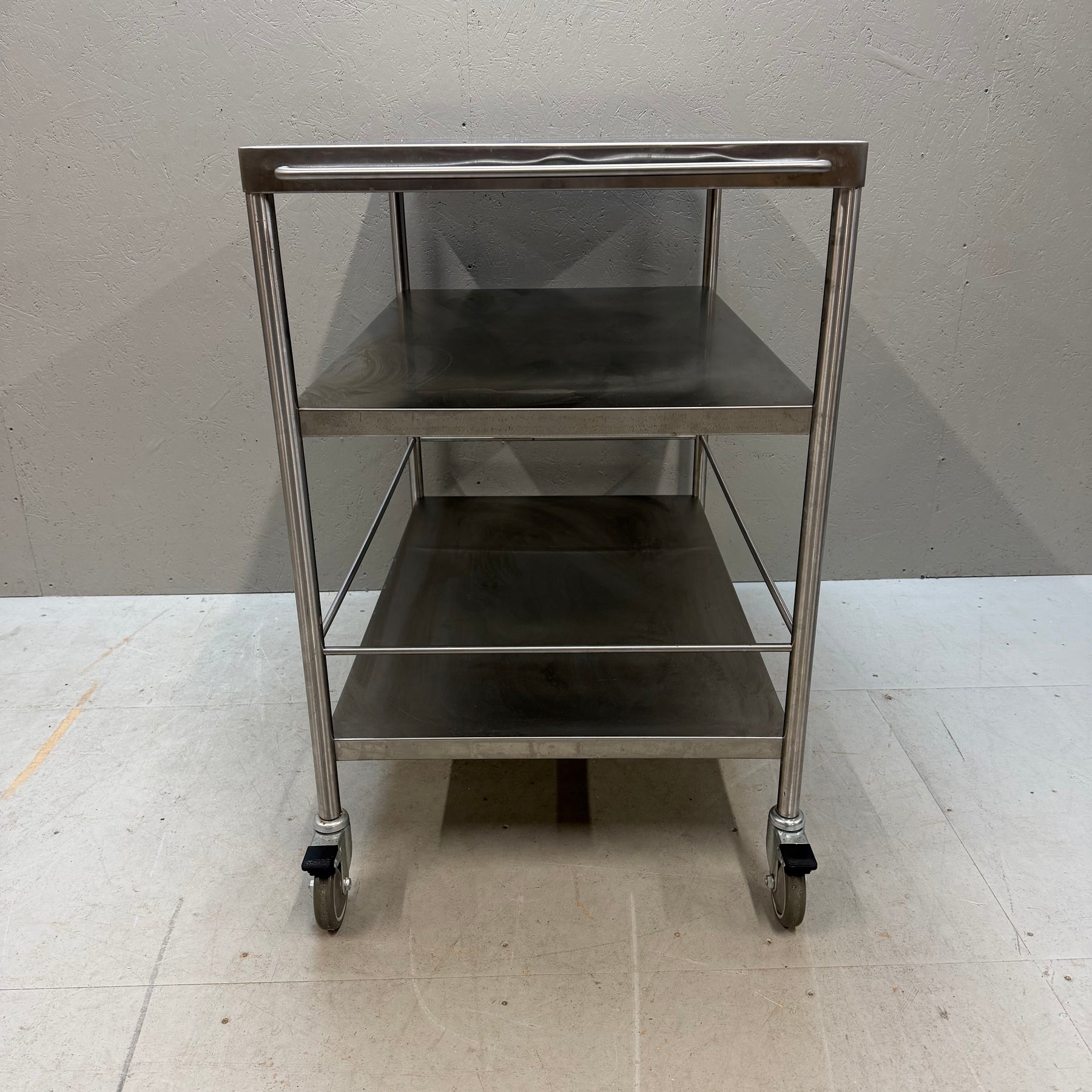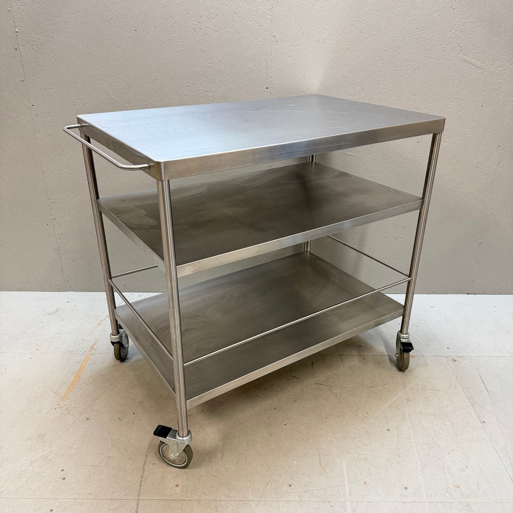 Denna serveringsvagn i rostfritt stål är inte bara robust utan också mycket mångsidig med sina tre rymliga hyllplan och hjul för enkel förflyttning. Perfekt för både hemmabruk och professionella miljöer där ett mobilt serveringsalternativ önskas. Vagnen är i mycket gott skick, vilket gör den till ett utmärkt val för alla som värderar hållbarhet och stil.