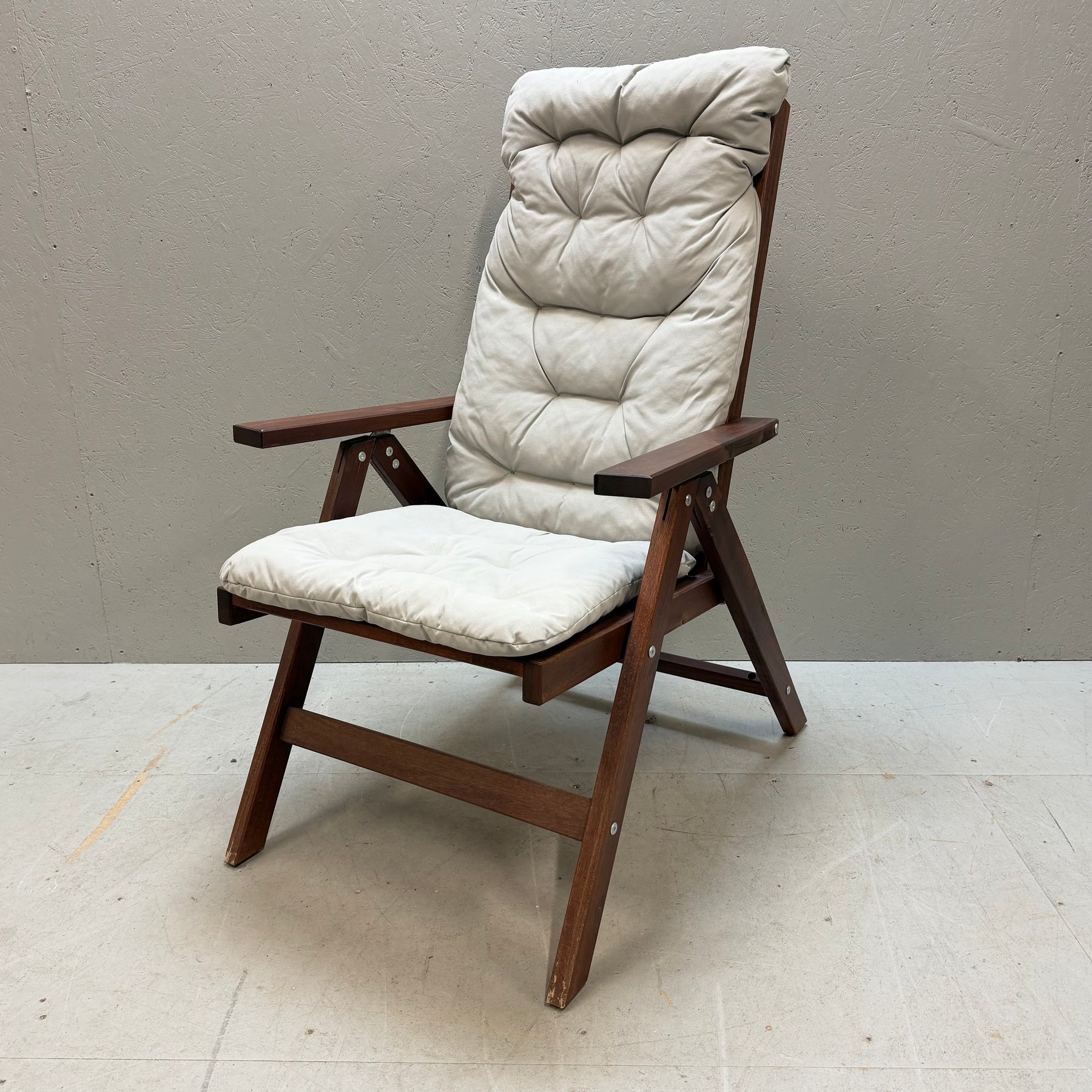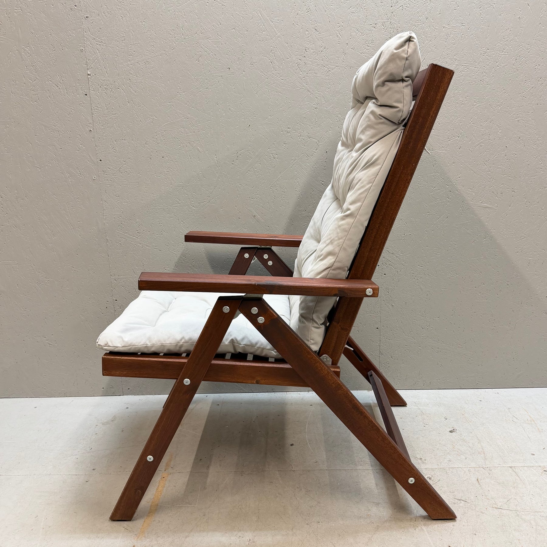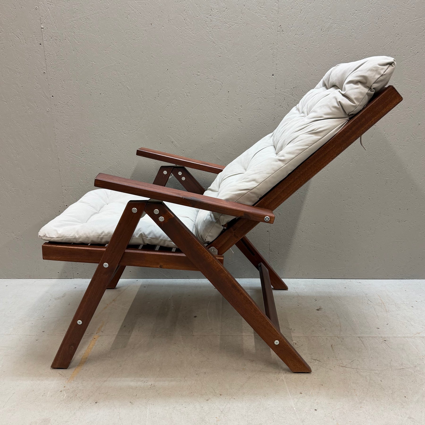 Denna solstol är inte bara en möbel, utan en stilfull och praktisk tillägg till ditt uterum eller trädgård. Med sitt robusta utförande i mörkt trä och bekväma, tjocka vita dynor erbjuder den optimal komfort. Perfekt för avkopplande dagar i solen! Solstolen är begagnad men mycket välvårdad och håller hög kvalitet.Produktspecifikationer