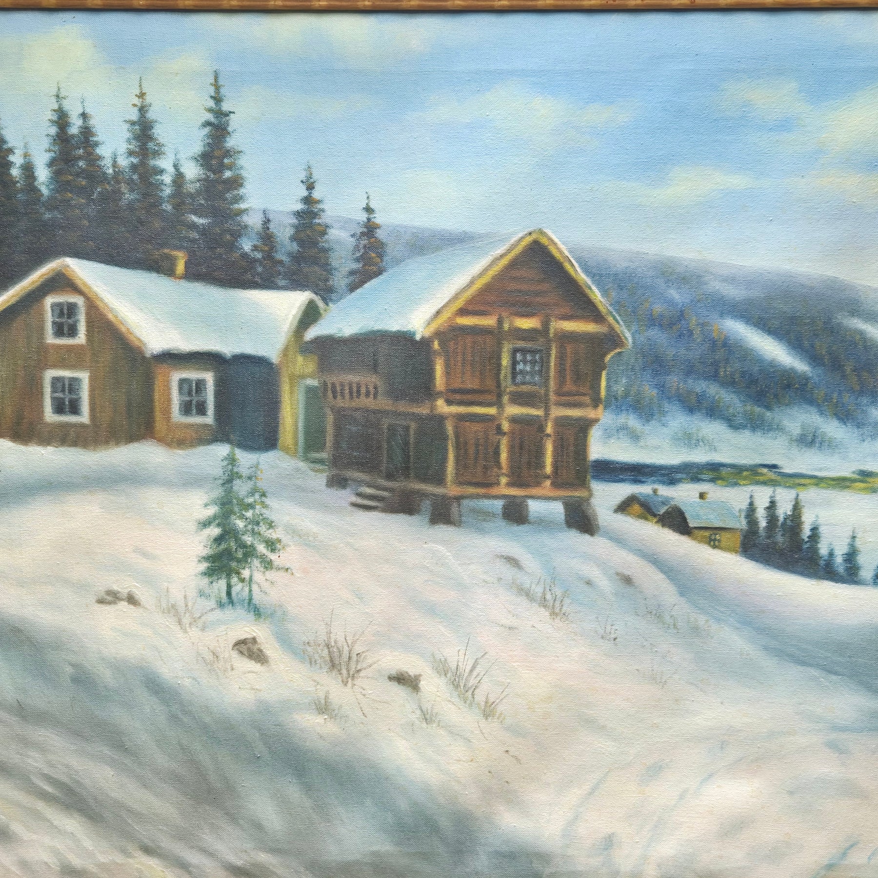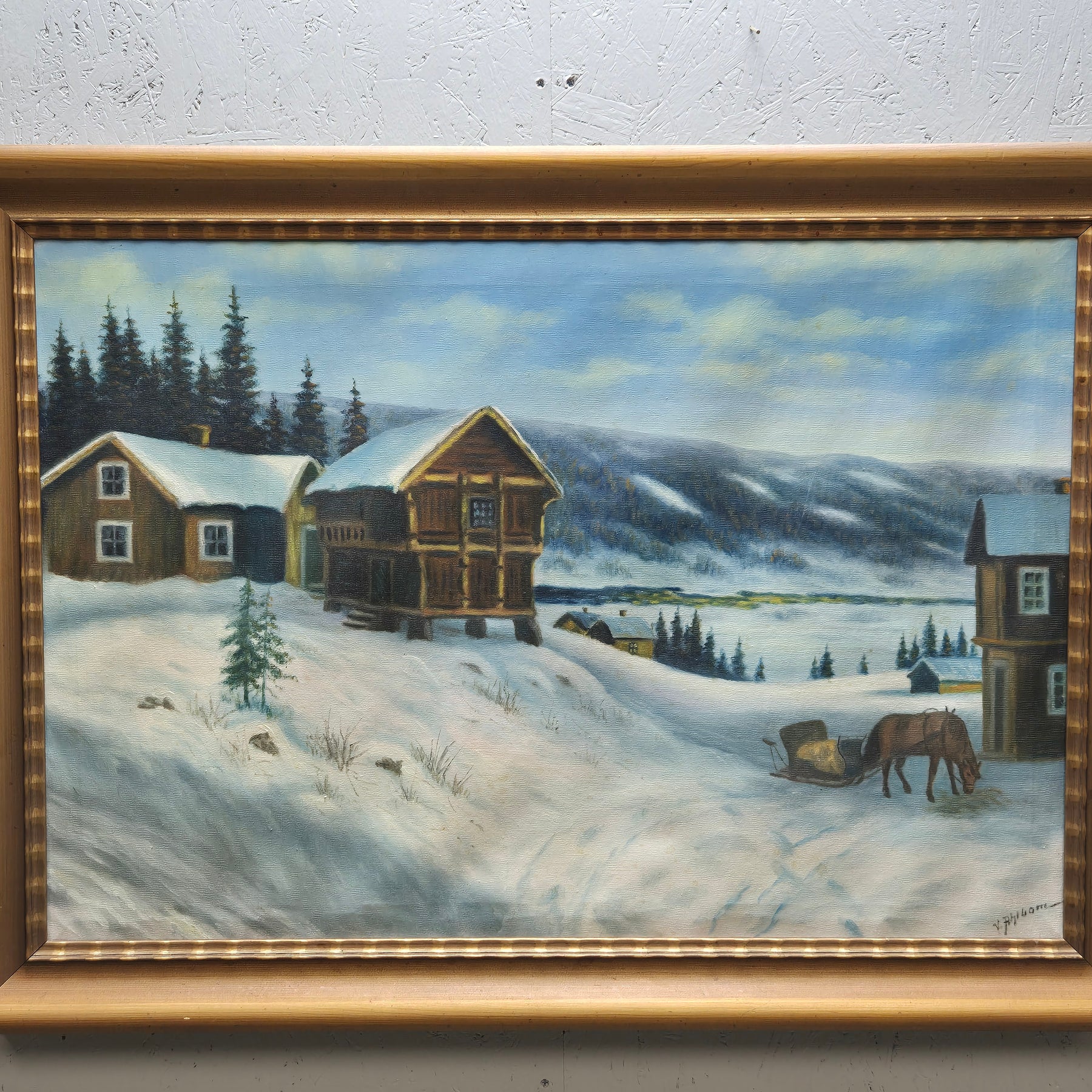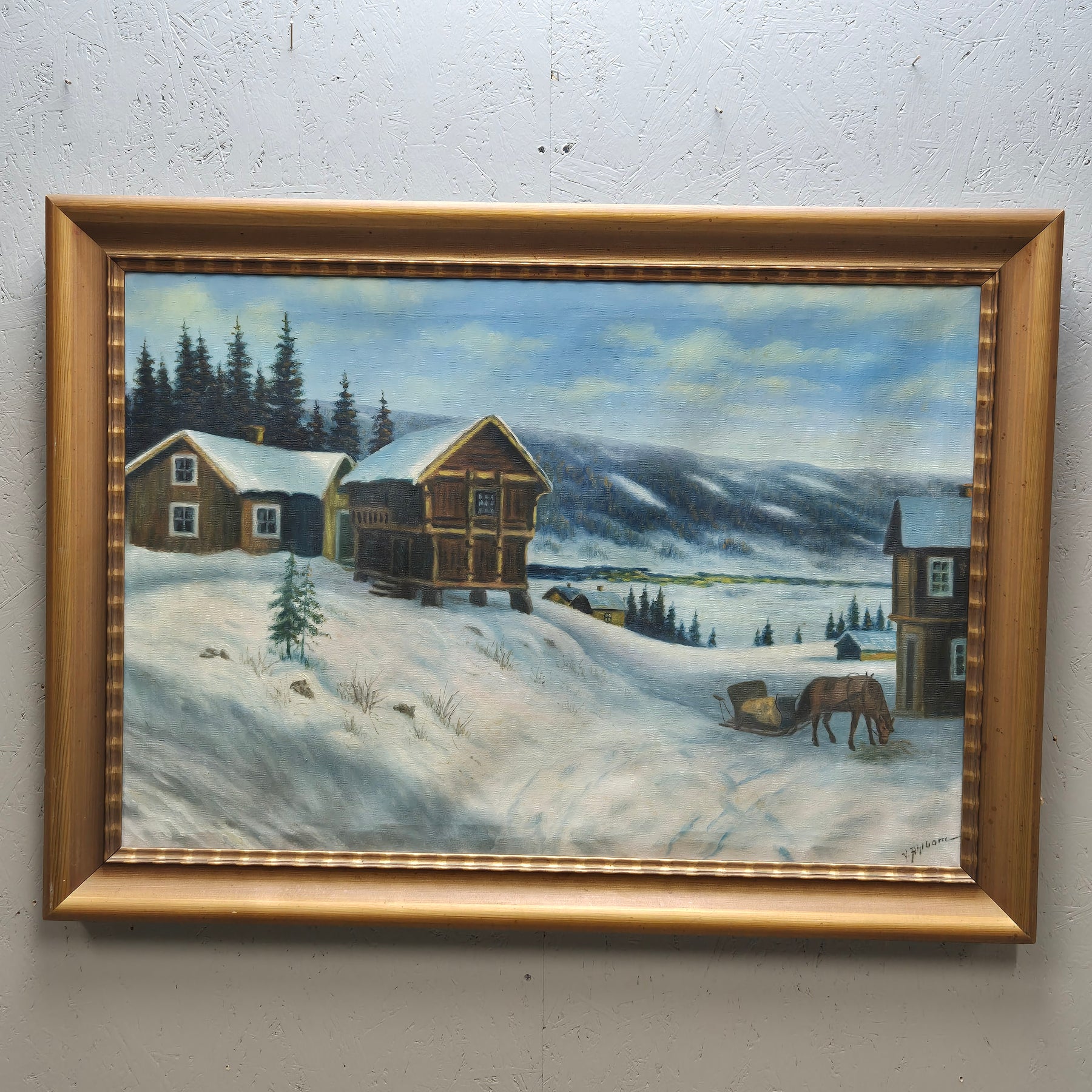 Denna oljemålning skildrar en idyllisk vinterlandskap med snöklädda stugor och en ensam häst, framför pittoreska bergen. Konstverket utstrålar en känsla av lugn och är målat med imponerande detaljrikedom, vilket gör det till en perfekt inredningsdetalj för alla som uppskattar rustik och naturnära estetik. Verket är begagnat men välbevarat och andas en tidlös charm.
