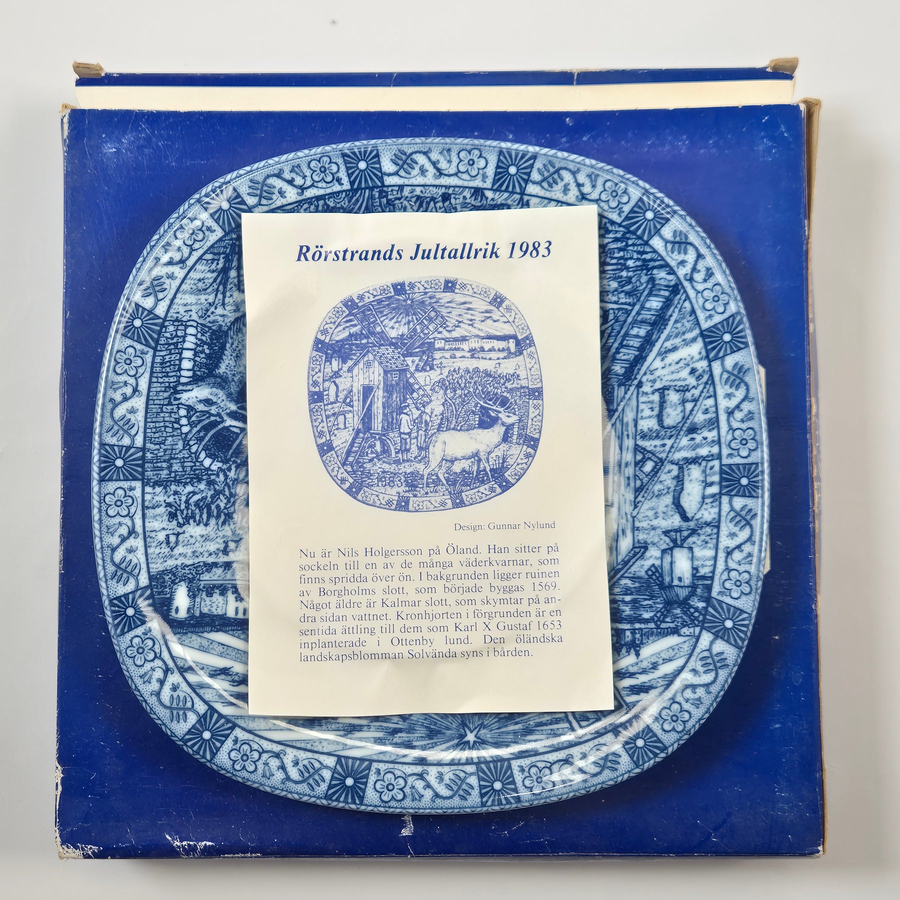Charmig samlartallrik från Rörstrand, Julen 1983, med vacker blåvit dekoration och tidstypisk motivrik detaljering.
