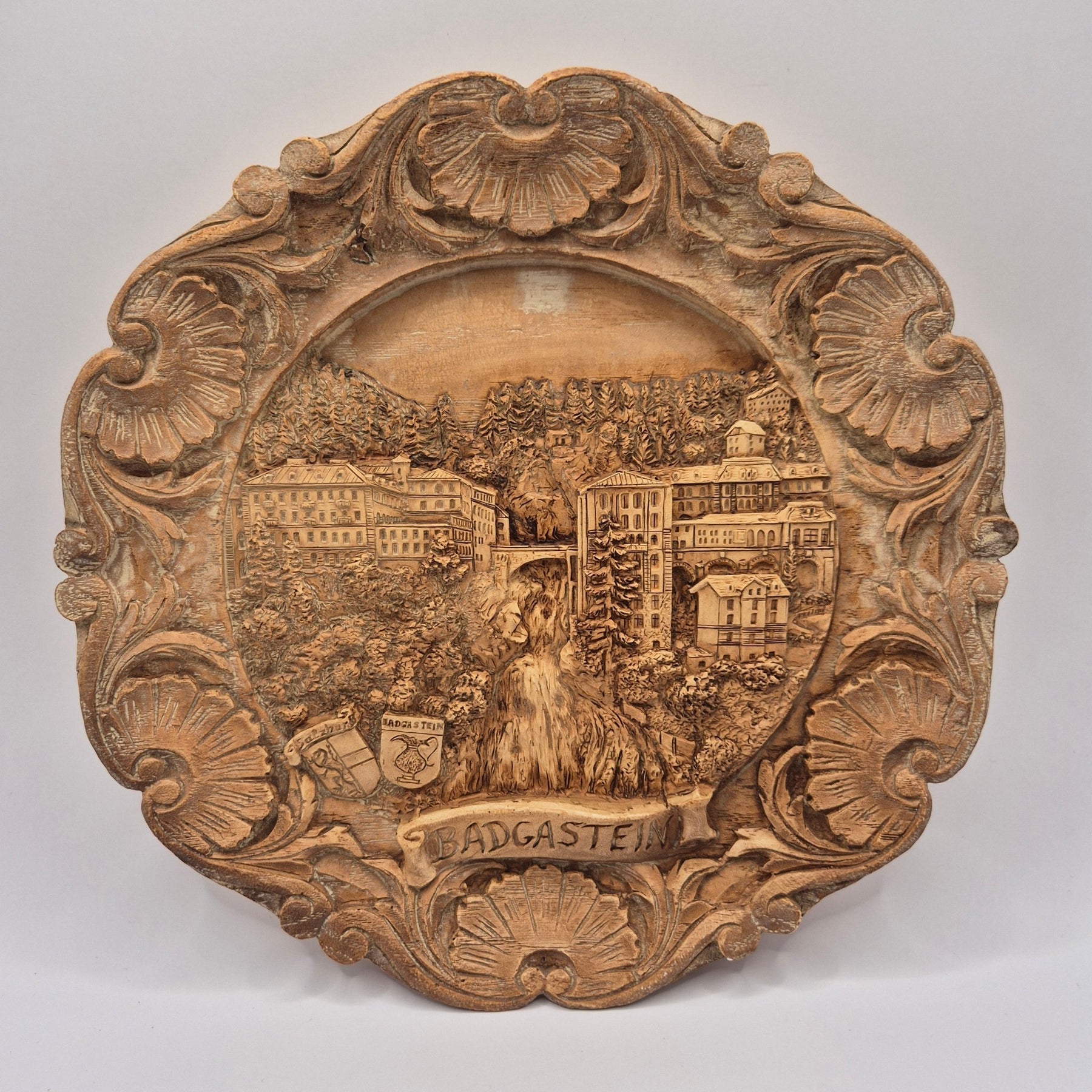 En vacker, handgjord platta med detaljerat snidat motiv av Bad Gastein, en känd alpstad i Österrike. Plattan har ett elegant, ornamenterat ramverk och visar en konstnärlig avbildning av stadens arkitektur och naturliga landskap, inklusive vattenfallet. Perfekt som väggdekoration för hemmet eller som en samlarartikel för älskare av alpina souvenirer.