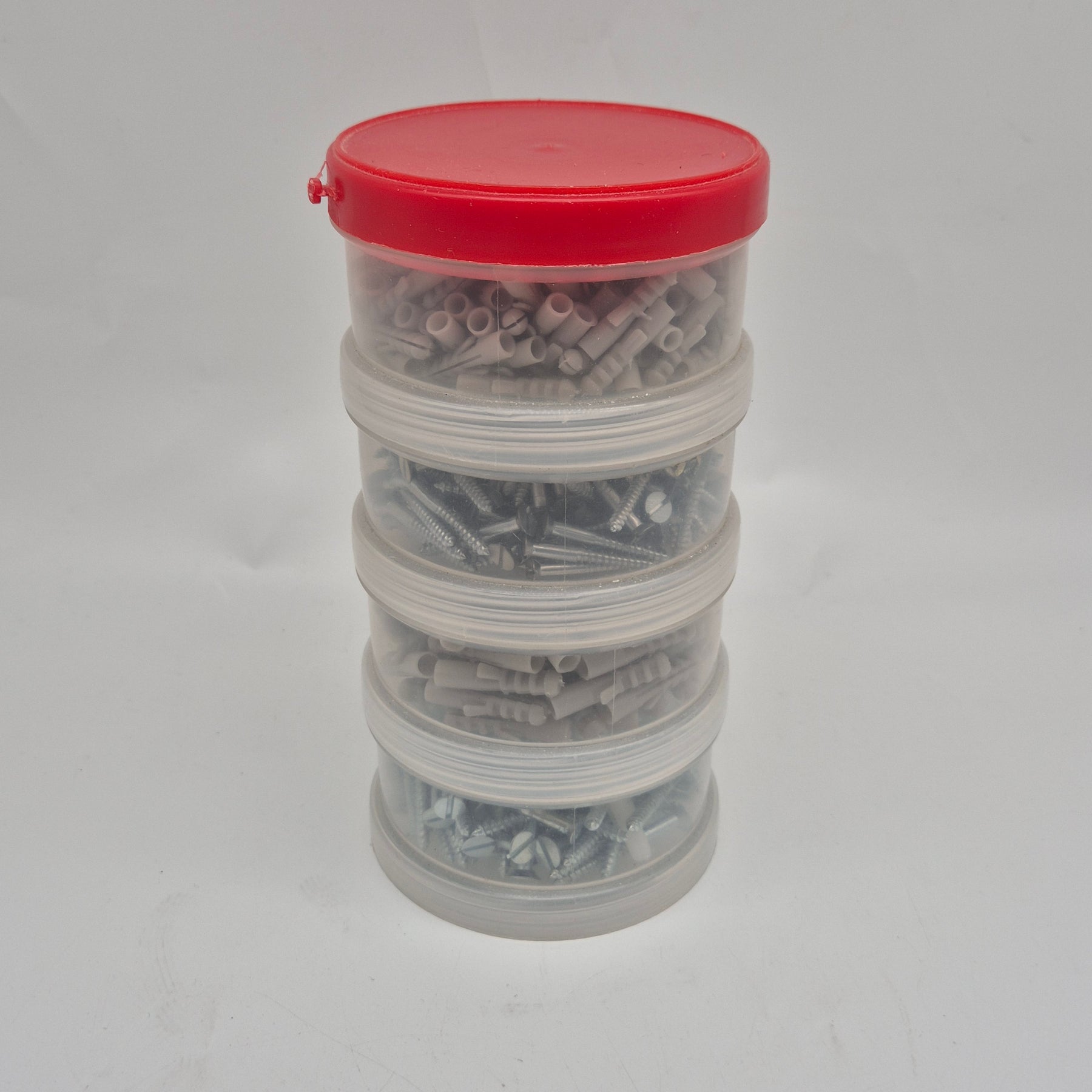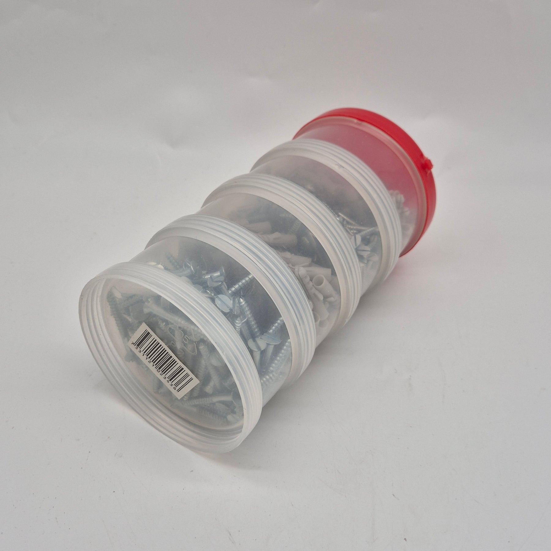 Praktiskt set med blandade skruvar och plugg, förvarade i en stapelbar plastburk med fyra separata fack.