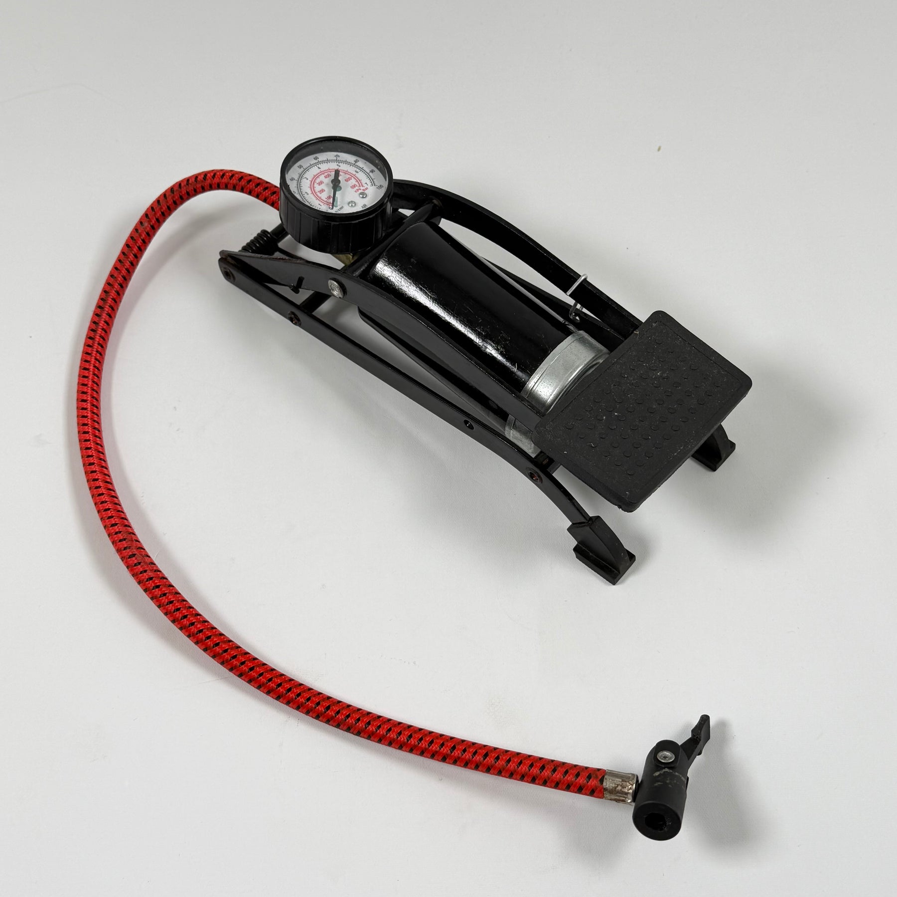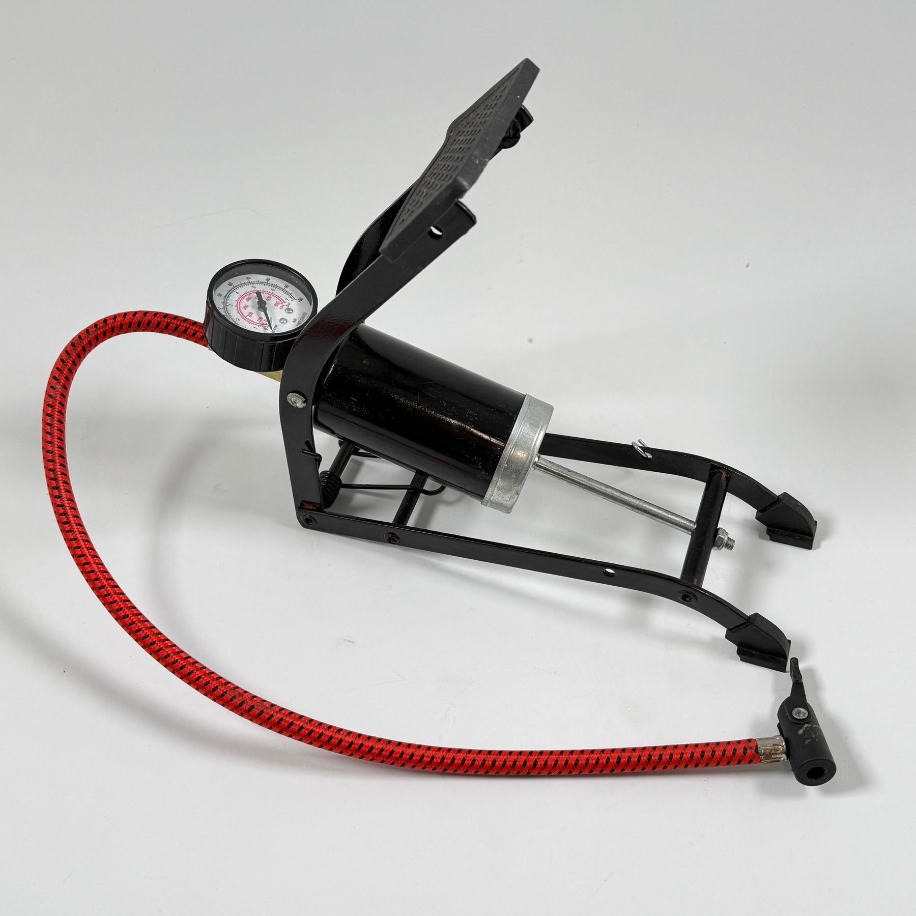 Denna fotpump är utformad för att ge en smidig och överkomlig lösning för att pumpa dina cykeldäck och sportutrustning. Med en svart finish och röd slang, är det inte bara en funktionell utan också en stilren tillägg till dina verktyg. Pumpen är utrustad med en robust tryckmätare som är lätt att läsa av. Den är perfekt för alla som letar efter en effektiv och hållbar pump. Begagnad men i mycket gott skick.