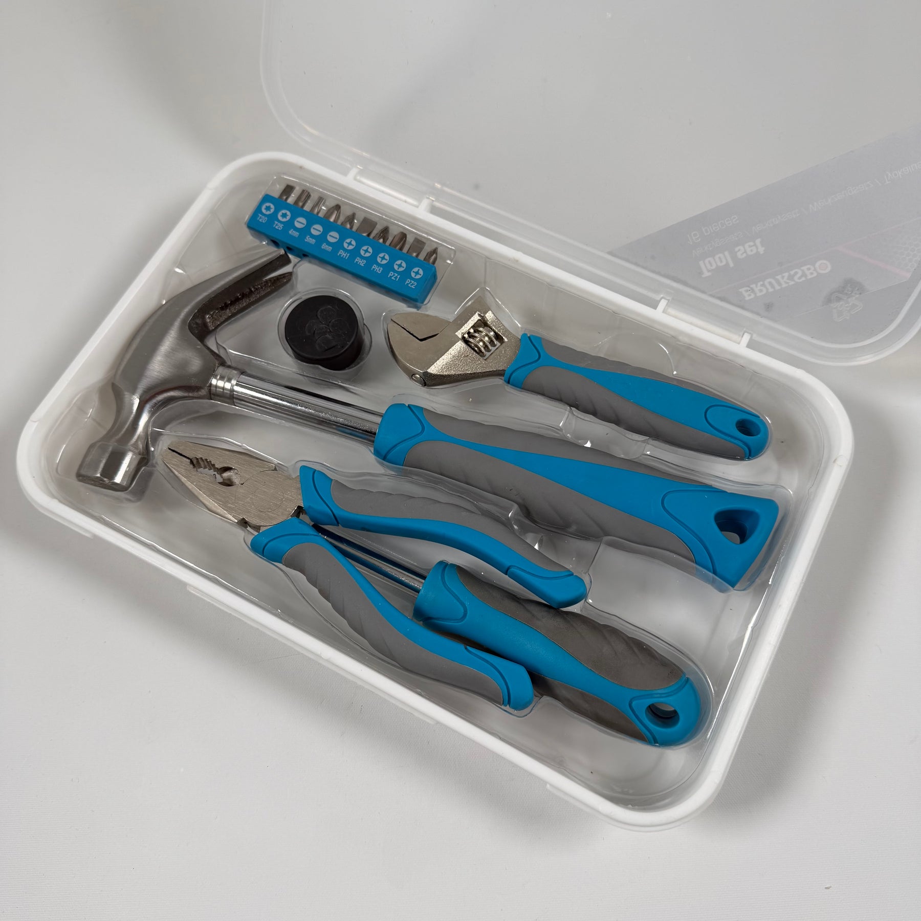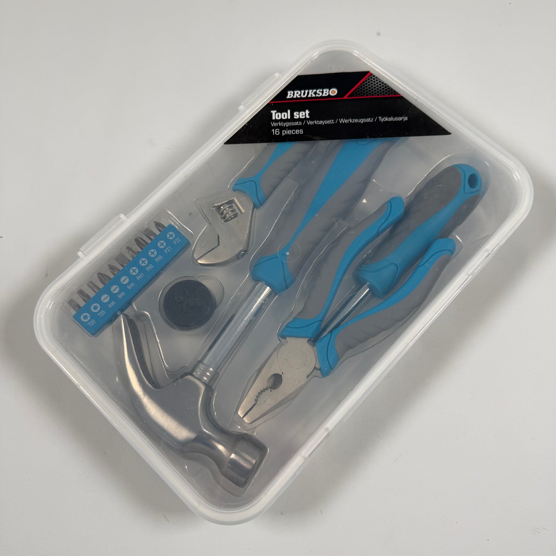 Denna 16-delars verktygssats från Bruksbo innehåller allt du behöver för hemmareparationer och -projekt. Setet inkluderar hammare, tänger, skiftnyckel och en skruvmejselsats med olika bits, alla med ergonomiska handtag för bästa komfort. Verktygen är välorganiserade i en genomskinlig, robust plastlåda som är enkel att förvara och transportera. Produkten är begagnad men fortfarande i mycket gott skick - perfekt för både vardagligt bruk och som en pålitlig del av din verktygssamling.