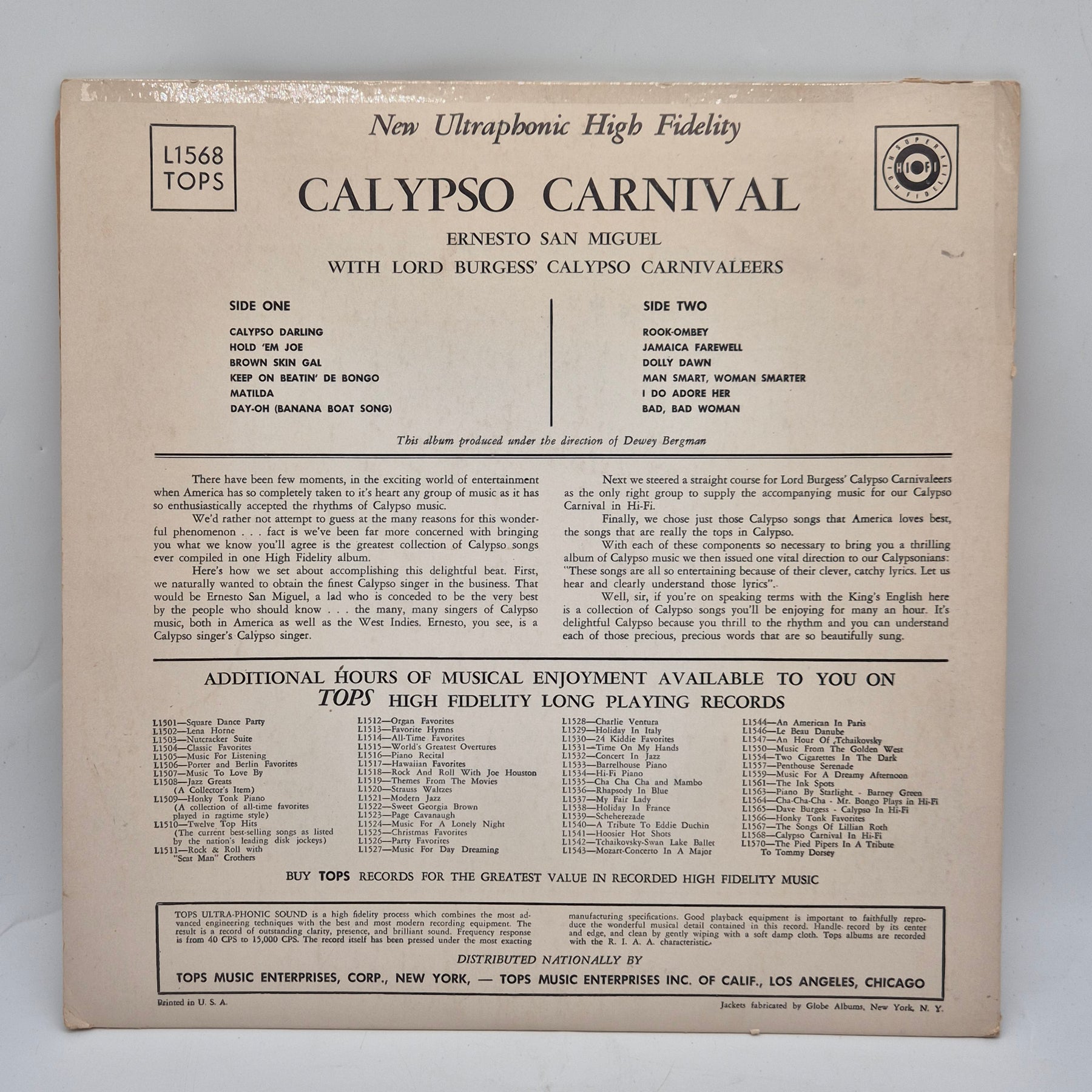 Denna vinylskiva från märket TOPS erbjuder en unik samling Calypsomusik med artister som Ernesto San Miguel och Lord Burgess Calypso Carnivaleers. Albumet är en nostalgisk skatt för musikälskare med ett öra för klassisk och rytmisk Calypso. Det är inte bara en musikupplevelse utan också en tidskapsel full av kulturell historia. Skivan är begagnad men i mycket gott skick, vilket gör den till ett perfekt tillägg för samlare eller som en charmig dekoration i hemmet.