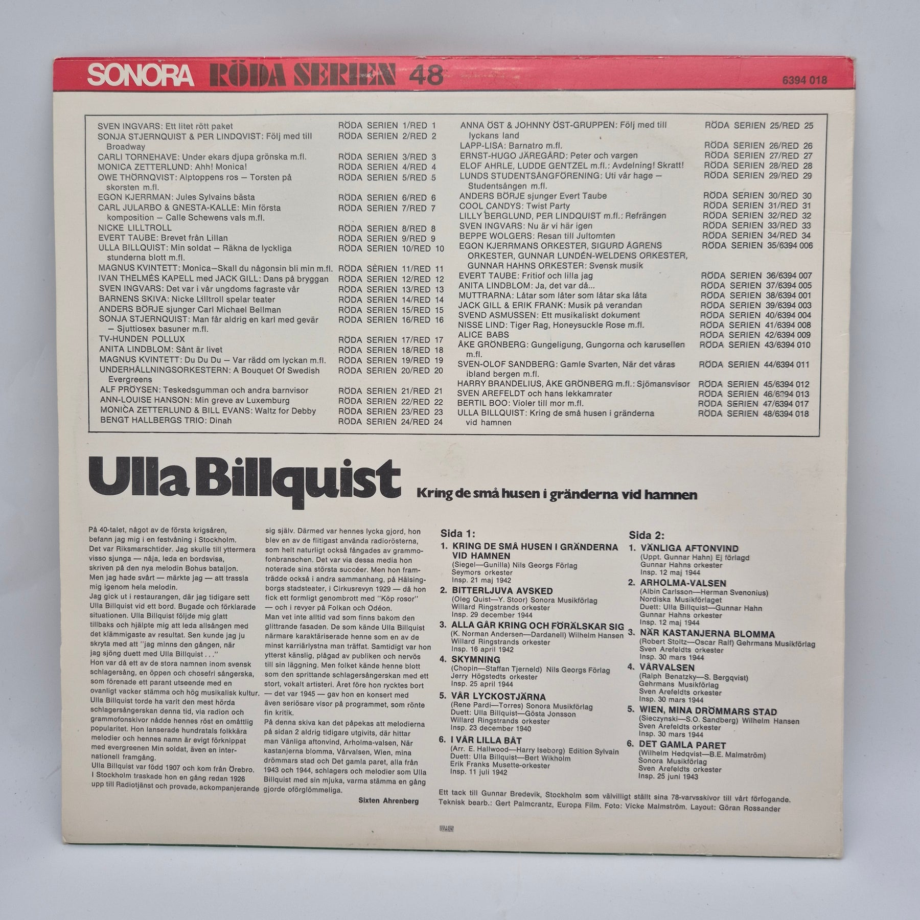Ulla Billquist var en av Sveriges mest älskade sångerskor under 1930- och 1940-talen, och denna skiva, "Kring de små husen i gränderna vid hamnen", erbjuder nostalgiska melodier från den eran. Detta samlarobjekt från Sonoras röda serie betonar Billquists karaktäristiska vocal. Skivan är begagnad men har bevarats i mycket gott skick och erbjuder en unik chans att återuppleva historiska svenska toner.Produktspecifikationer