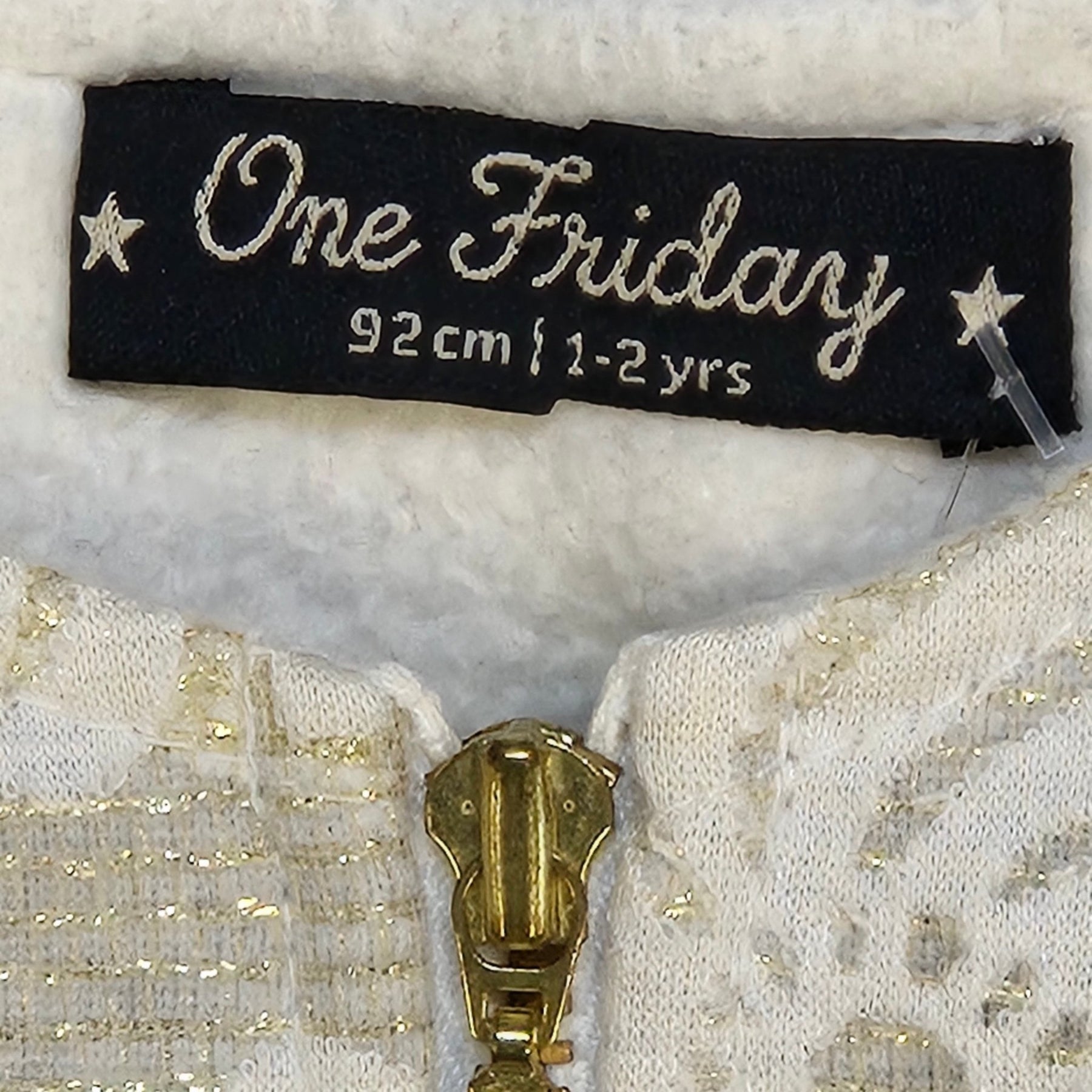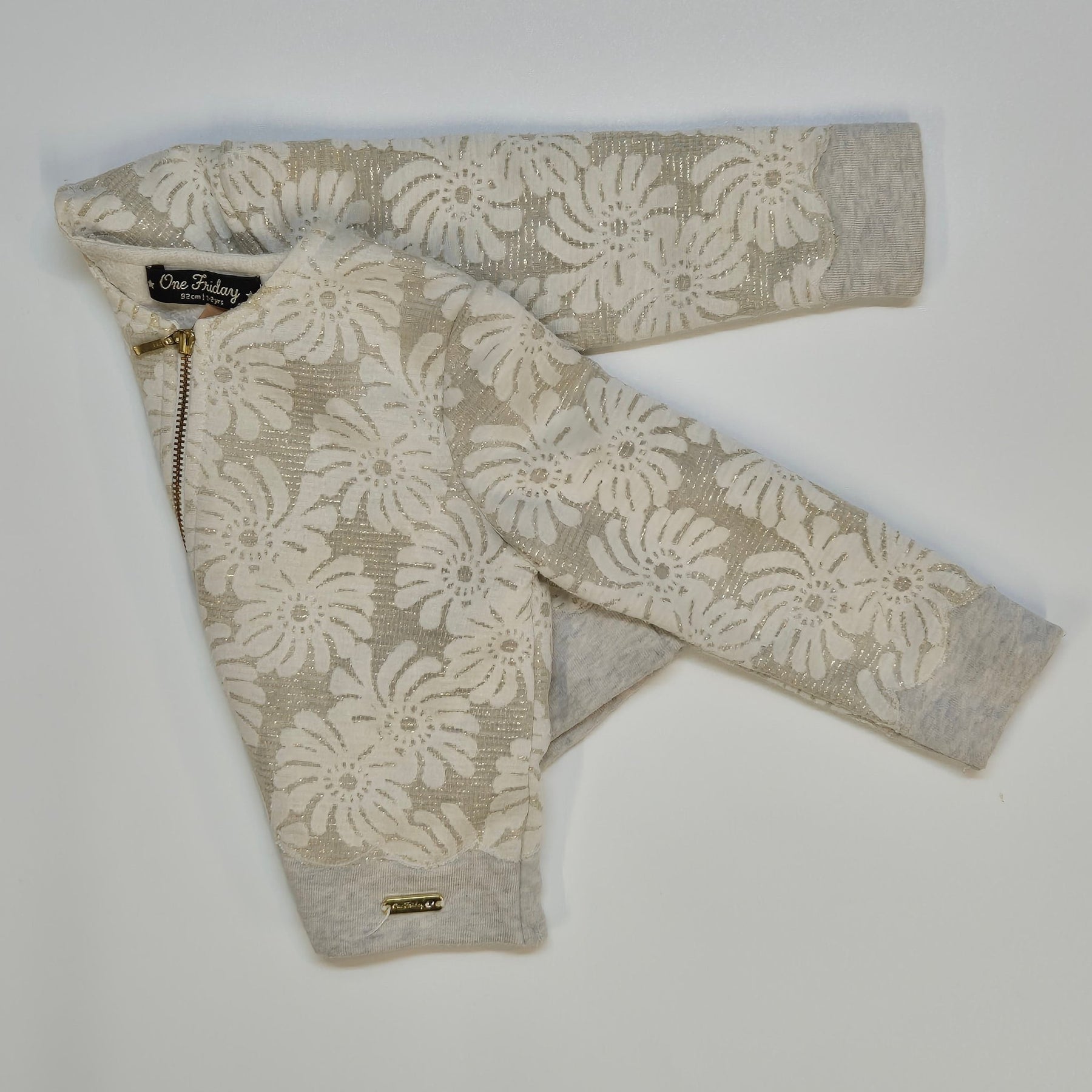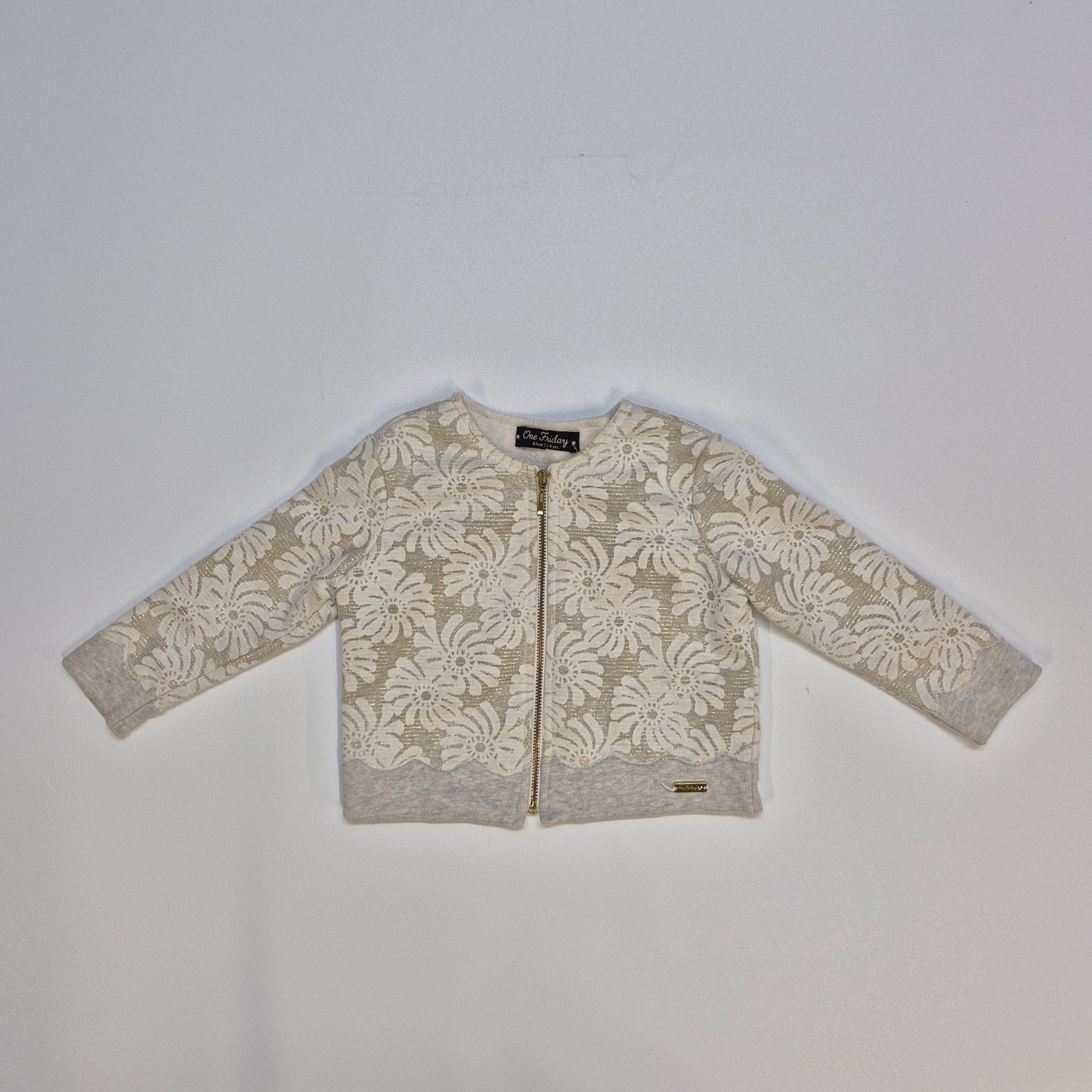 Charmig broderad barnjacka för barn mellan 1-2 år, idealisk för svalare dagar. Jackan är tillverkad av en mjuk tygblandning med detaljerade broderier. Den har ett använt skick men är väl underhållet och rent.