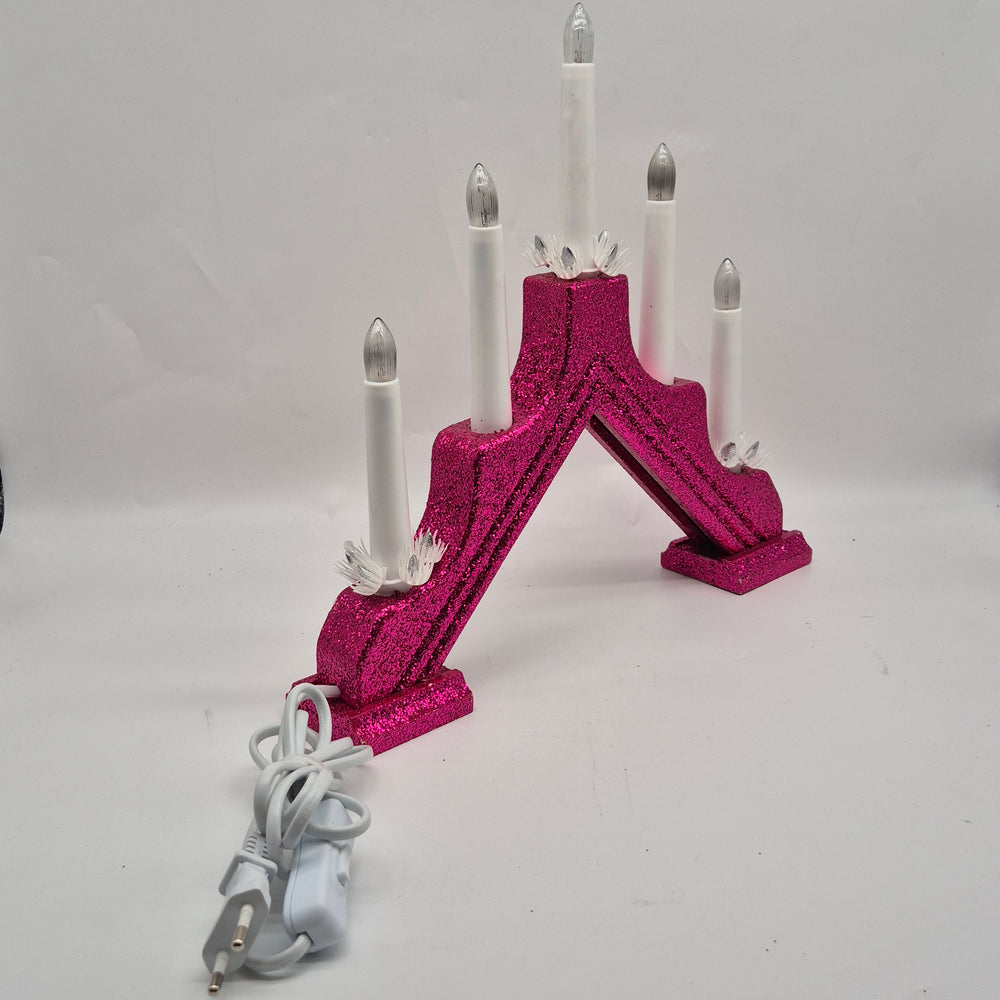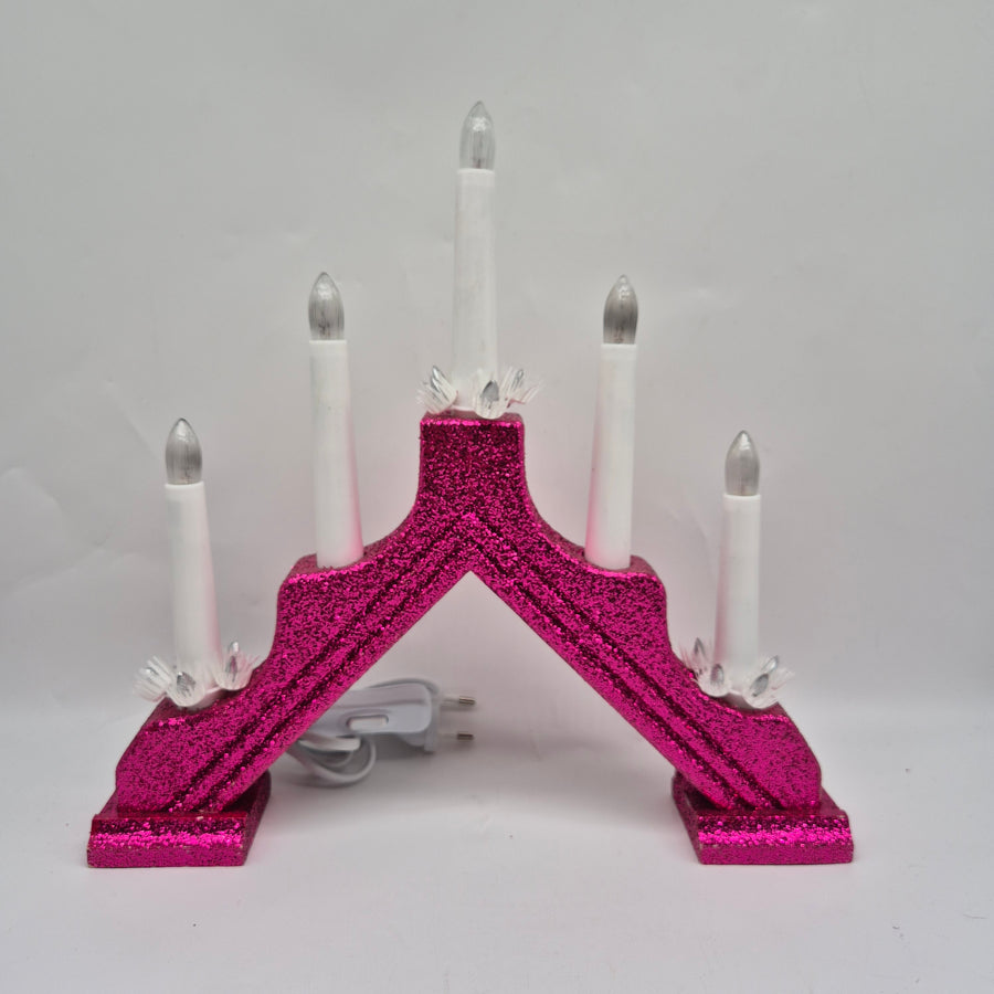 Denna iögonfallande adventsljusstake i rosa glitter kommer att lysa upp varje rum under julsäsongen. Dess moderna men ändå klassiska design gör den till ett perfekt komplement till din juldekoration. Idealisk för att skapa en varm, välkomnande atmosfär hemma. Ljusstaken är begagnad men i mycket gott skick, vilket gör den till ett hållbart val.Produktspecifikationer