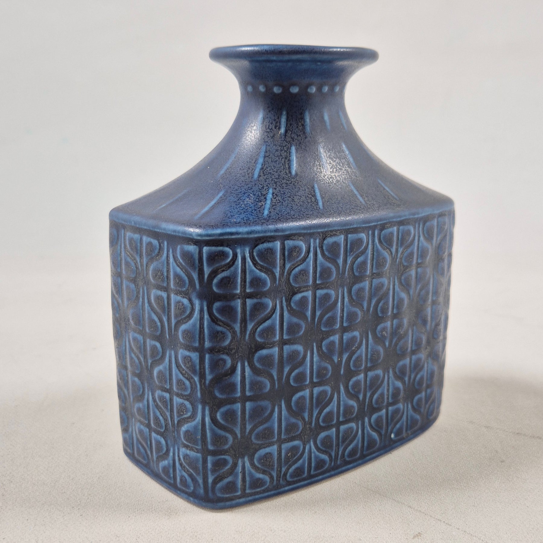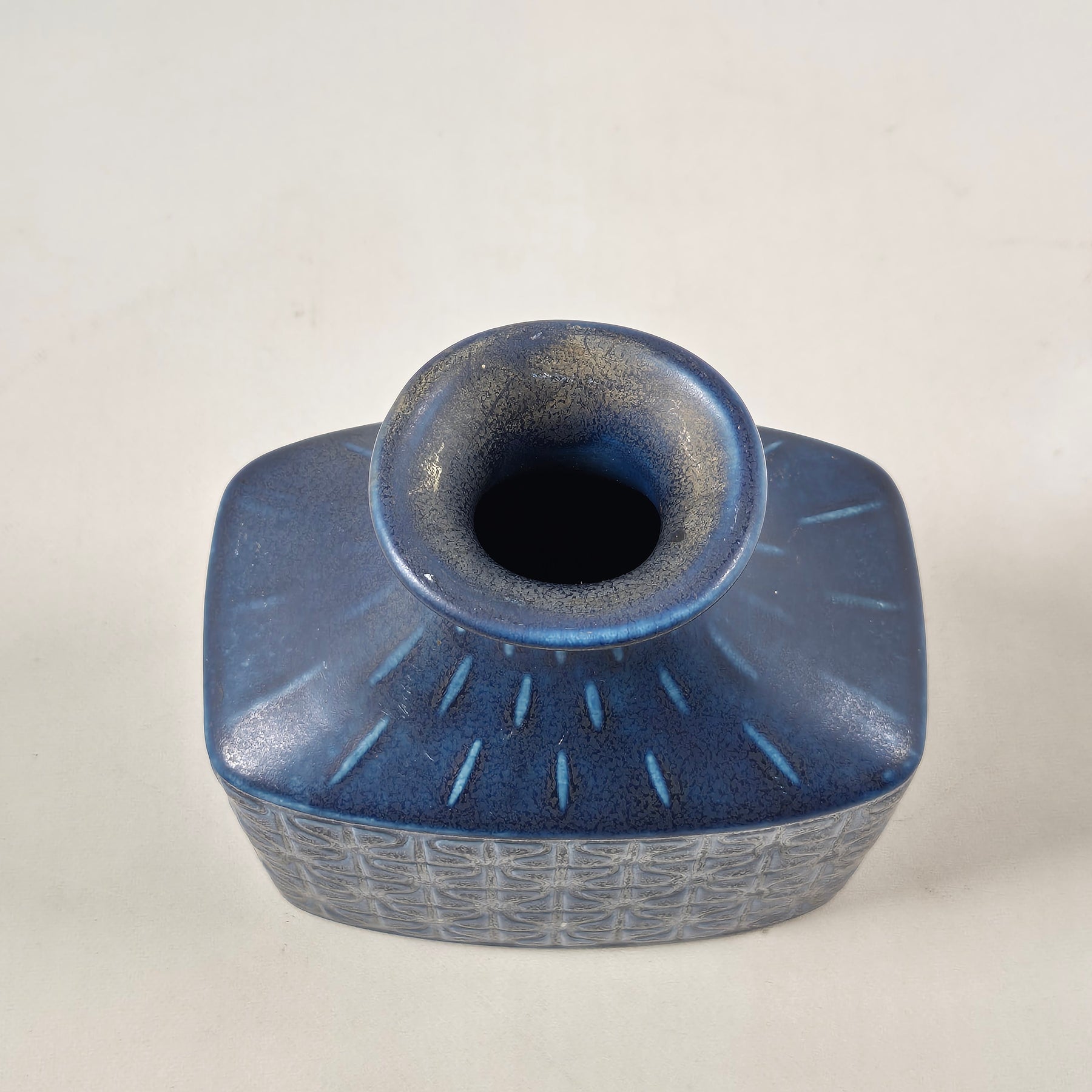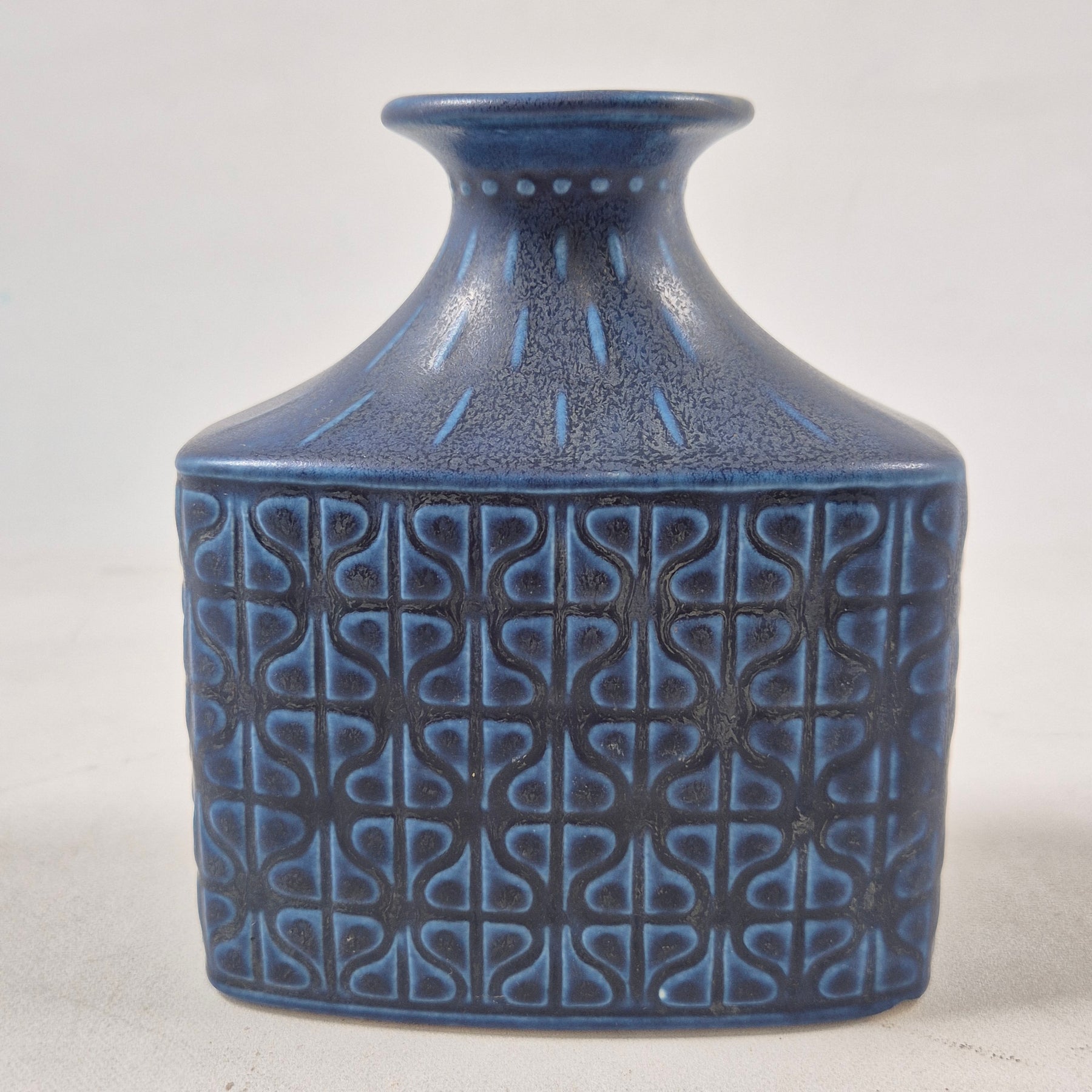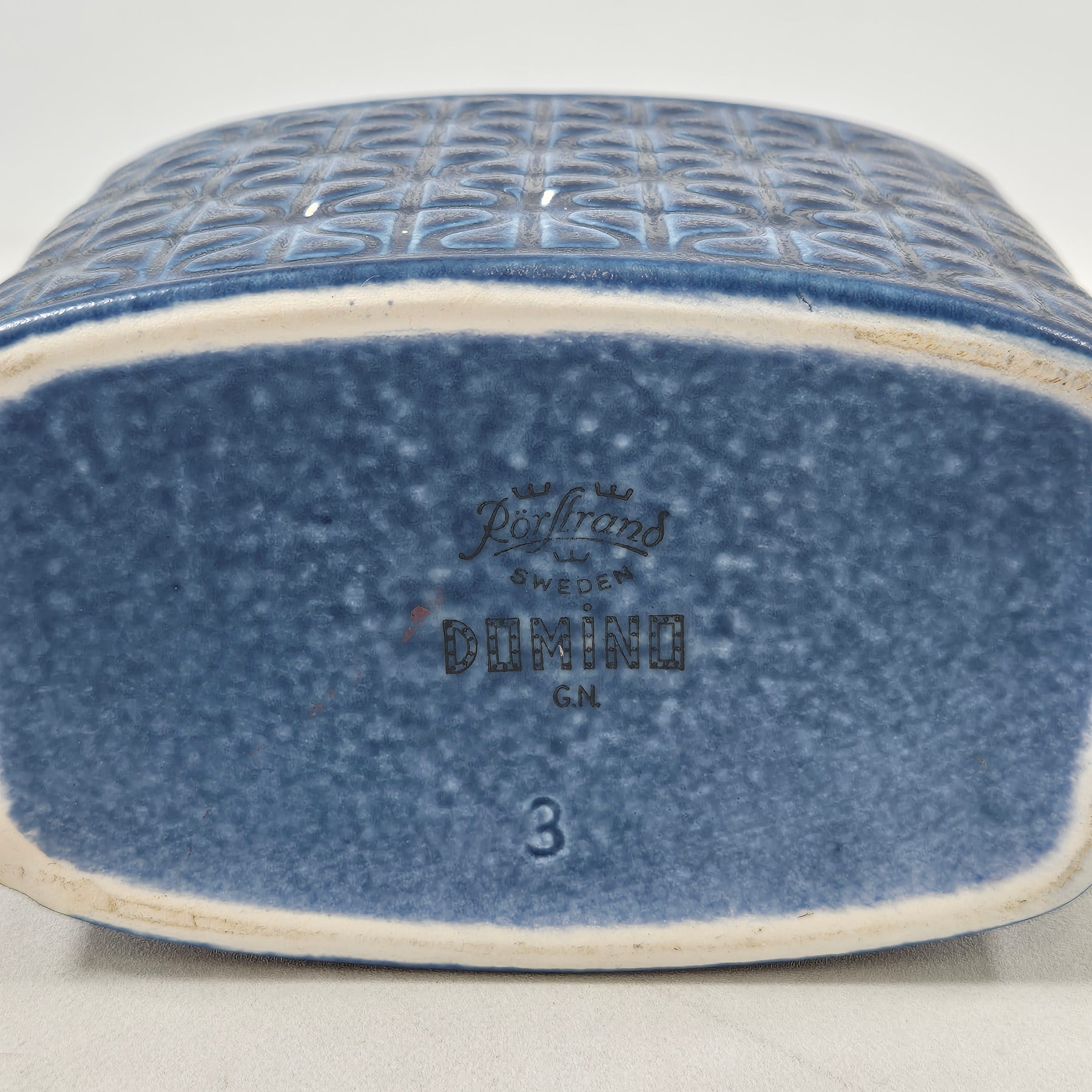 Denna dekorativa vas är en del av "Domino" serien designad av Gunnar Nylund för Rörstrand. Den kännetecknas av sin djupblå färg och unika texturerade yta som ger ett distinkt och iögonfallande utseende. Vasen är inte bara ett vackert konsthantverk utan också en praktisk inredningsdetalj för alla som uppskattar svensk design. Den är begagnad men i mycket gott skick, vilket gör den till ett perfekt köp för både samlare och de som vill tillföra en retrokänsla till hemmet.Produktspecifikationer