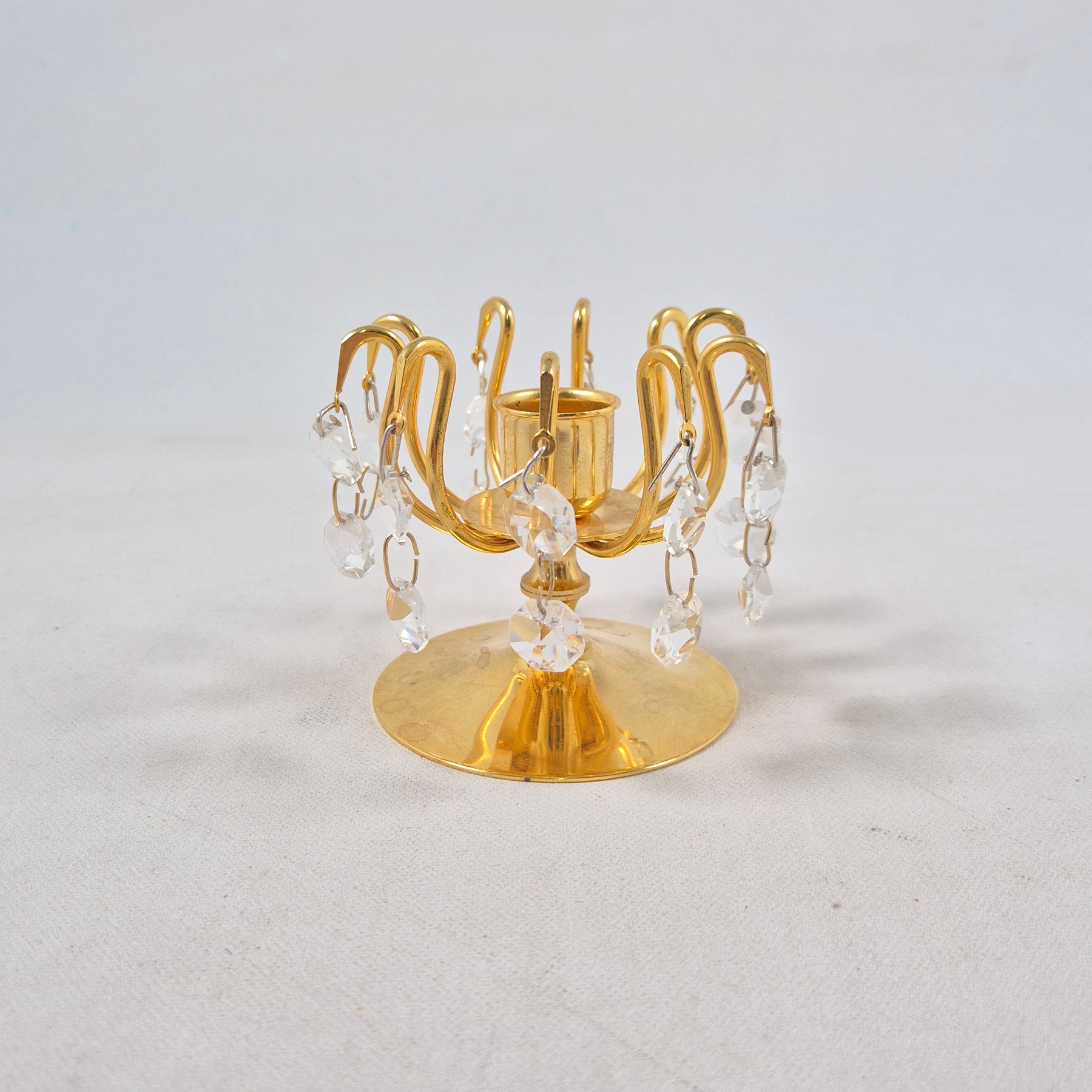 Denna ljusstake i guld med hängande kristaller kombinerar klassisk estetik med en hint av lyx, vilket gör den till ett idealiskt val för både daglig användning och festliga tillfällen. Den är tillverkad för att hålla standardljus och kommer att kasta ett vackert ljus i ditt vardagsrum eller på middagsbordet. Ett måste för den som älskar heminredning med en känsla av klassisk elegans. Produkten är begagnad men i mycket gott skick, vilket gör den till ett hållbart och värdefullt köp.Produktspecifikationer