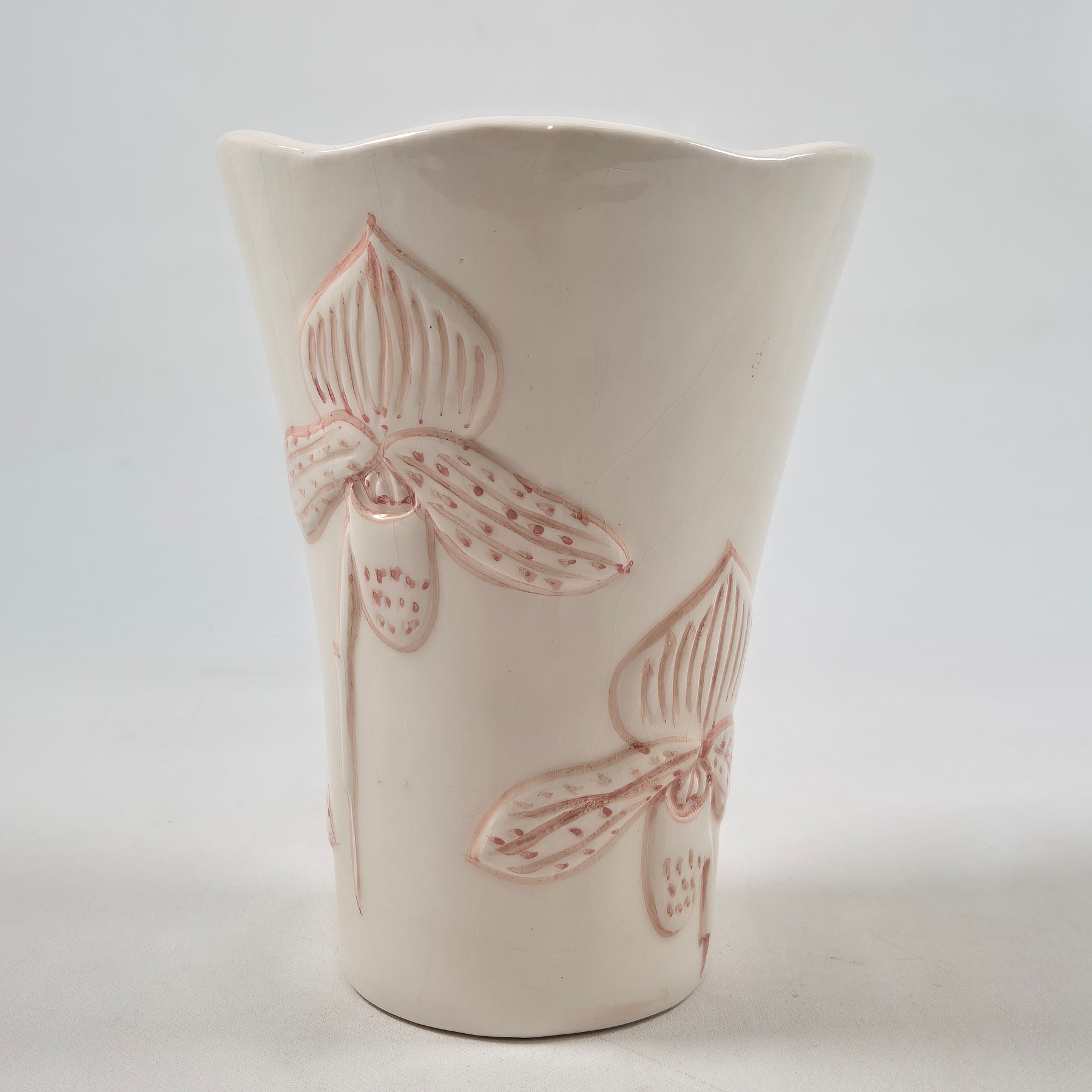 Denna vackra vas är ett perfekt exempel på retrodesign kombinerat med modern funktionalitet. Vackert detaljerade orkidémönster i rosa relief ger ett unikt och ögonfångande utseende. Idealisk för att sätta en personlig prägel på din inredning eller som en uppskattad gåva. Vasen är begagnad men bibehåller ett mycket gott skick med endast minimala bruksspår.