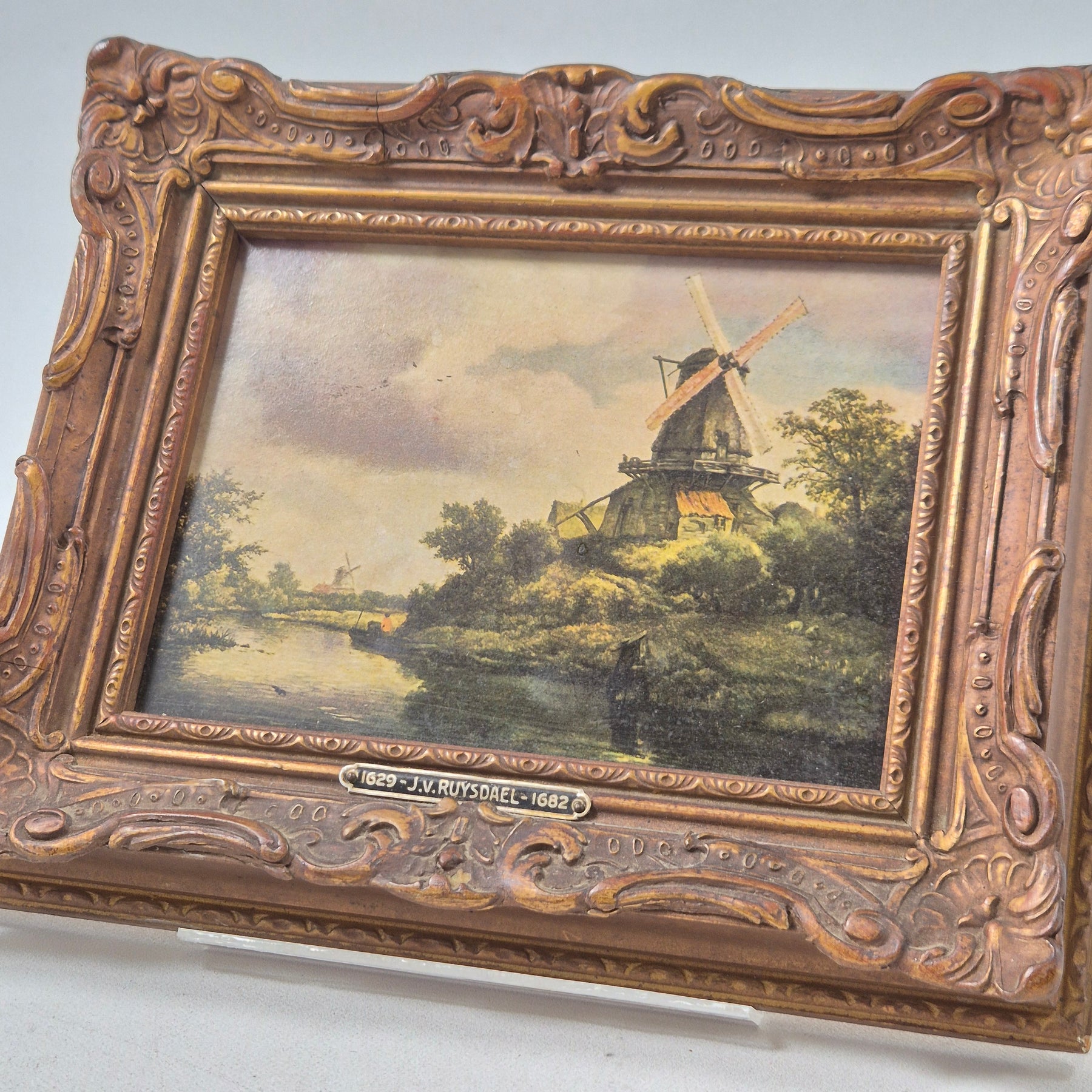 Denna oljemålning föreställande en rustik väderkvarn i landskap, är inramad i en utsökt antik ram som förstärker dess historiska värde. Ramen och målningen tillsammans skapar en tidsenlig aura som är perfekt för att berika ditt hem med en känsla av tidigare tider. Verket är signerat 'J. Ruysdael 1622', vilket tillägger en kulturell och samlarvärdig prestige. Tavlan är begagnad men har behållit sitt mycket goda skick genom åren, en verklig skatt för konstälskare.
