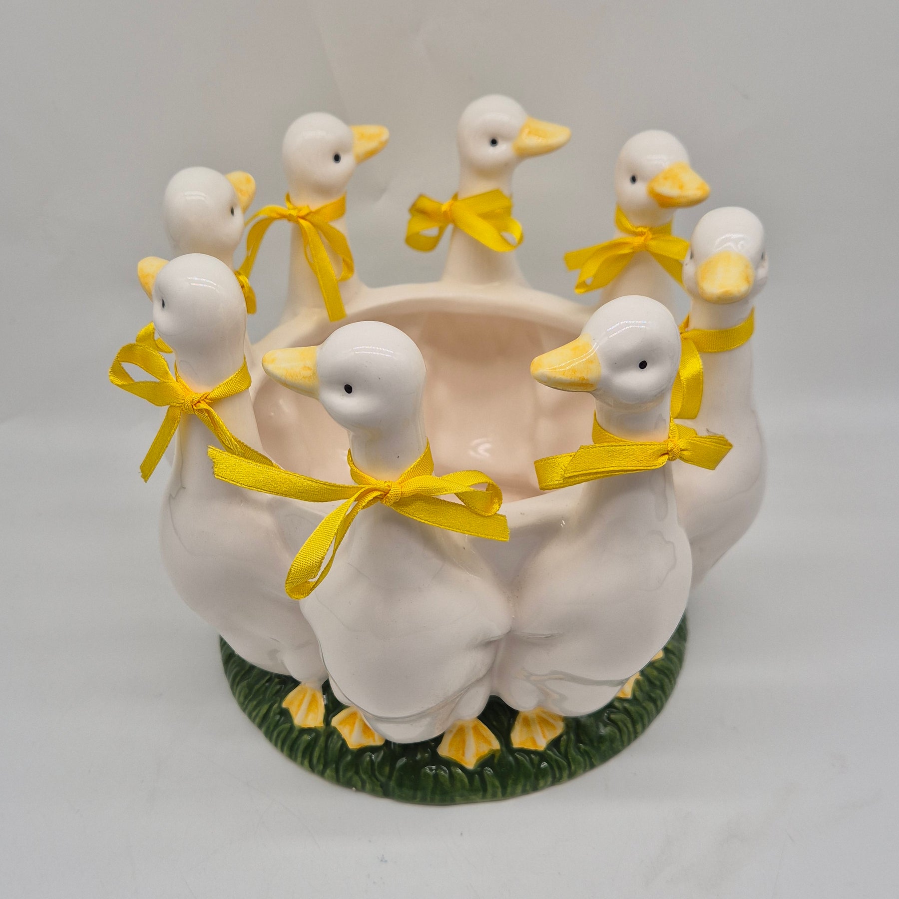 En charmig och pittoresk porslinsvas med ankor, dekorerad med eleganta gula rosetter.