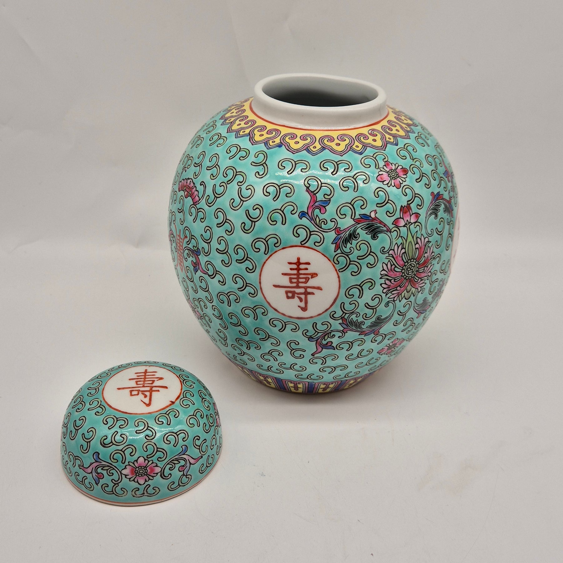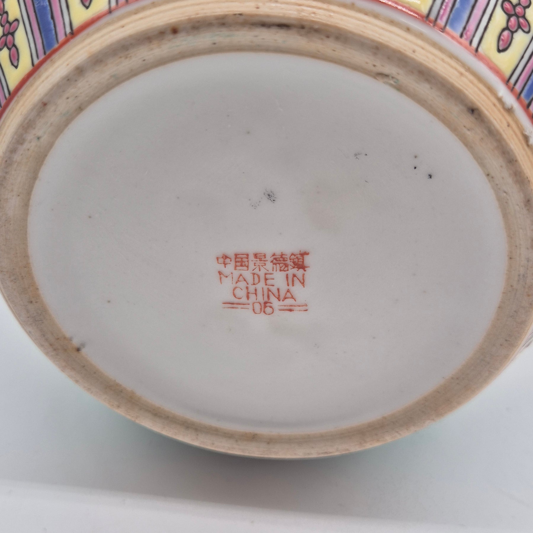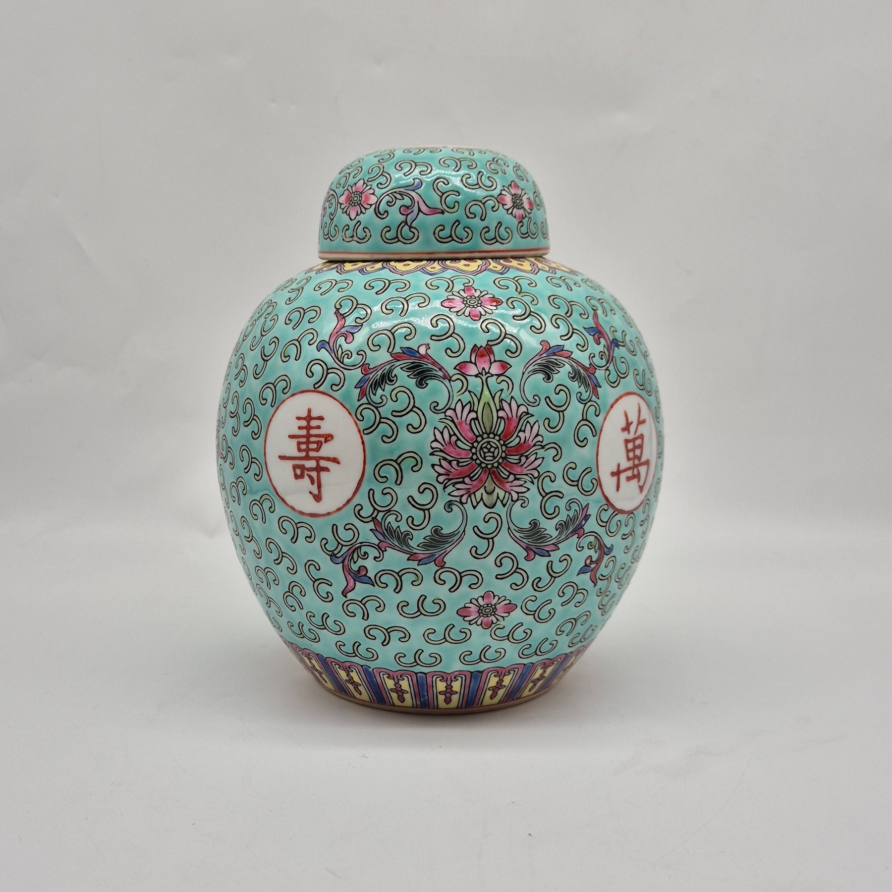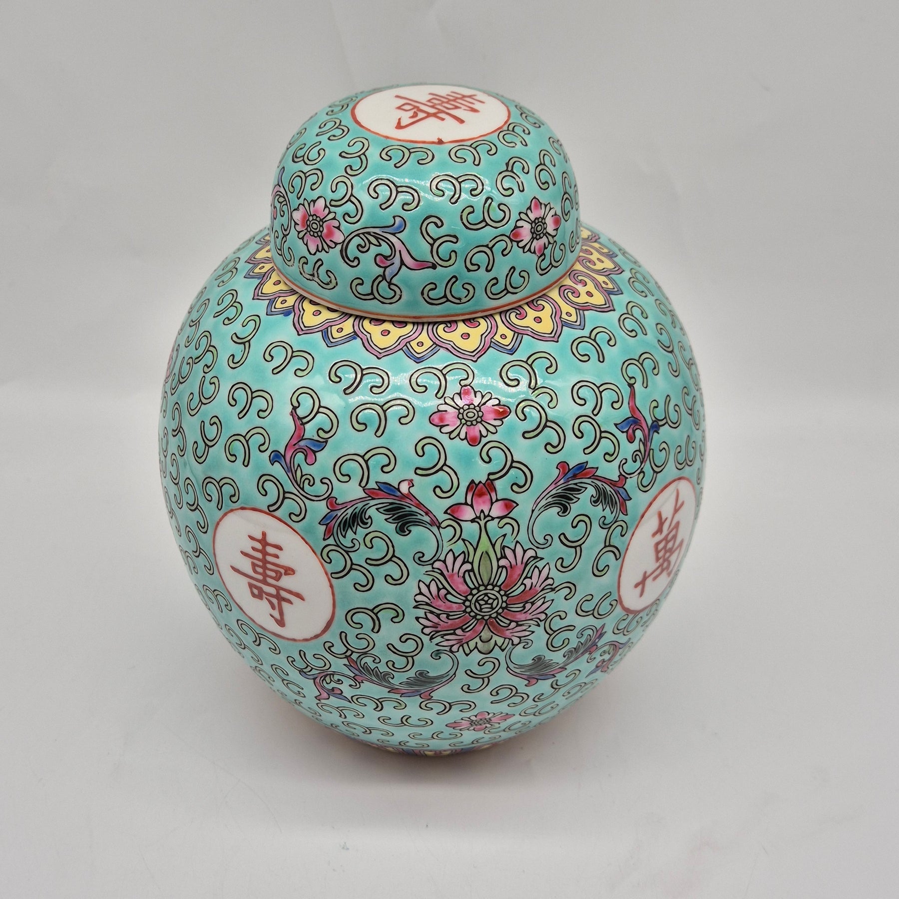Denna utsökta vas är tillverkad i Kina, som framgår av märkningen på dess botten. Den är rikt dekorerad med traditionella kinesiska mönster och symboler som för tankarna till österländsk konst och kultur. Vackra blommotiv i levande färger mot en aquamarinblå bakgrund gör den till en iögonfallande inredningsdetalj. Väldigt välbevarad och utan synliga skador, vilket gör den till ett fantastiskt köp för både användning och utställning.
