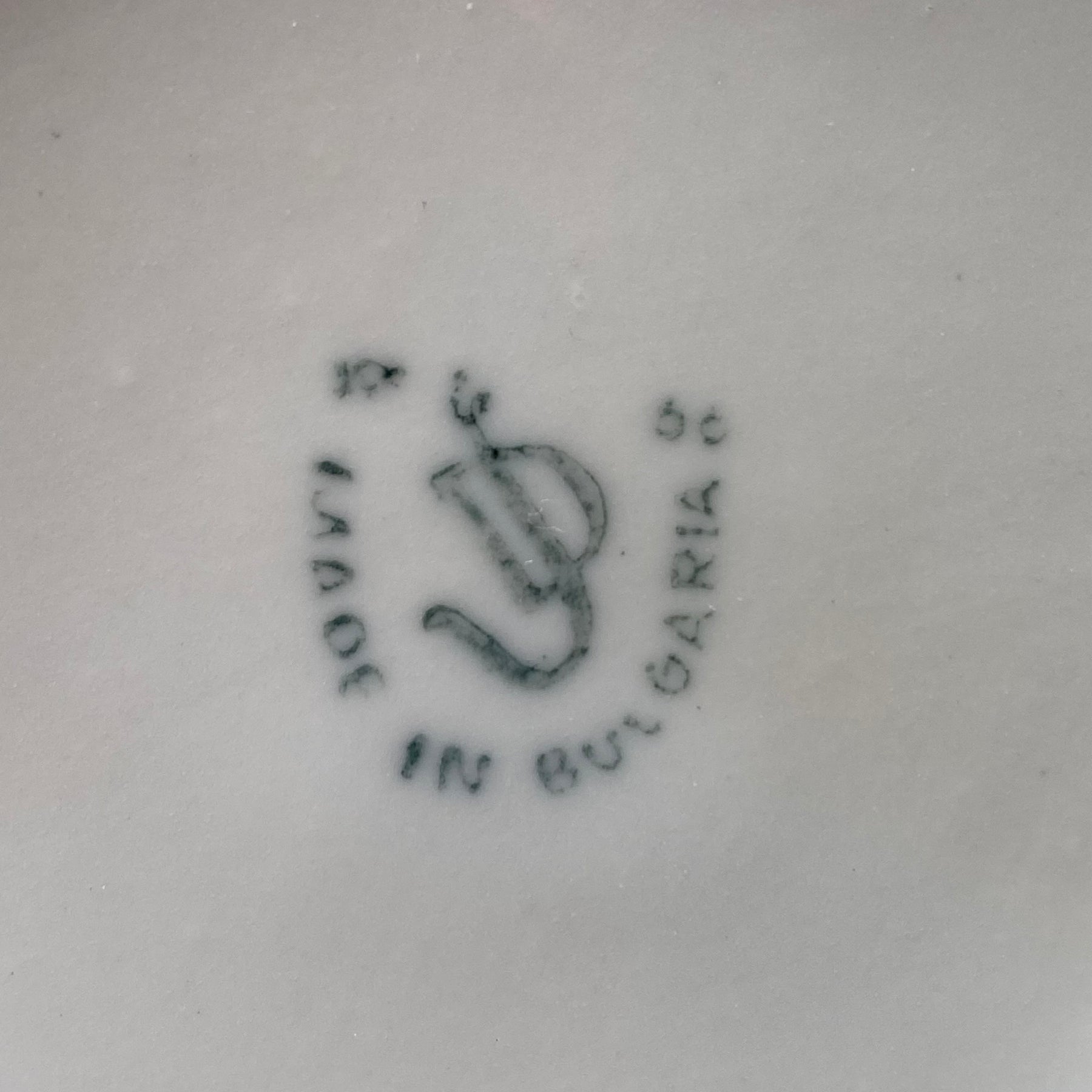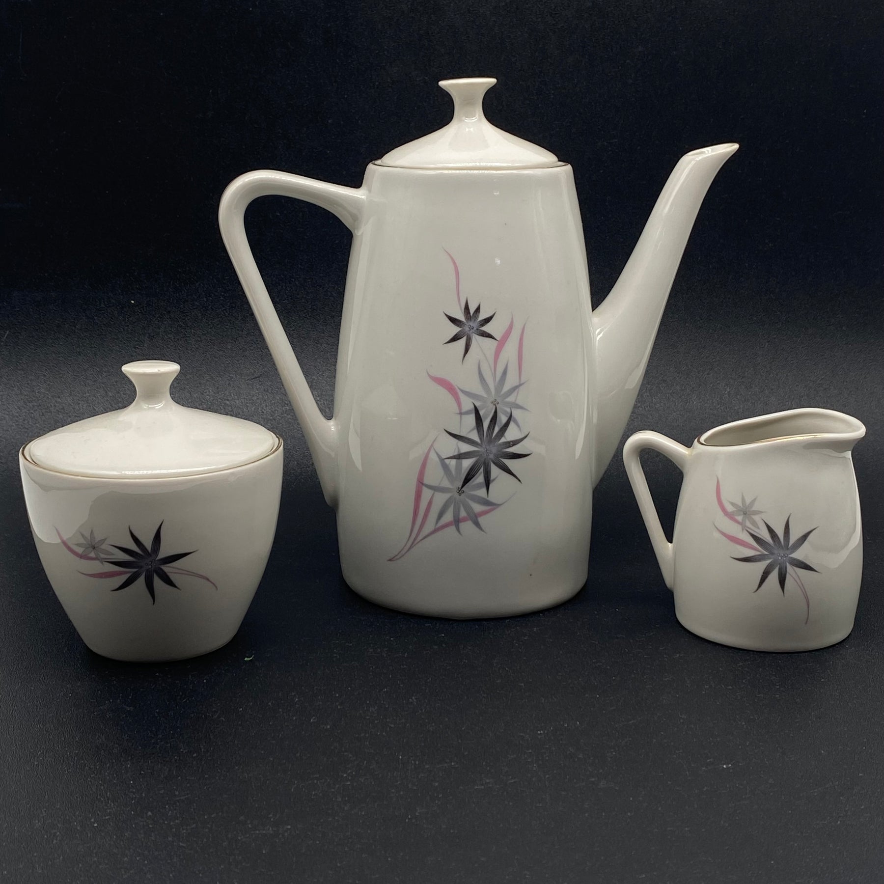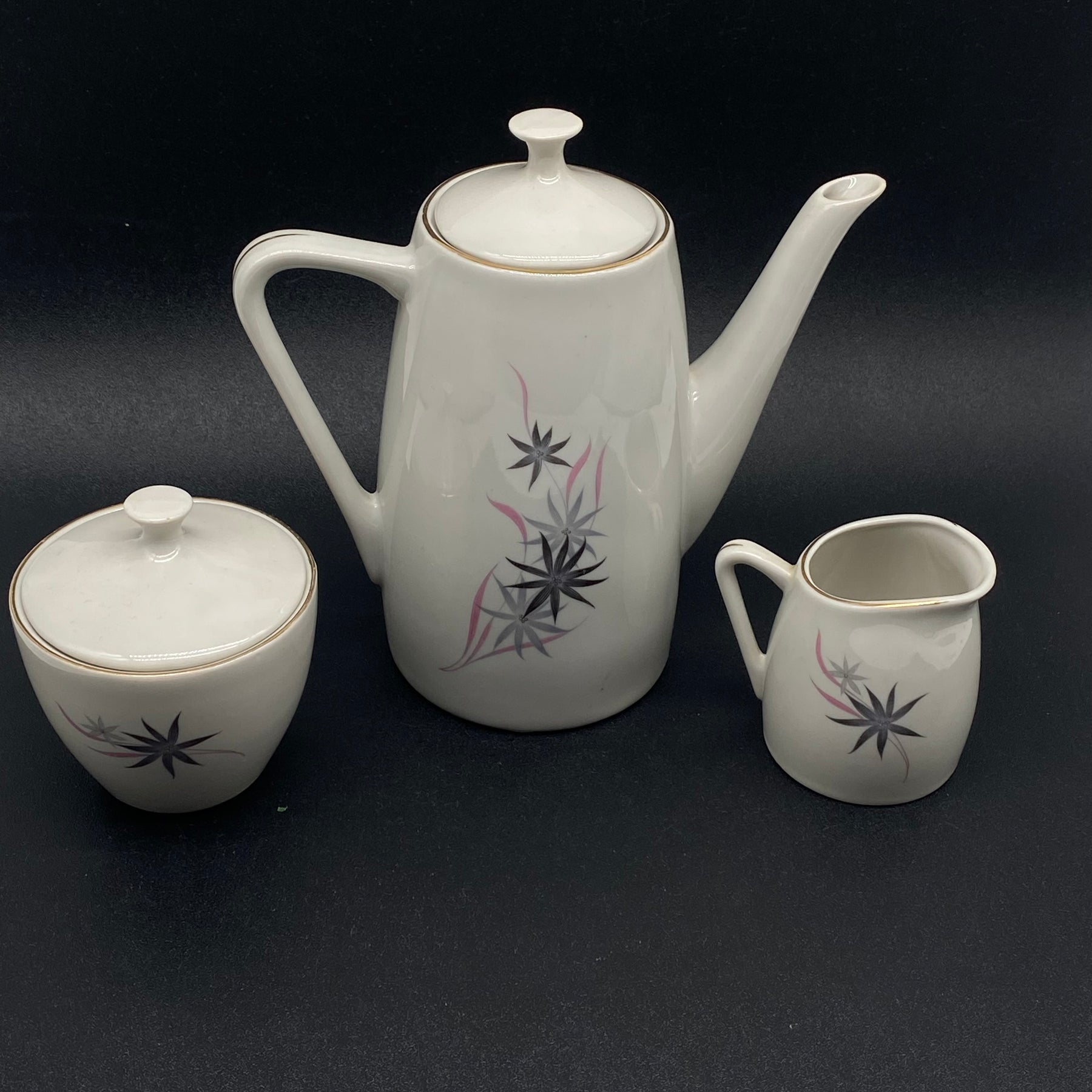 Denna charmiga set i porslin från Bulgarien inkluderar en tekanna, en mjölkkanna och en sockerskål, alla dekorerade med distinkta stjärnliknande mönster i svart och rosa. Varje del är tillverkad med en klassisk design som tillför en touch av sofistikation till tebjudningen. Setet är begagnat men i mycket gott skick, vilket gör det till ett utmärkt tillägg i alla hem eller som en åtråvärd del av en porslinssamling.