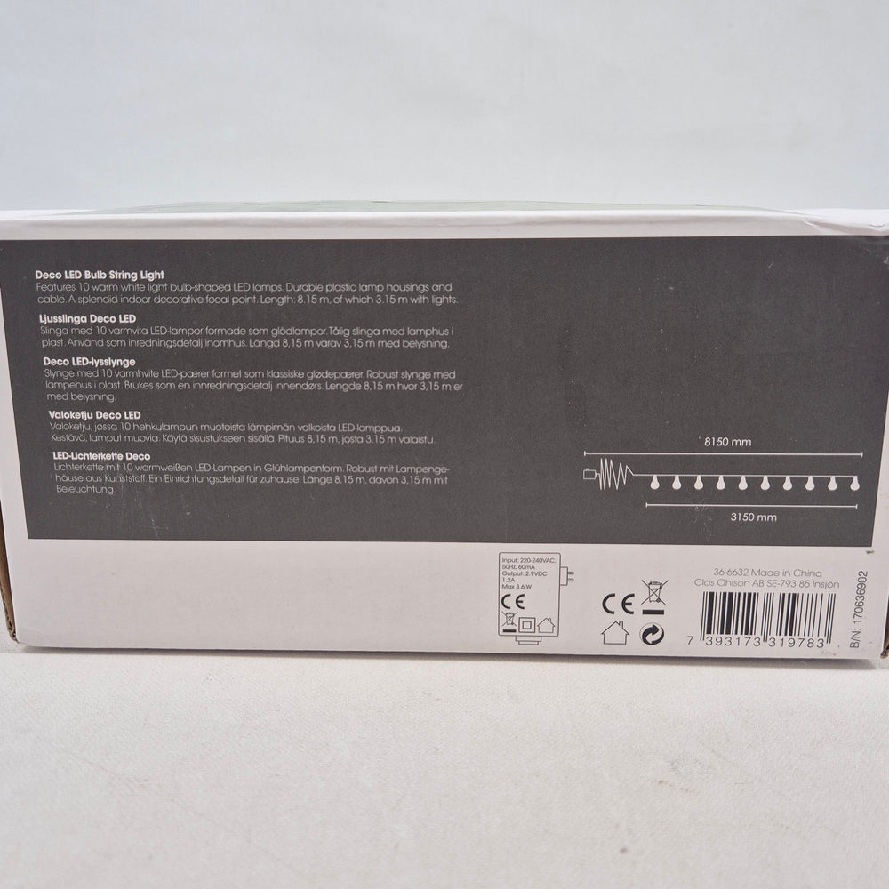Denna ljusslinga erbjuder 10 LED-lampor som formar ett varmt vit sken, perfekt för både inomhus- och utomhusbruk. Den robusta konstruktionen med plasthöljen gör den till ett hållbart val för din trädgård eller balkong. Bredd din emotsedda atmosfär med dessa glödlampeliknande lampor som lyser upp vilken miljö som helst och skapa en inbjudande känsla i ditt hem eller din trädgård. Produkten är ny i sin originalförpackning från tillverkaren.Produktspecifikationer