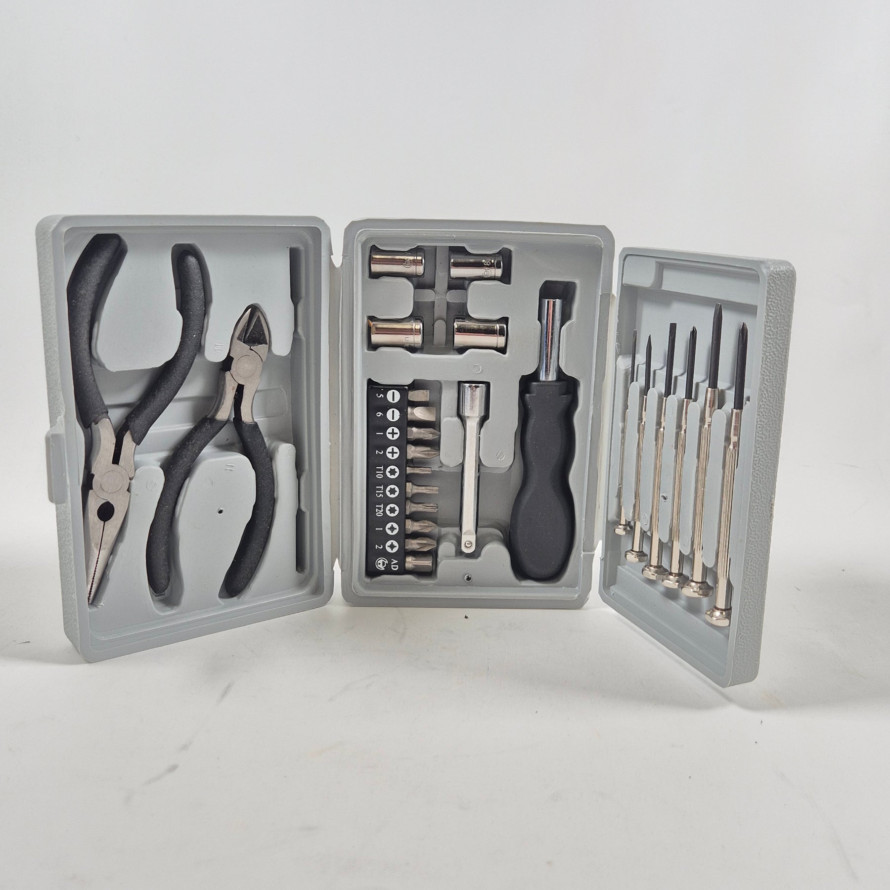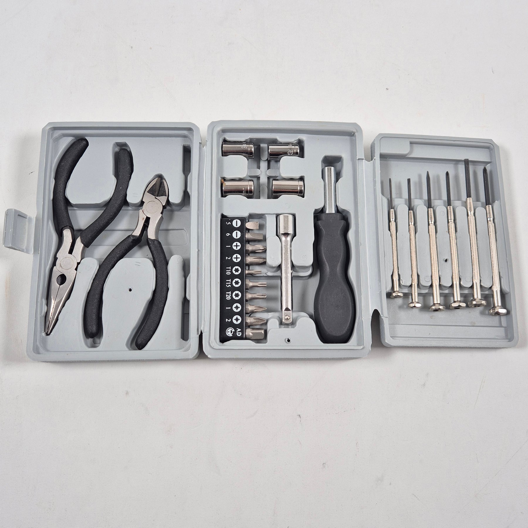Detta kompakt mini-verktygsset innehåller 26 delar allt från skruvmejslar till bits och en praktisk förlängningsadapter. Från det välkända märket Powerfix, är detta set idealiskt för både enkla hemreparationer och mer krävande projekt. Trots att förpackningen visar tecken på användning, är verktygen inuti i gott skick och redo att användas.