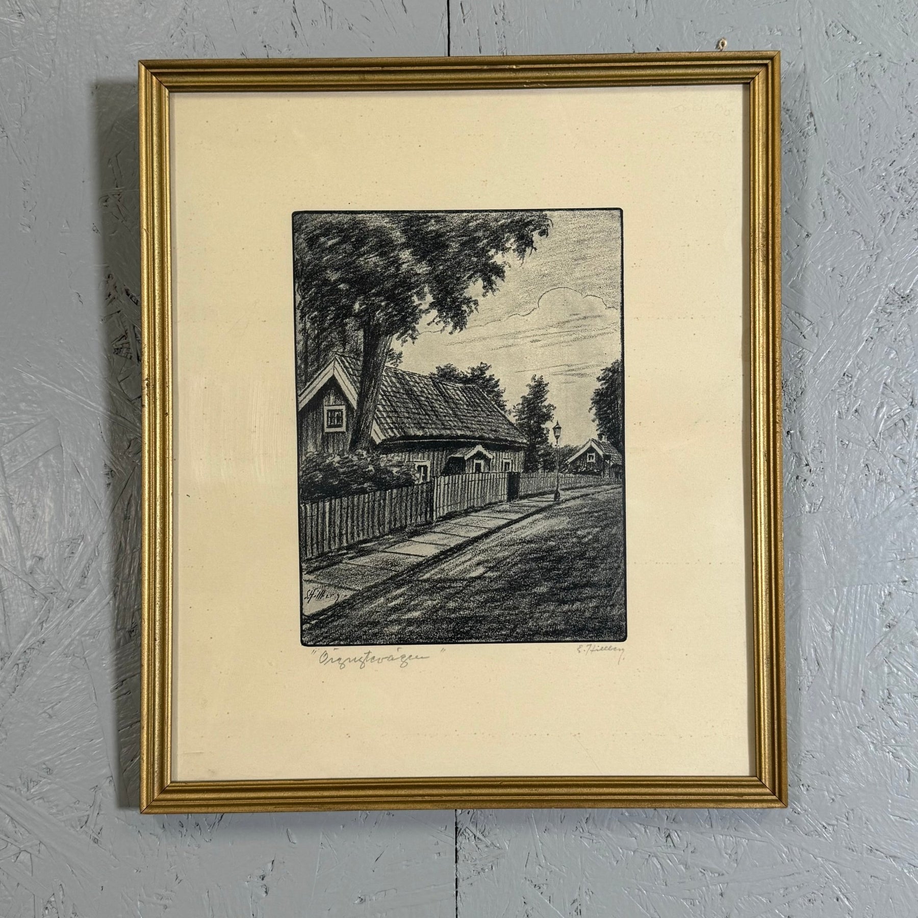 • Beskrivning: En detaljerad teckning föreställande ett gammalt hus med titeln “Åsgatan”, skapad av G. Karlberg. Inramad i en enkel, men elegant ram.