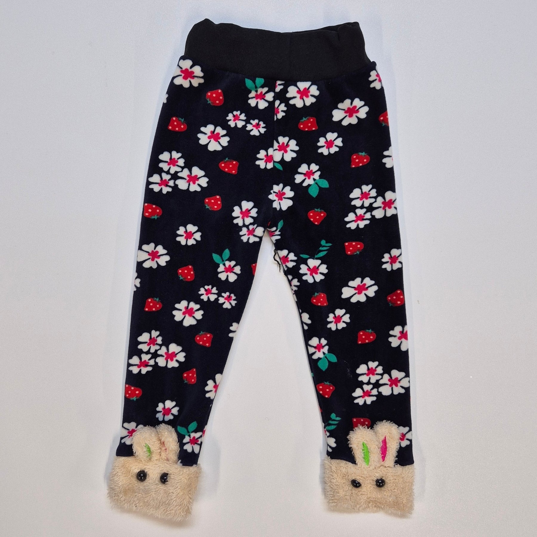 Dessa charmiga barnleggings är dekorerade med ett roligt jordgubbs- och blommönster, samt förtjusande kanindetaljer vid anklarna. Perfekta för vardagligt bruk, de är både bekväma och stiliga. Produkten är använd men i gott skick.